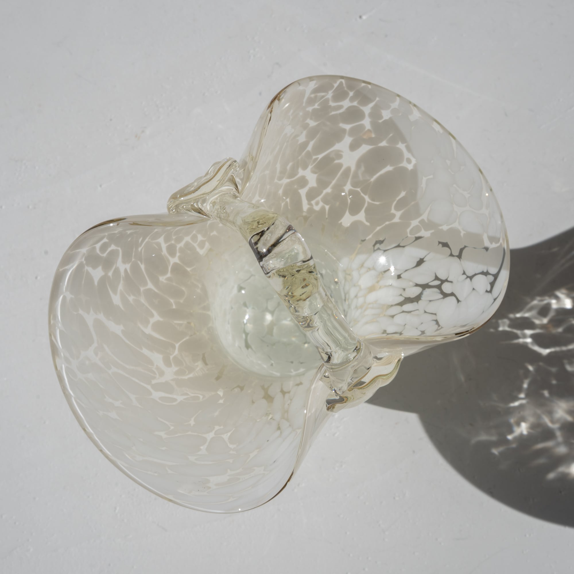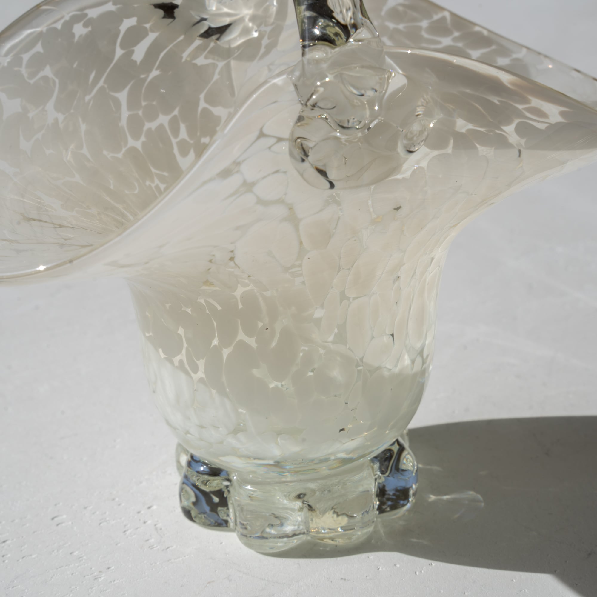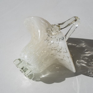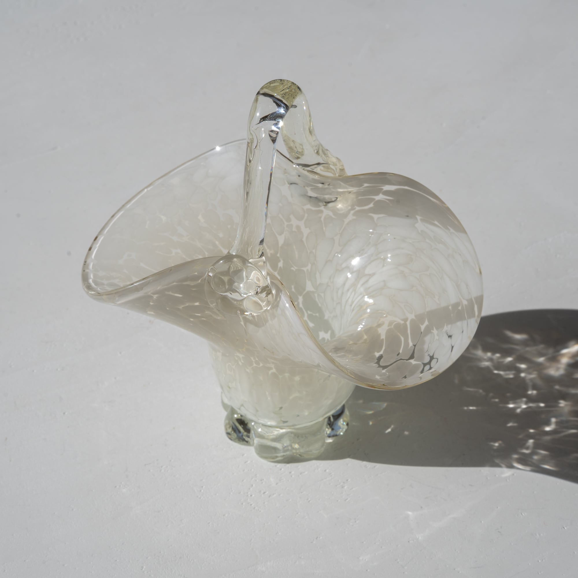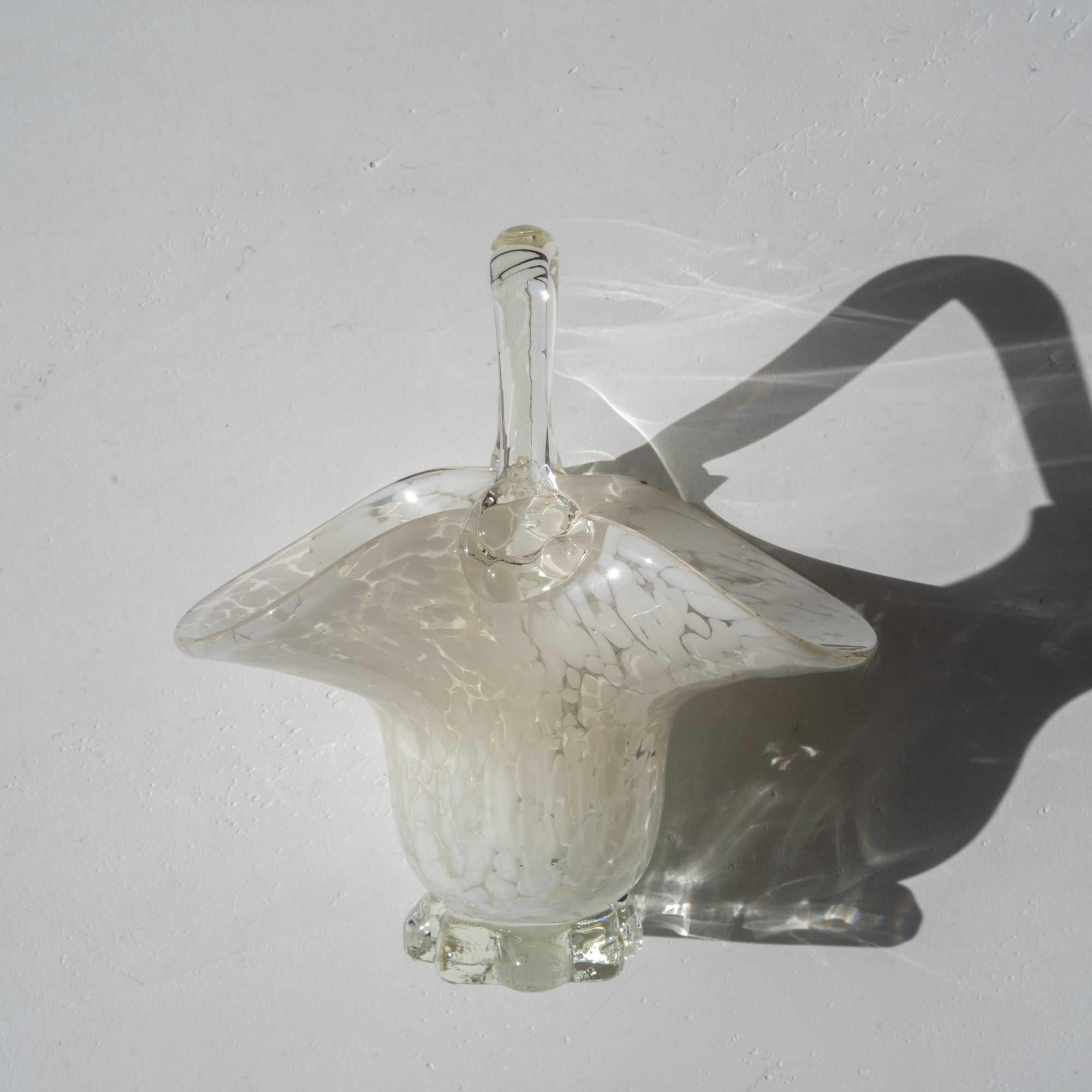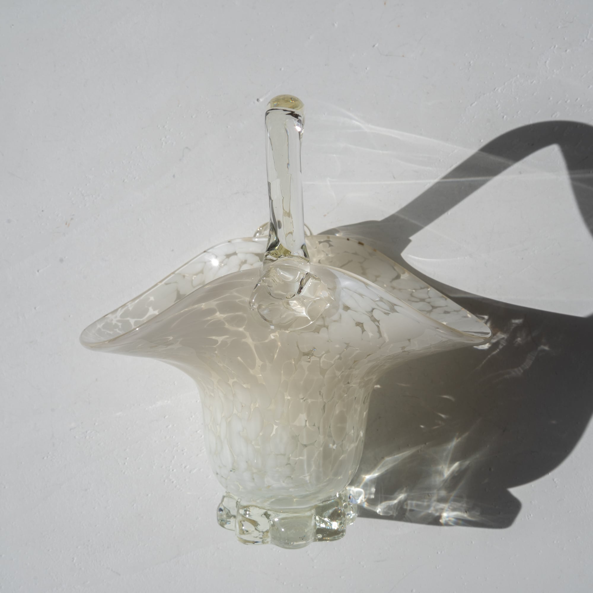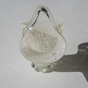 持ち手のついたバスケットモチーフで、ぽってりとしたクリアガラスは光が当たると美しく煌めきます。