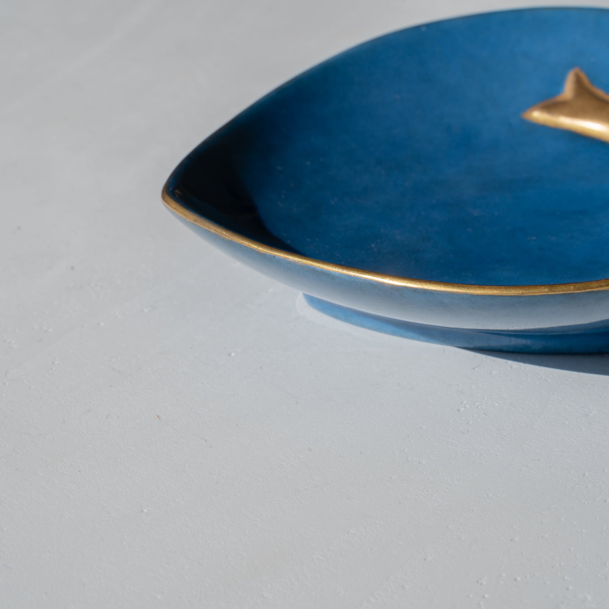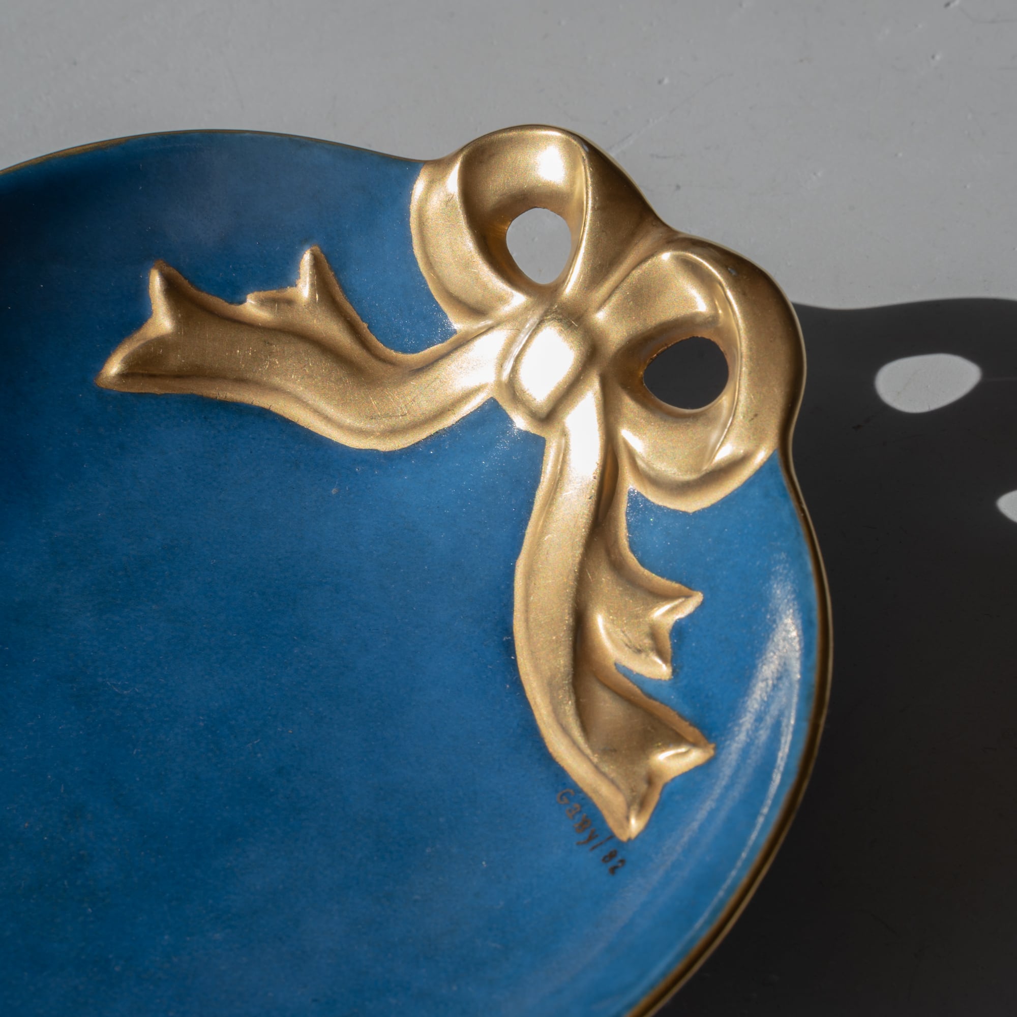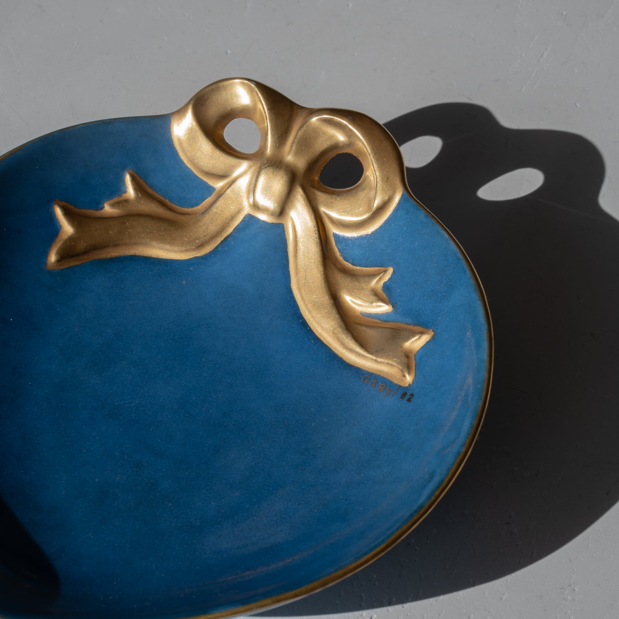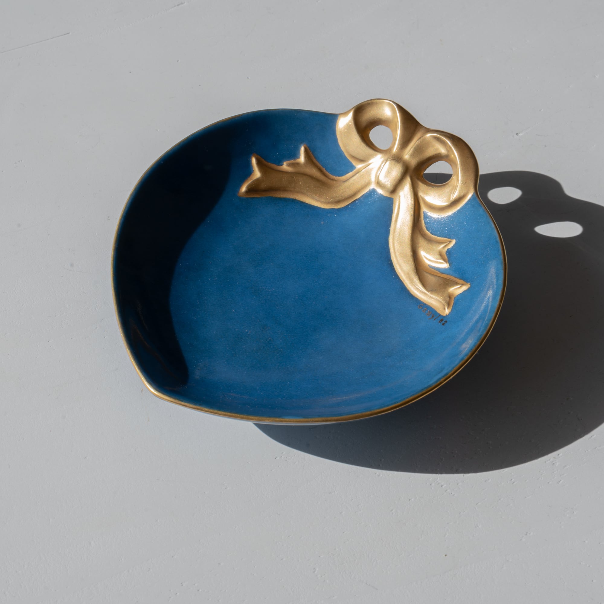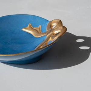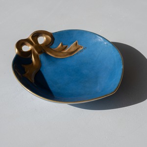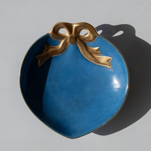 ハートのようなまるいフォルムに、ゴールドのリボンがかけられたデザイン。