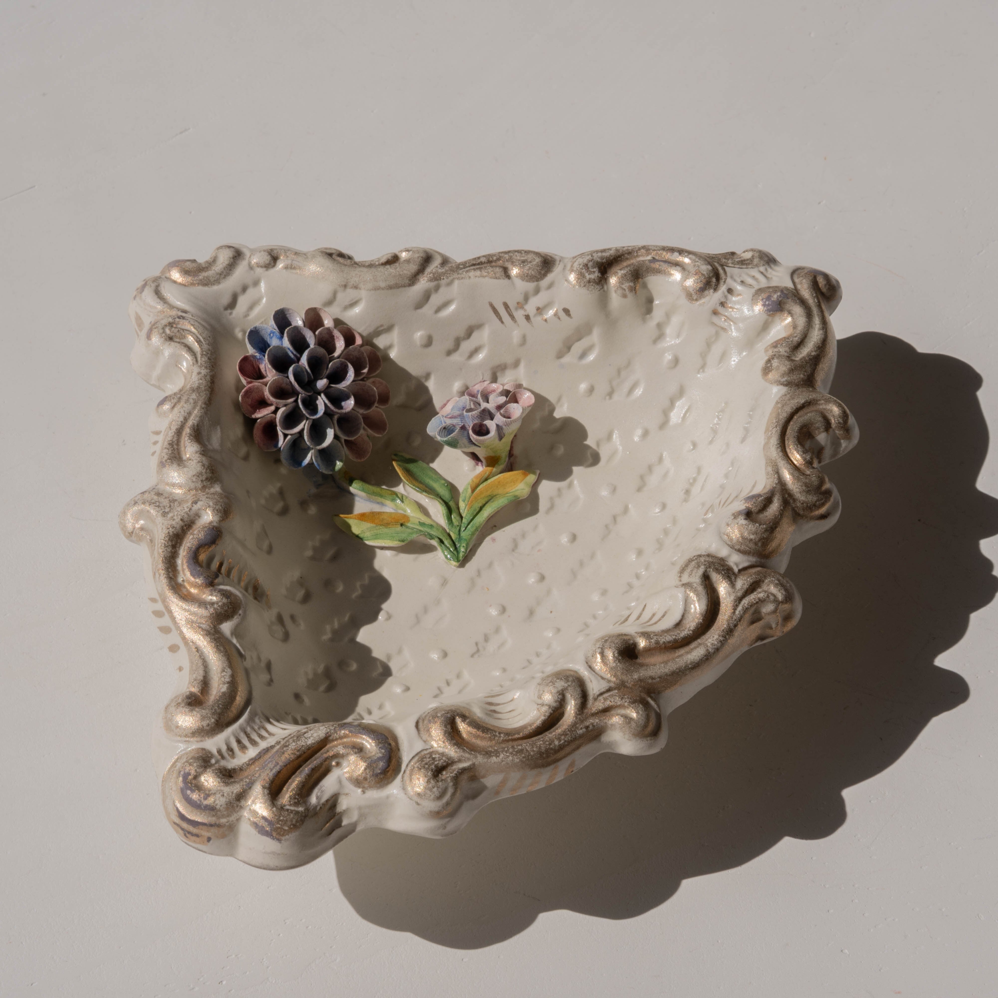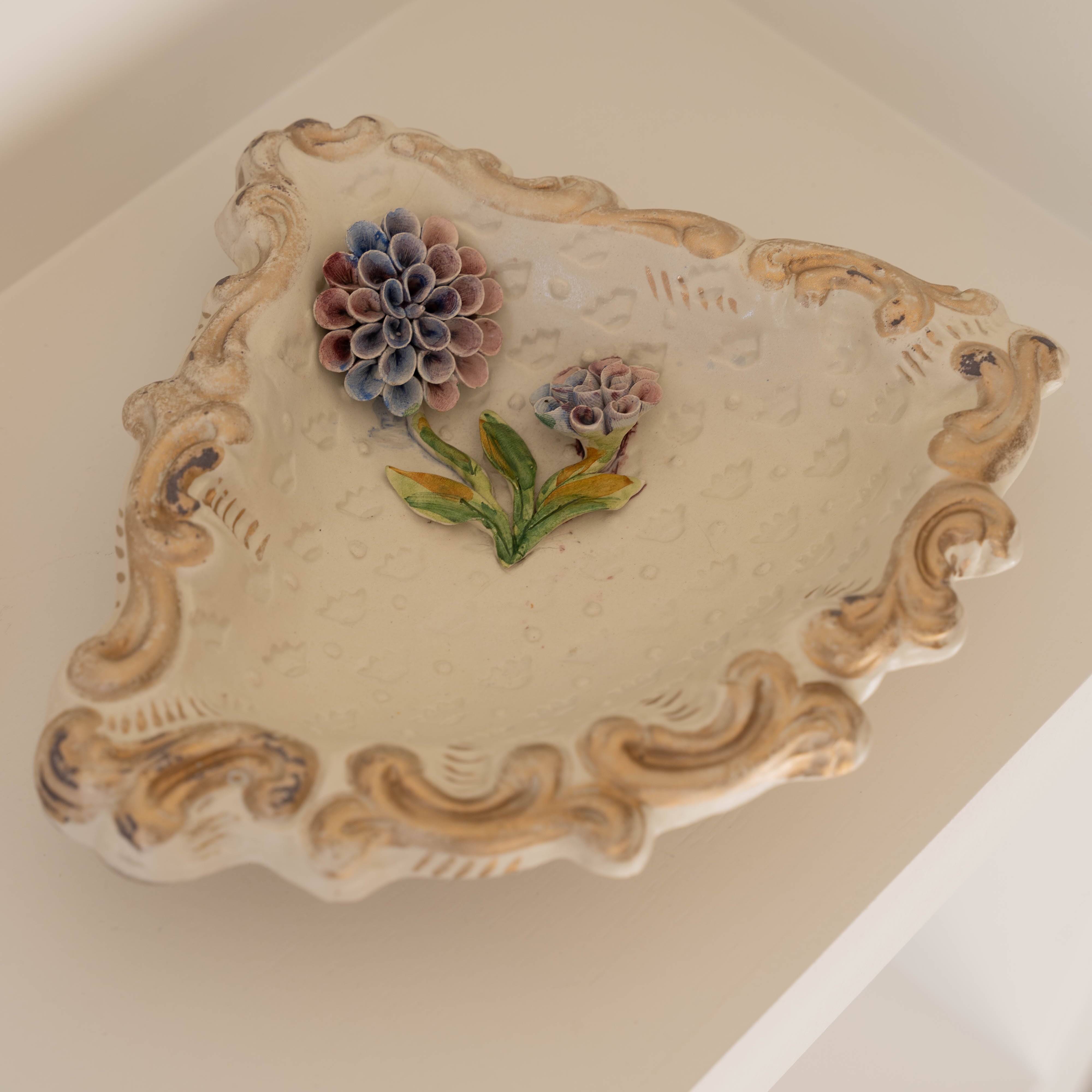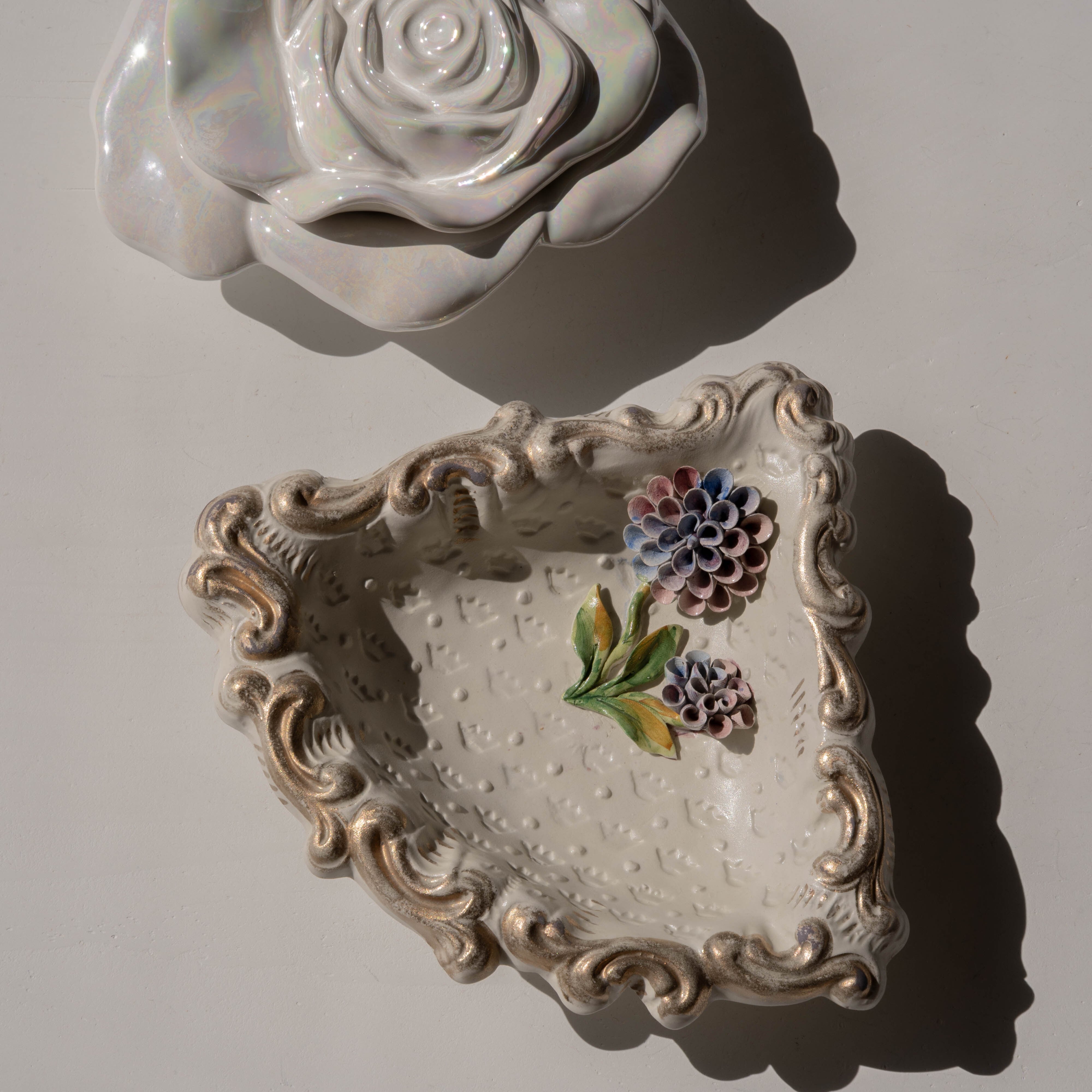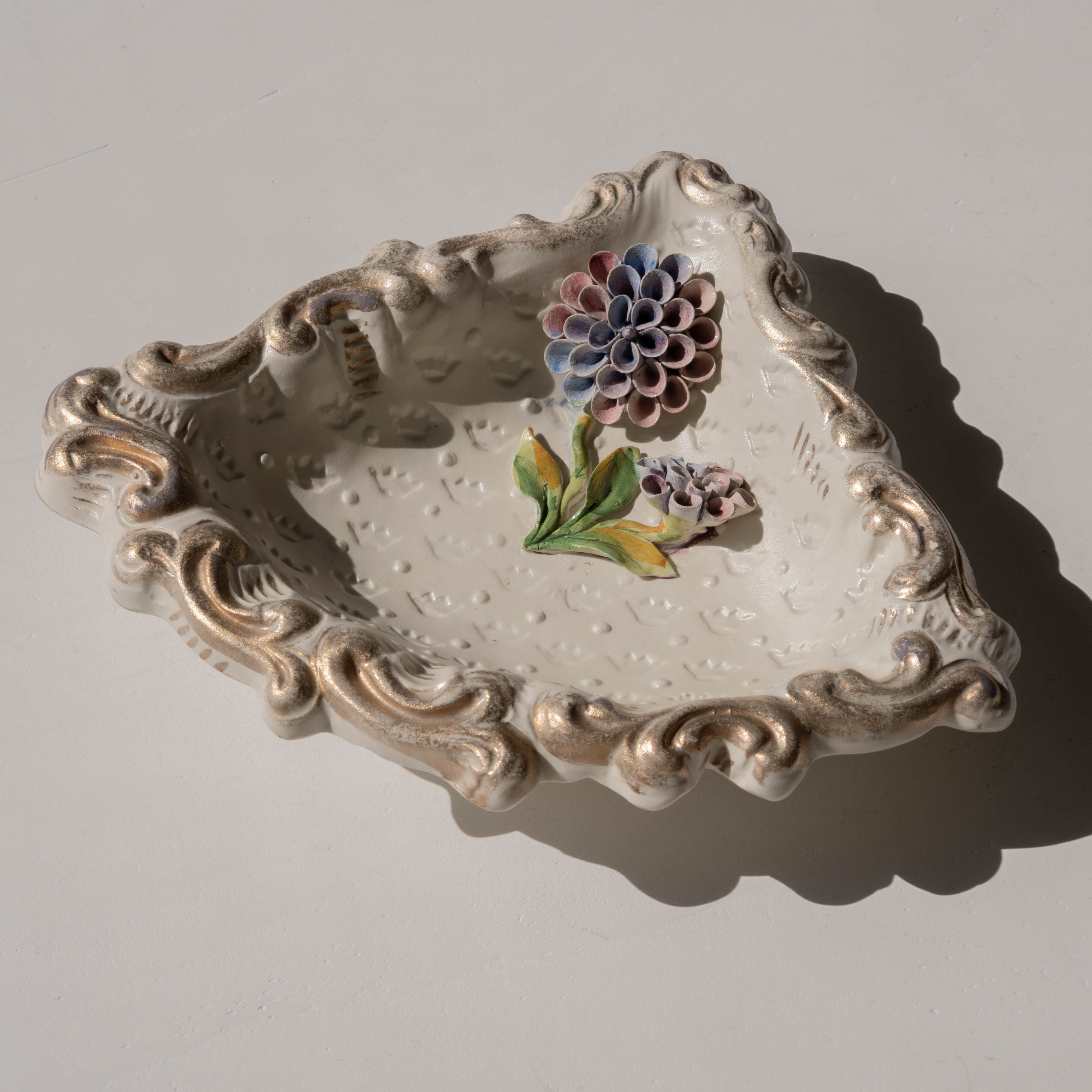 あたたかみのある陶器の味わいと、立体感のあるお花の装飾に魅了されるアイテム。