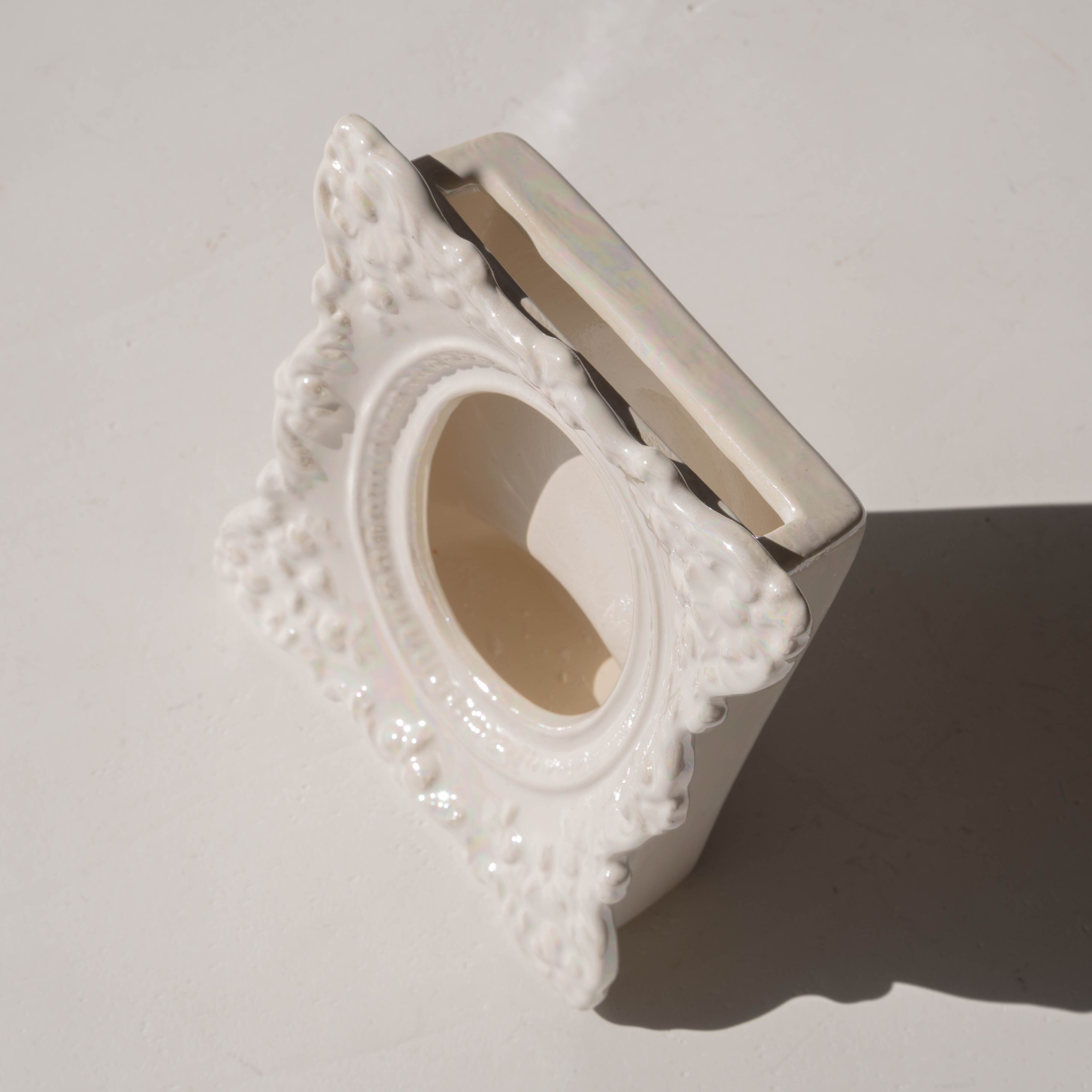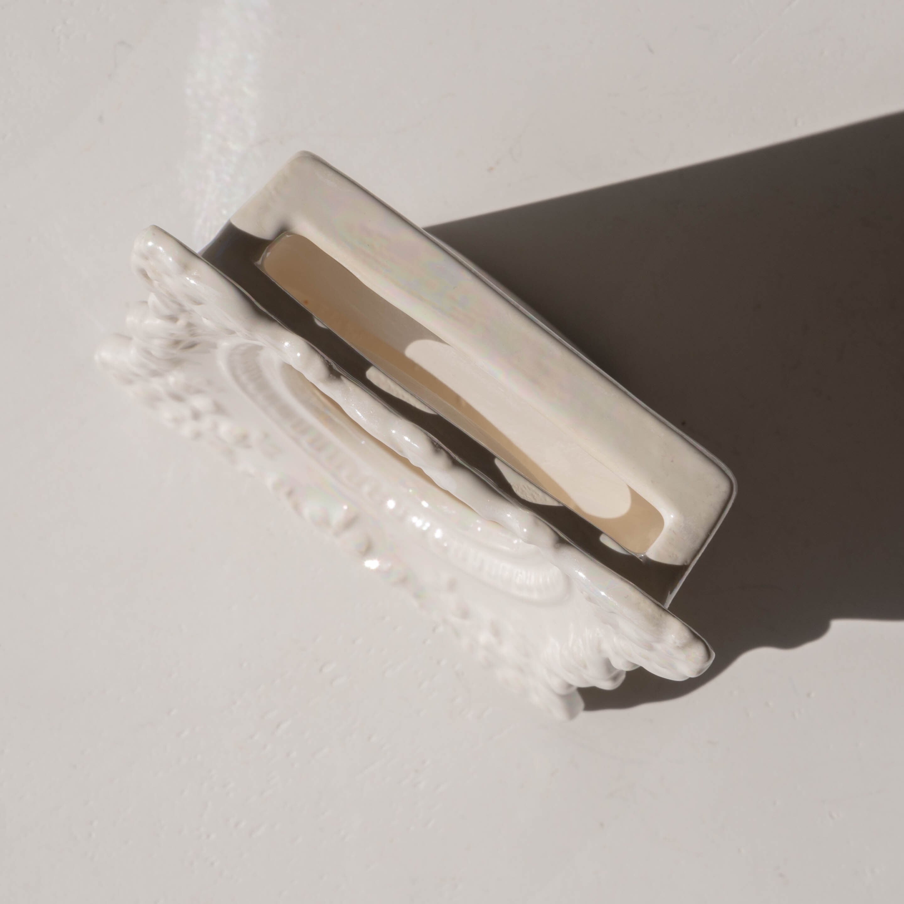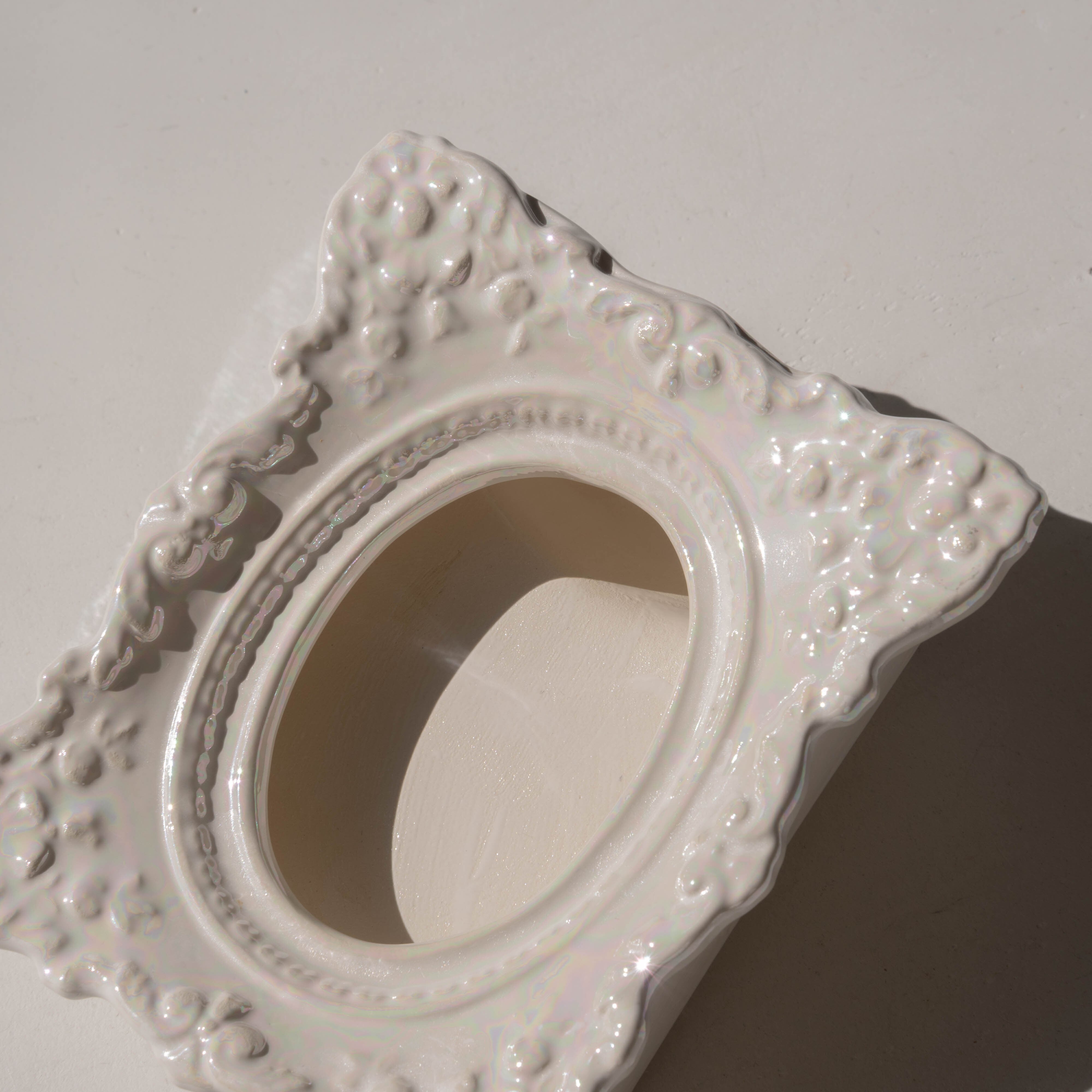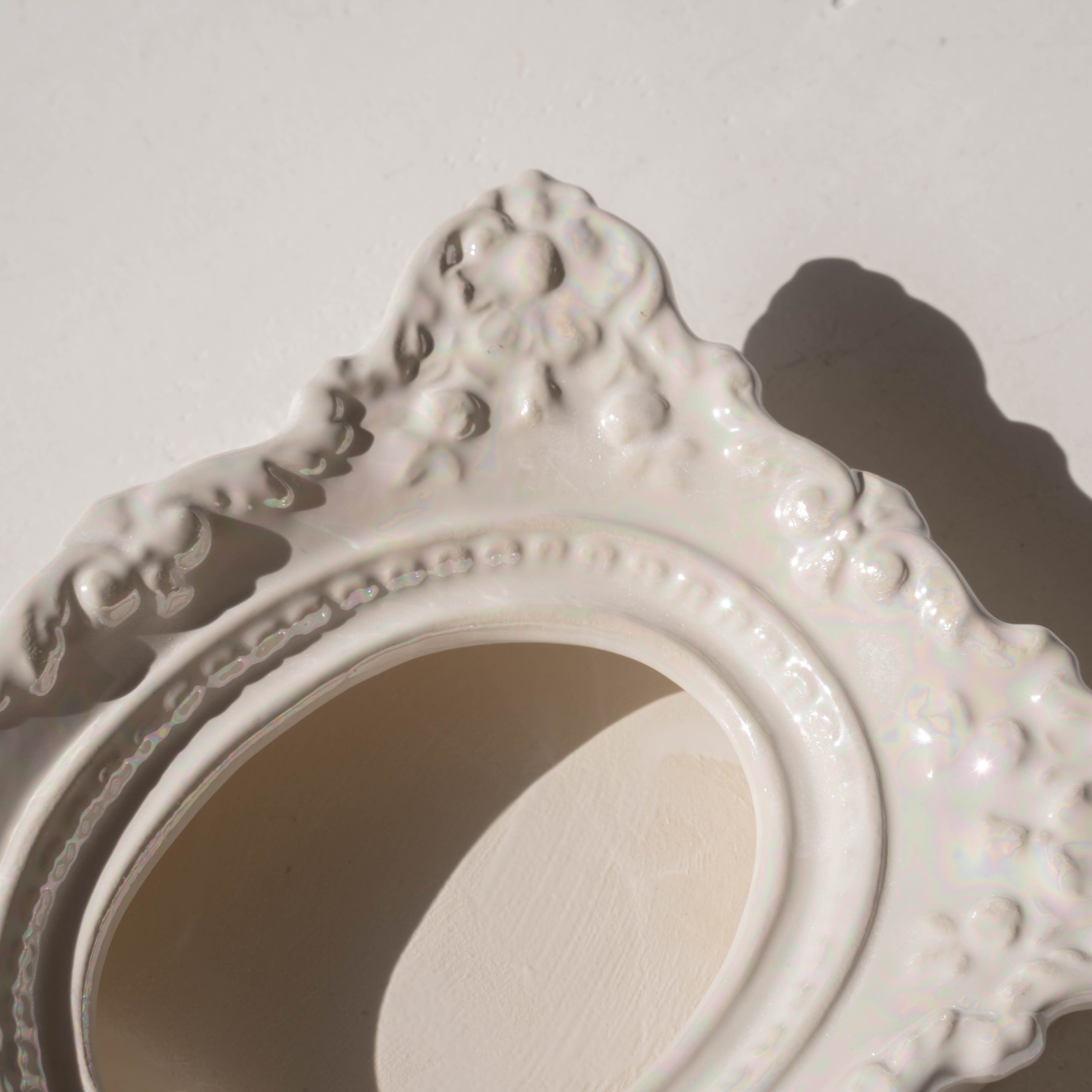 虹色に煌めくパール磁器で、細かな装飾まで陰影が美しい。
