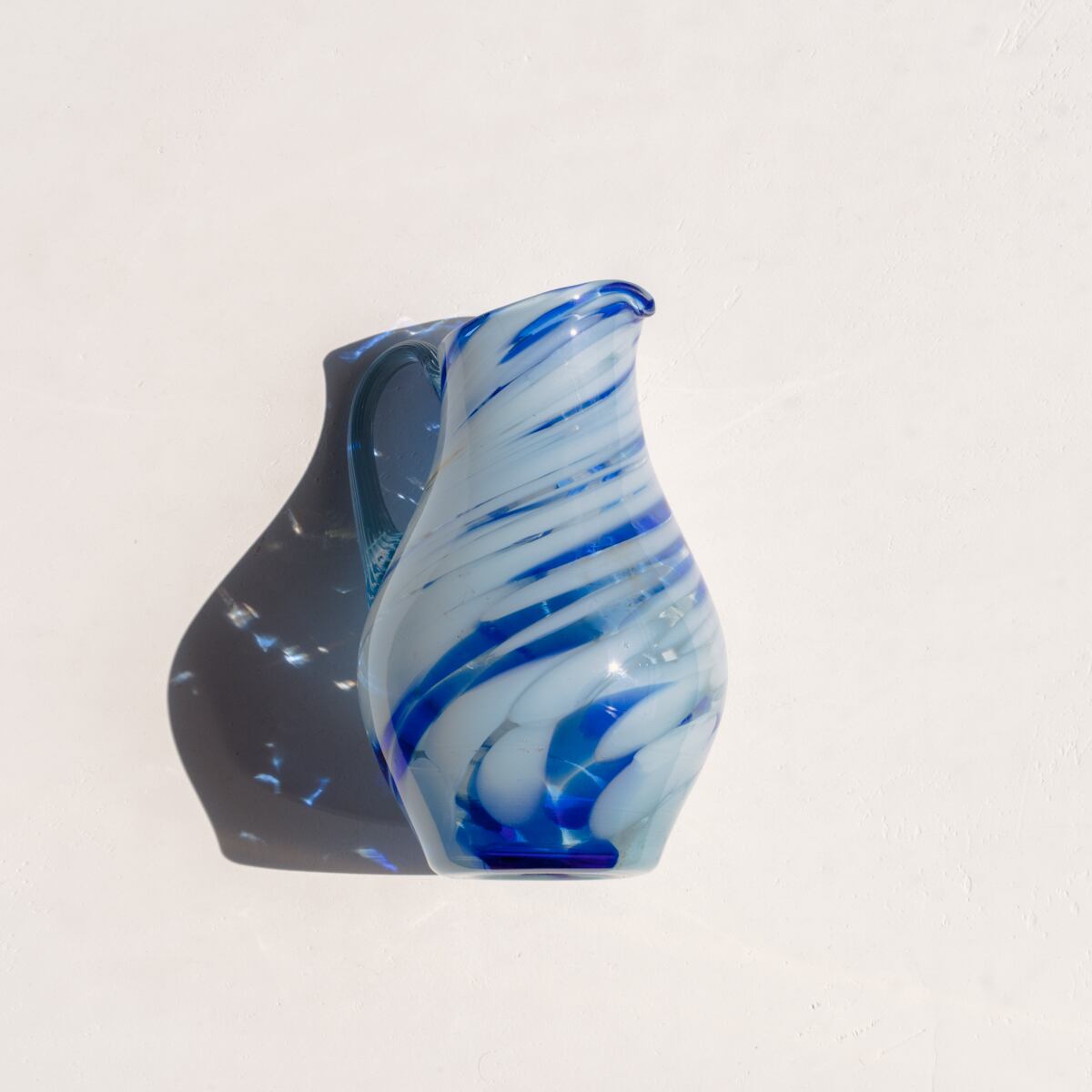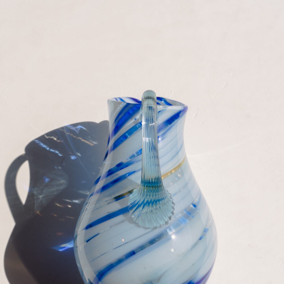 ブルーとホワイトの縞模様で装飾された中型サイズのガラスピッチャーです。