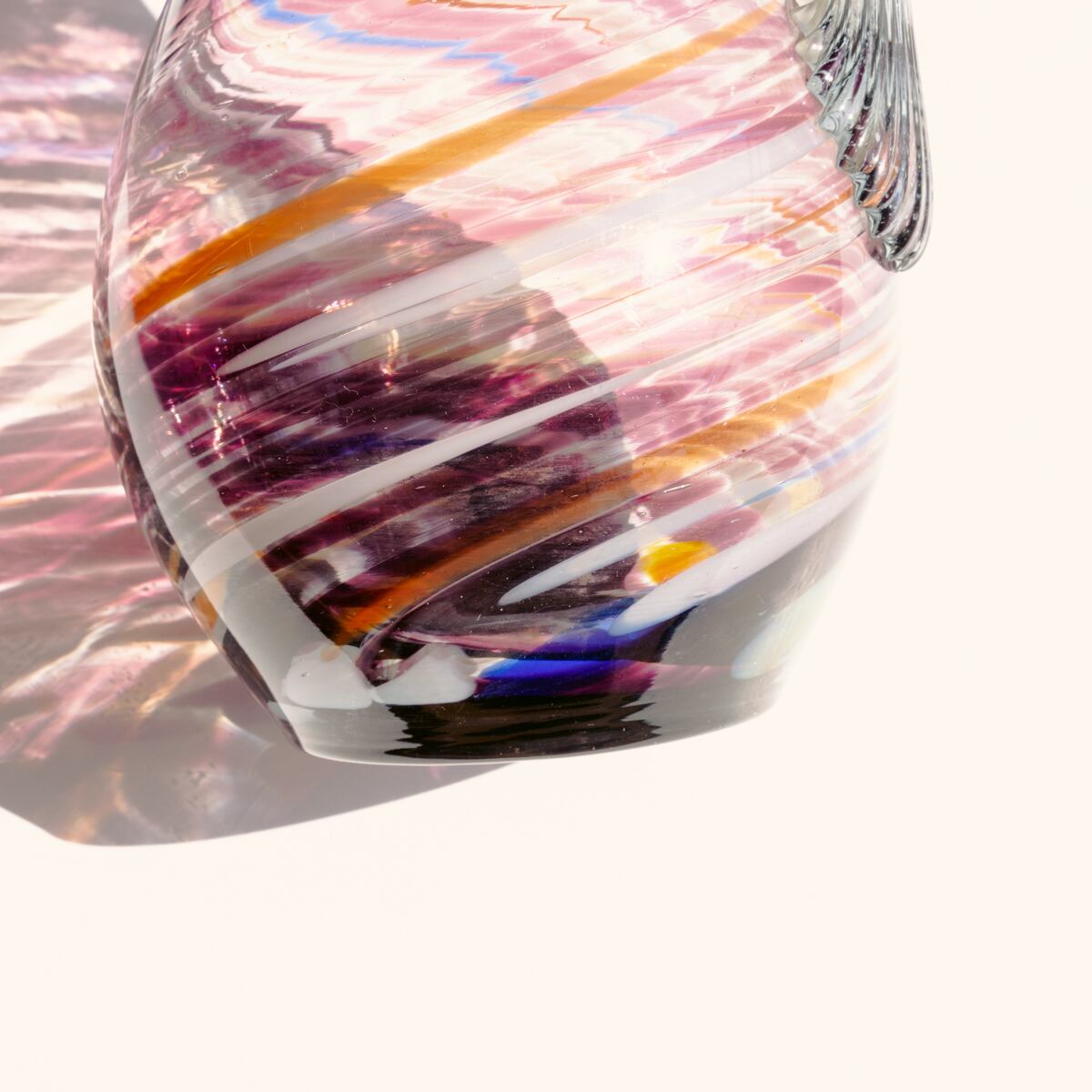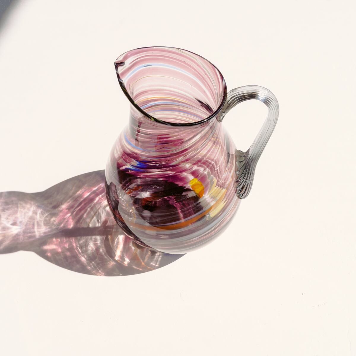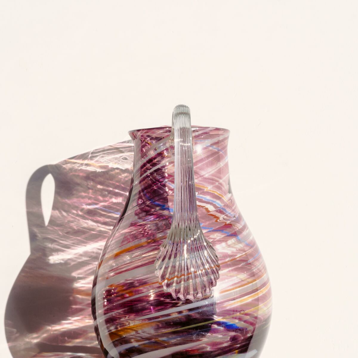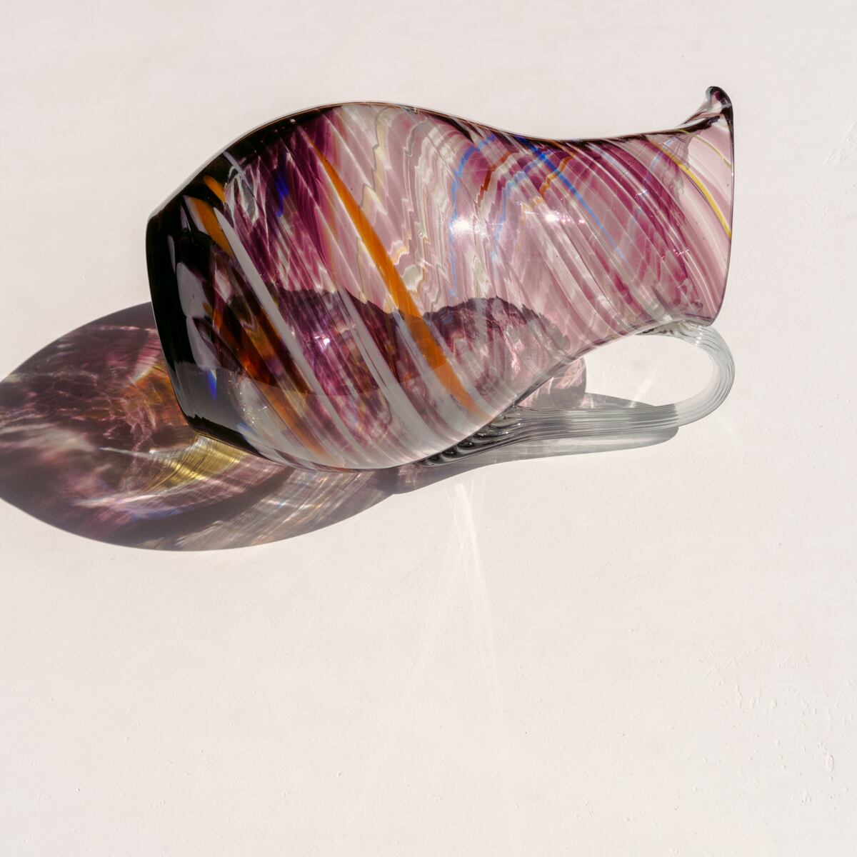 明るいパープル、オレンジ、ホワイト、ブルーの混じった縞模様で装飾された中型サイズのガラスピッチャーです。
