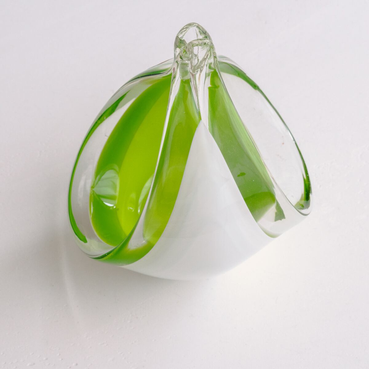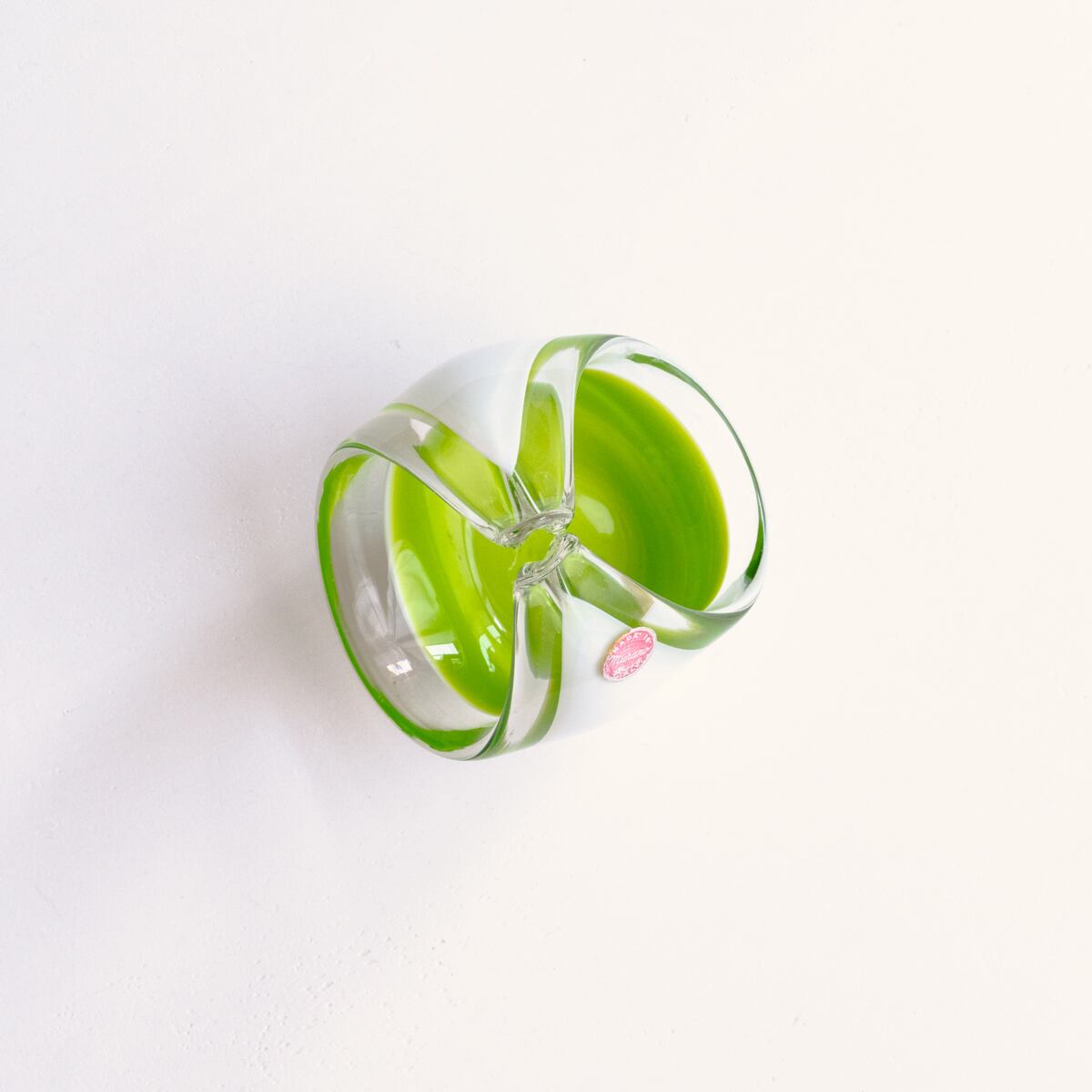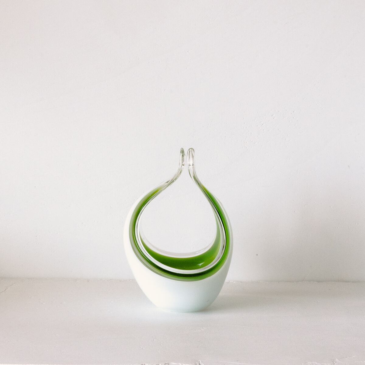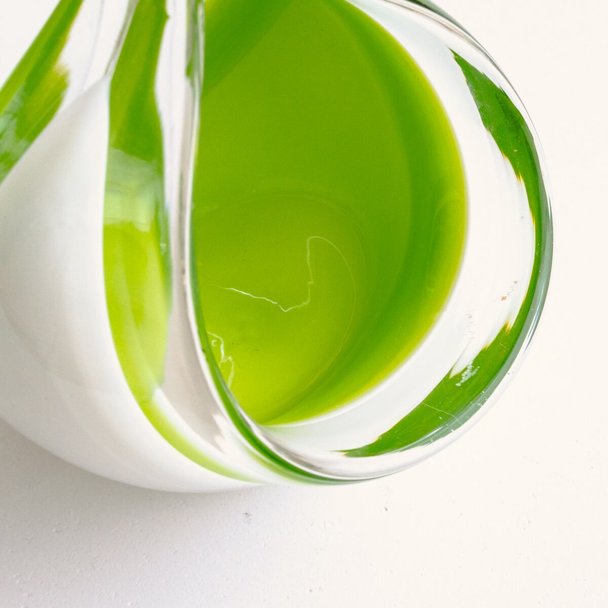 ミルキーなホワイトとライムグリーンの色づかい、ころんとした丸みのある曲線的なデザインが美しいアートガラス。