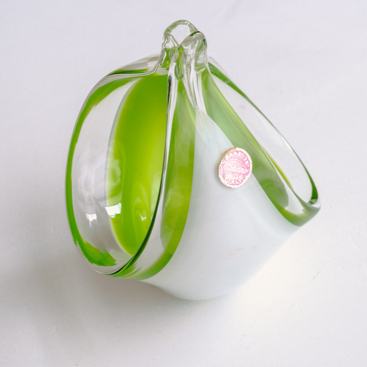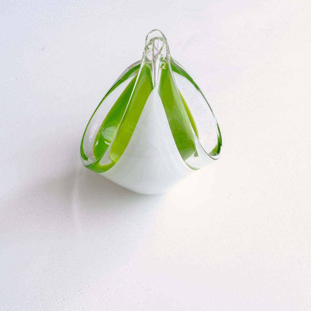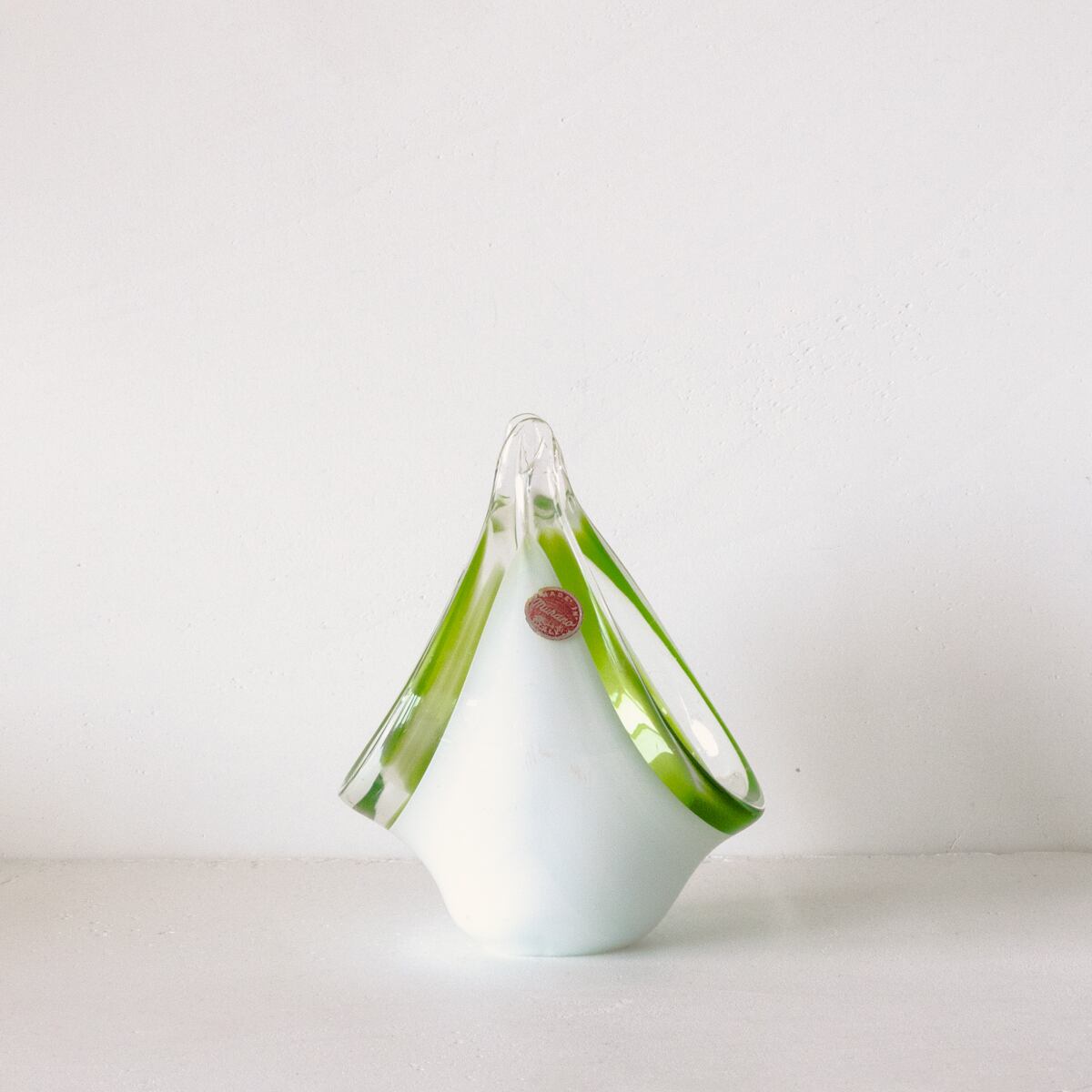 ミルキーなホワイトとライムグリーンの色づかい、ころんとした丸みのある曲線的なデザインが美しいアートガラス。
