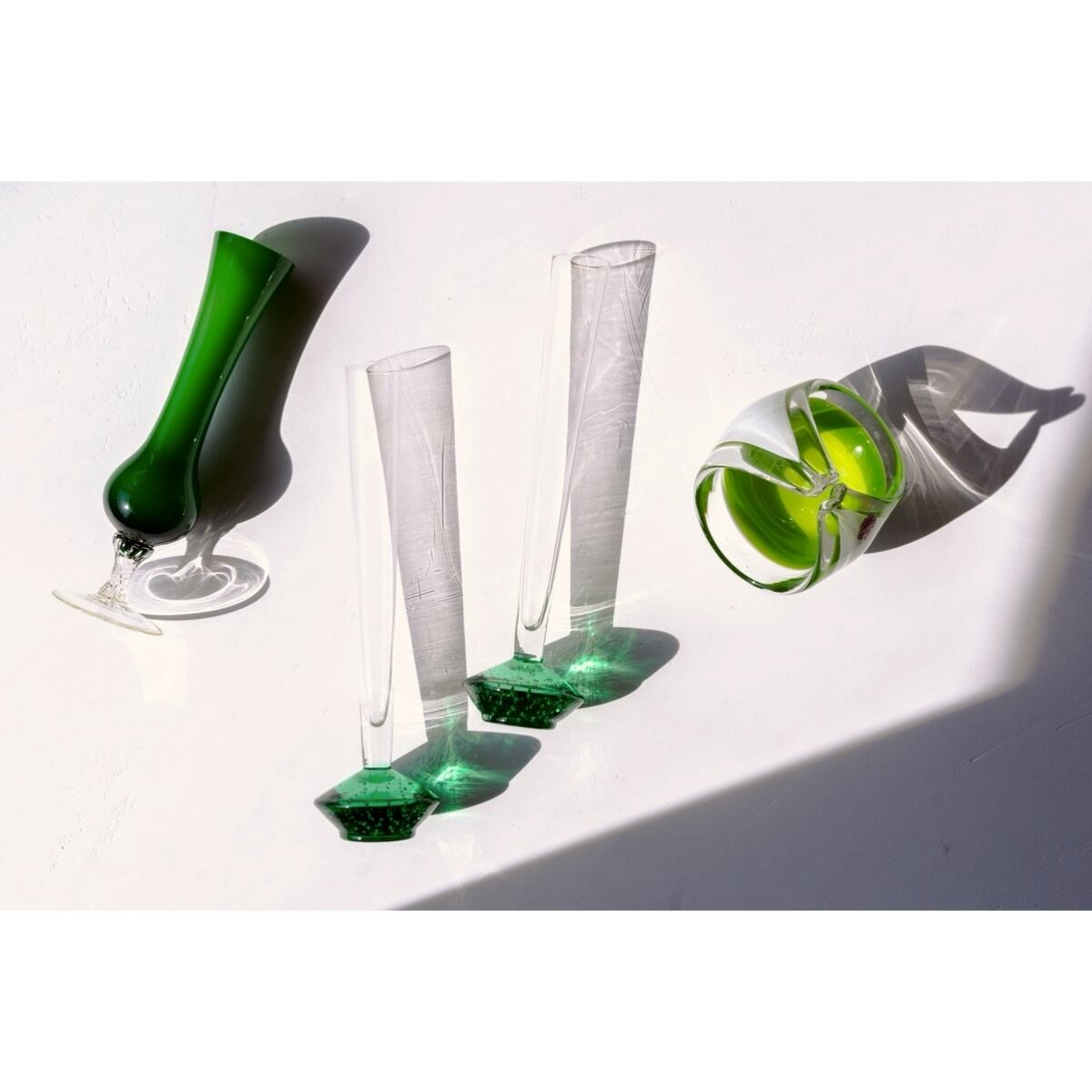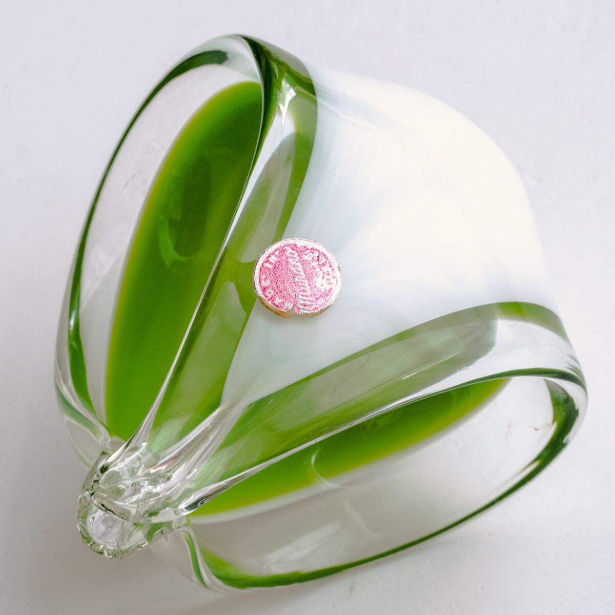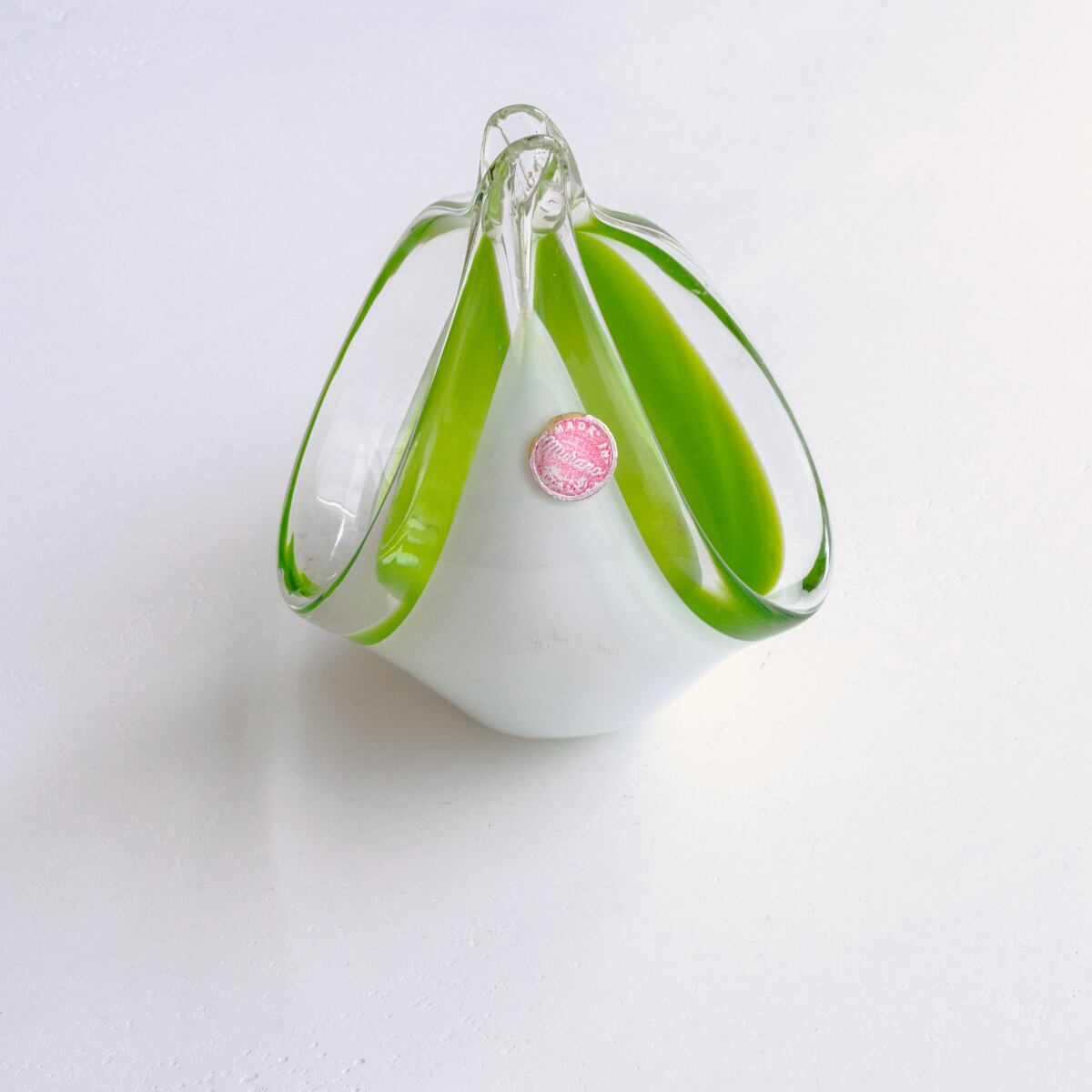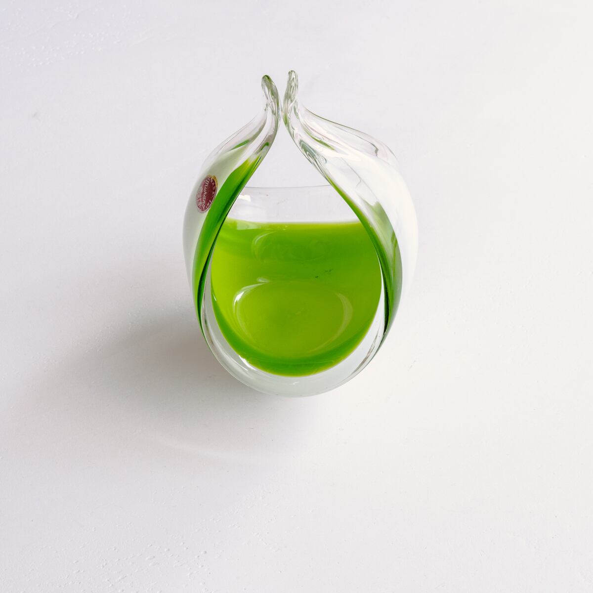ミルキーなホワイトとライムグリーンの色づかい、ころんとした丸みのある曲線的なデザインが美しいアートガラス。