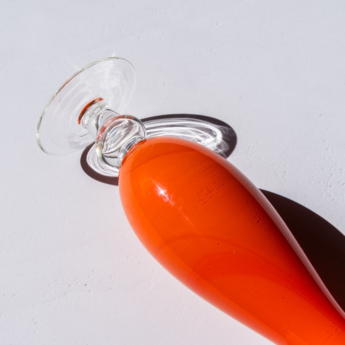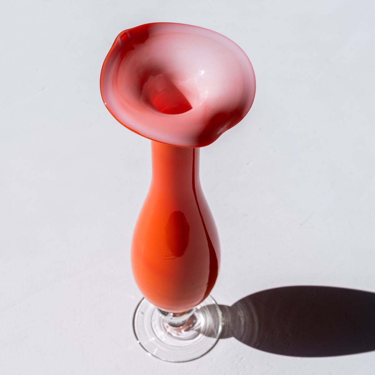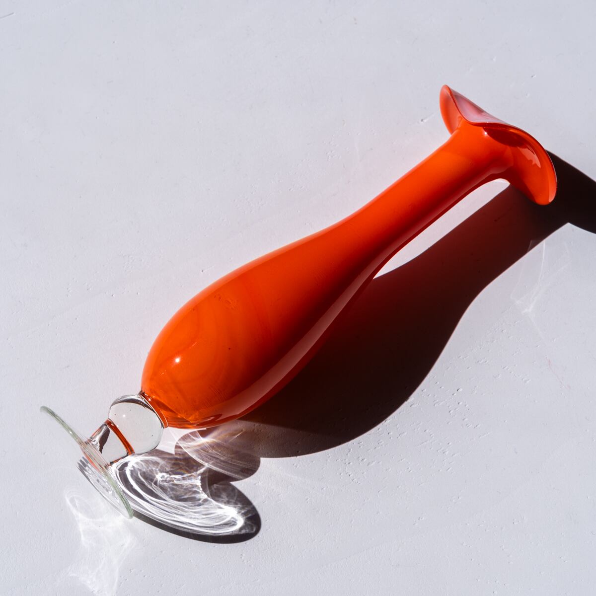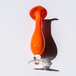 ミルキーなオレンジの色味となめらかな質感が絶妙で、クリアガラスの部分の装飾も素晴らしいミッドセンチュリーな作品。