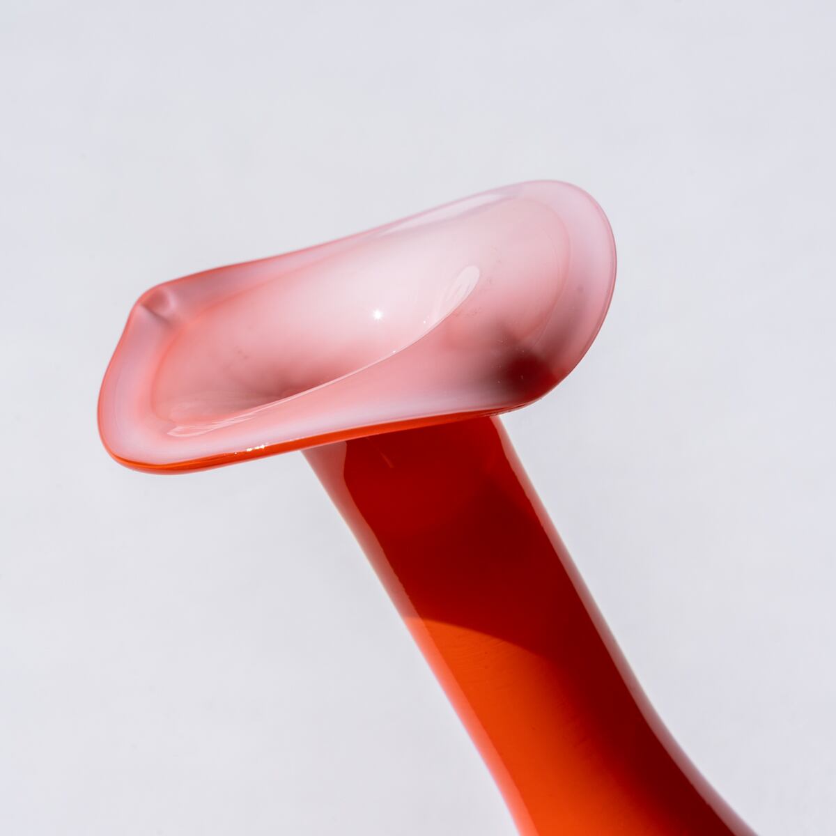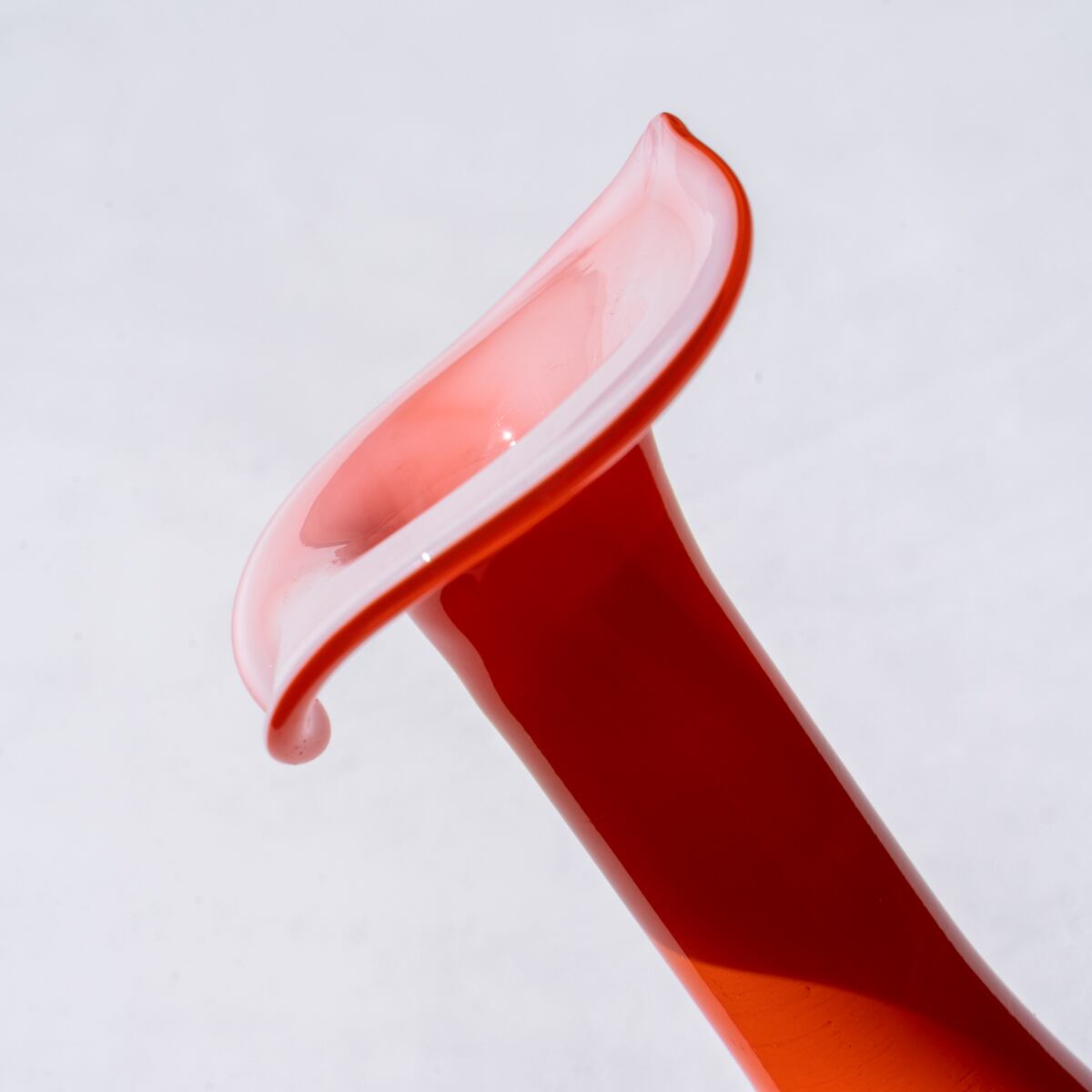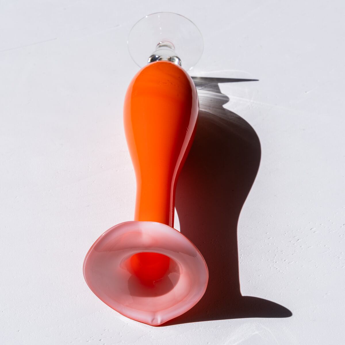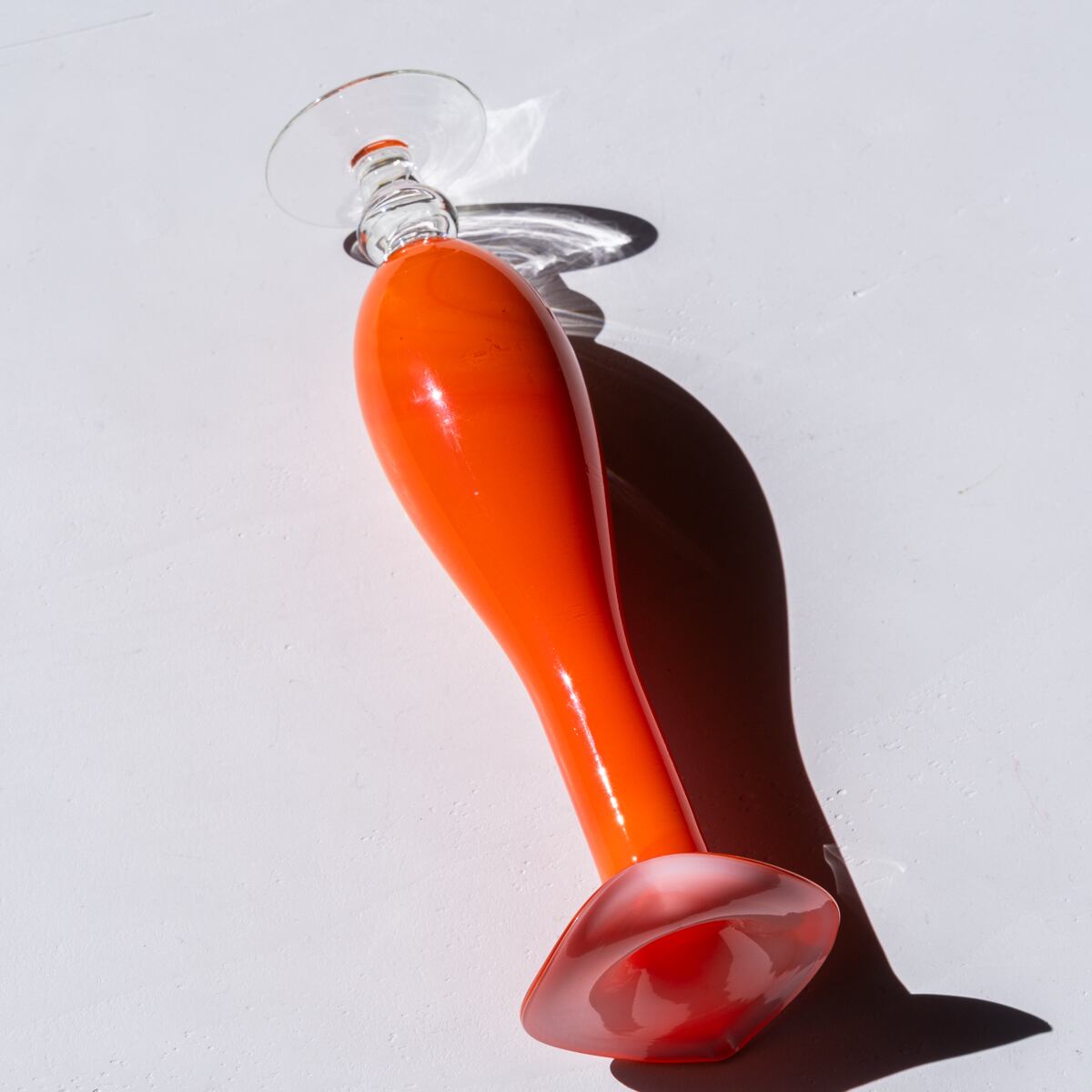 ミルキーなオレンジの色味となめらかな質感が絶妙で、クリアガラスの部分の装飾も素晴らしいミッドセンチュリーな作品。