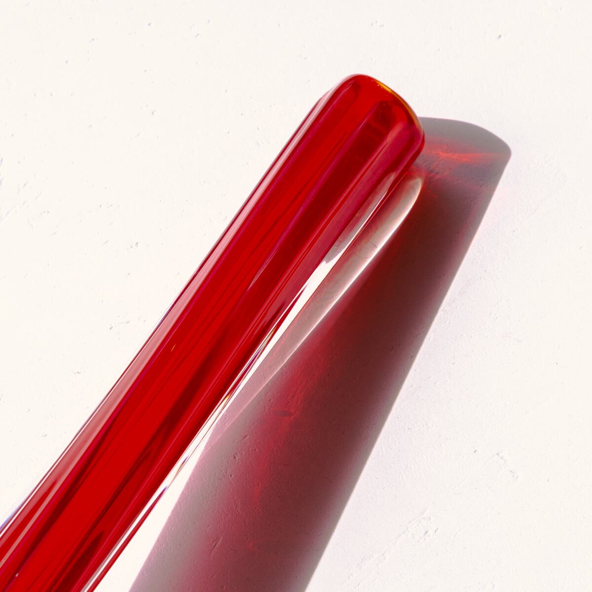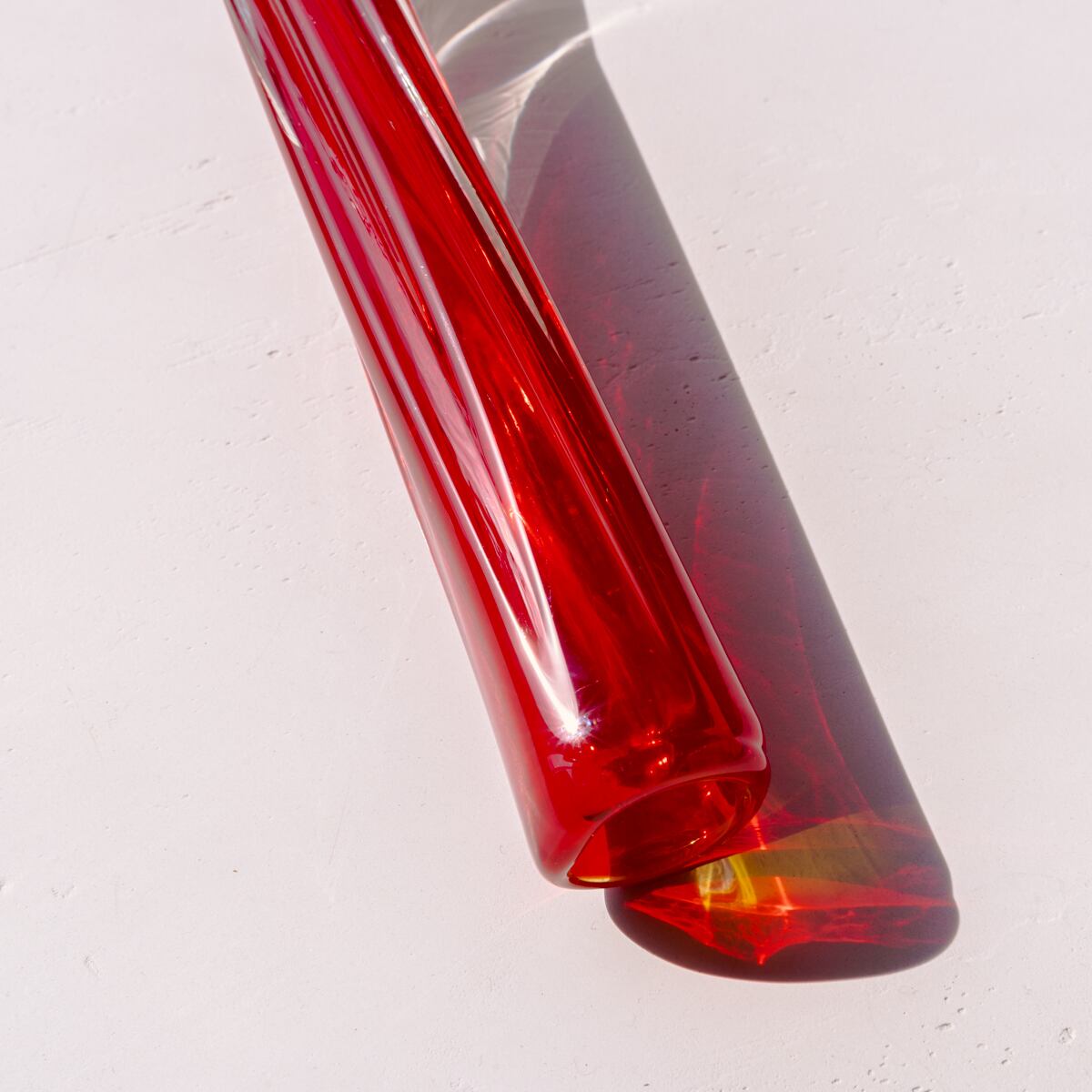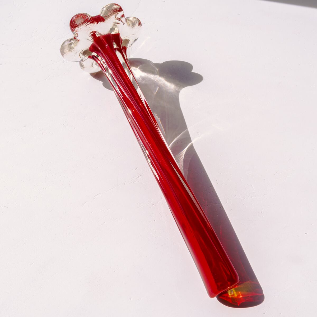 赤とクリアガラスのツイストしたデザインが美しく、象の足のような形をした土台に支えられています。