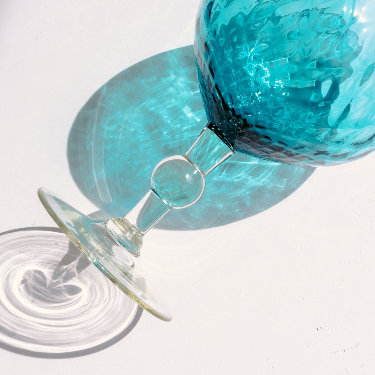 透明感のあるカワセミブルーが美しく、編み物のようなガラスの凹凸によって輝かしく反射しています。