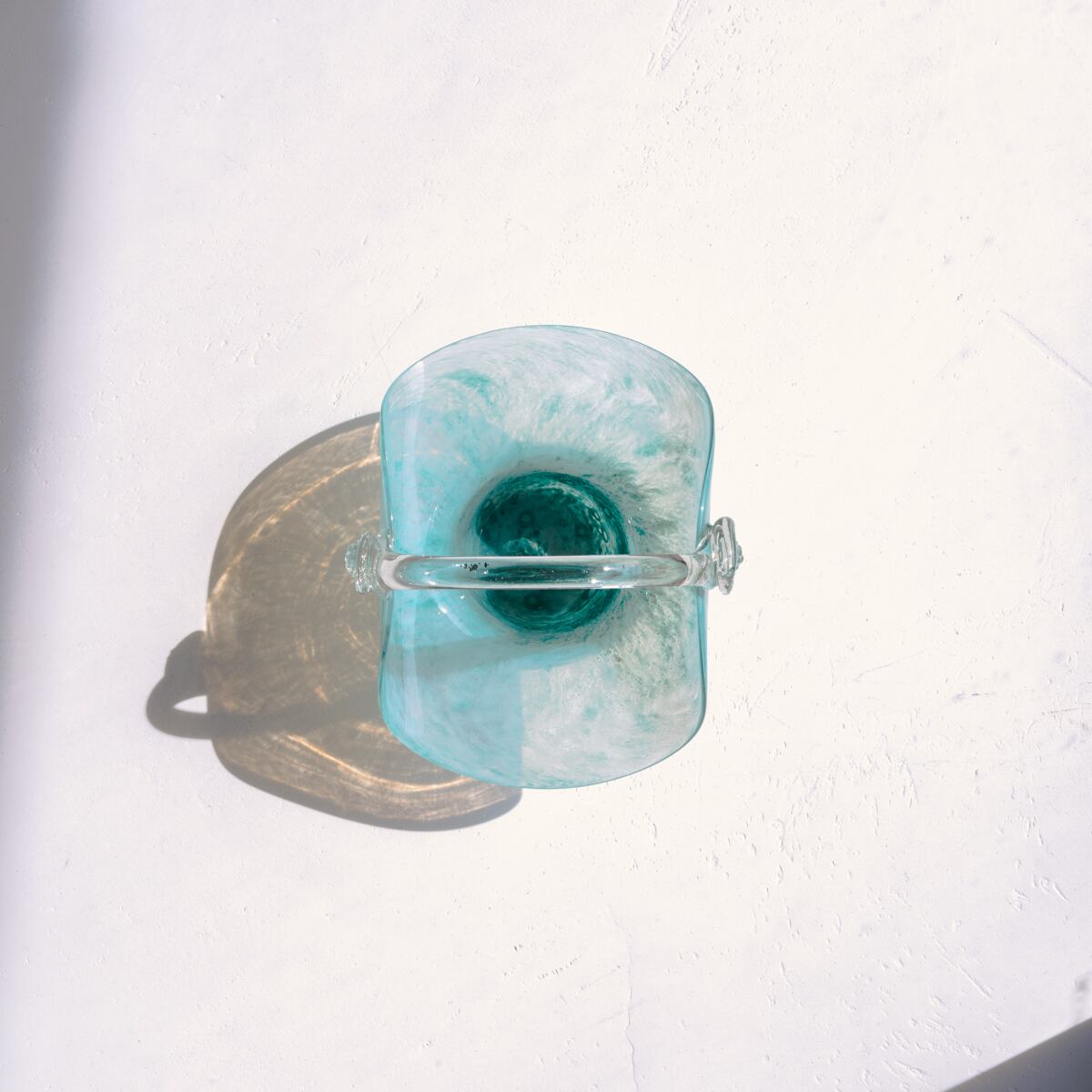 ターコイズブルーのスモークが広がっていくような、くぐもった色の広がりが絶妙に美しいデザイン。