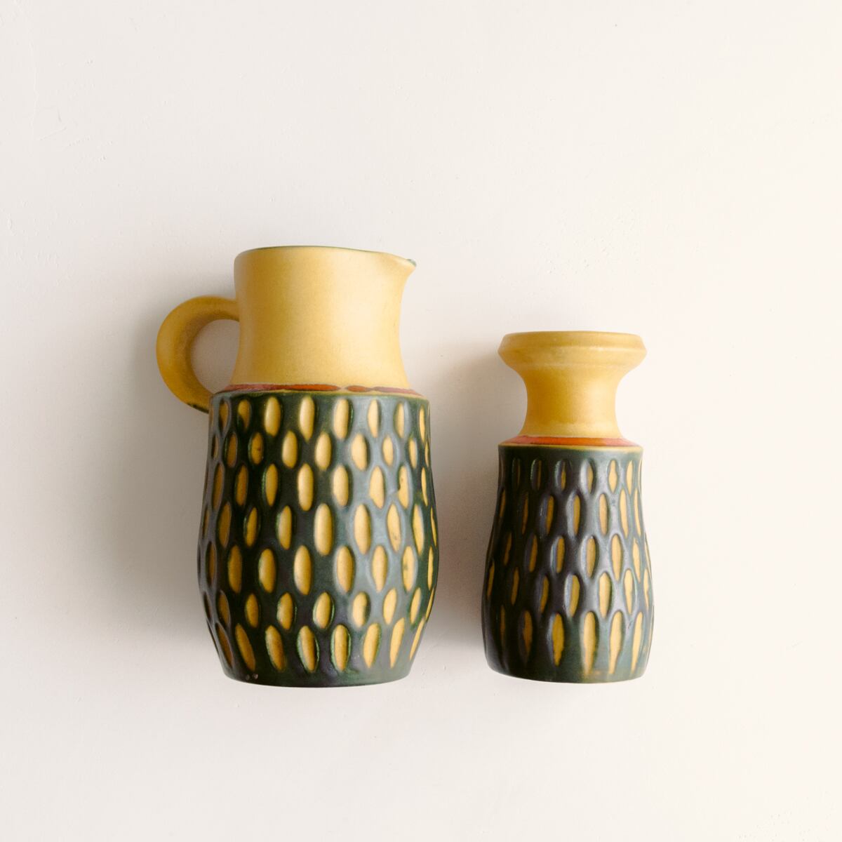 西ドイツの陶器は、渋くてかっこいいテイストが多い中で、この装飾はかなり珍しいものだと思われます。