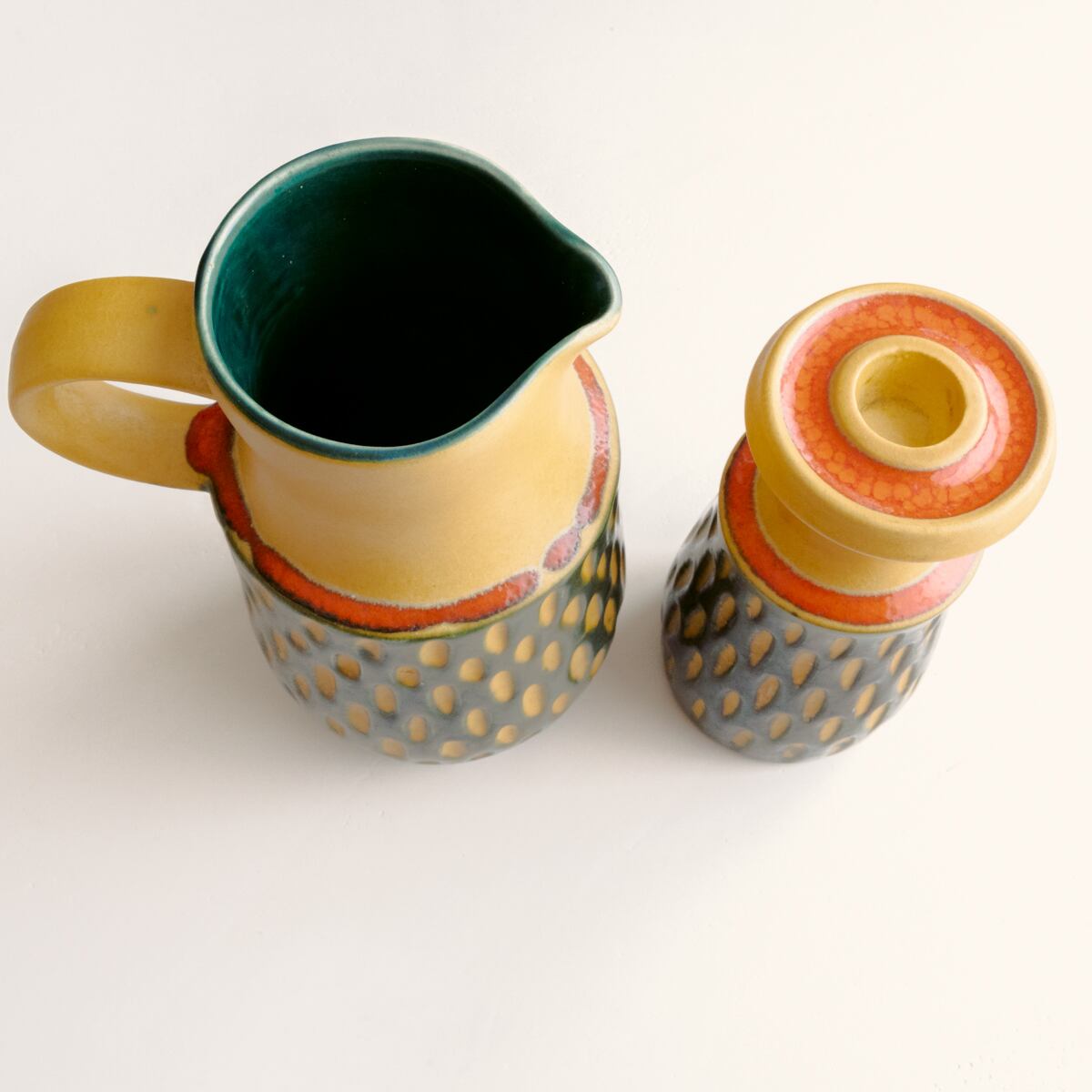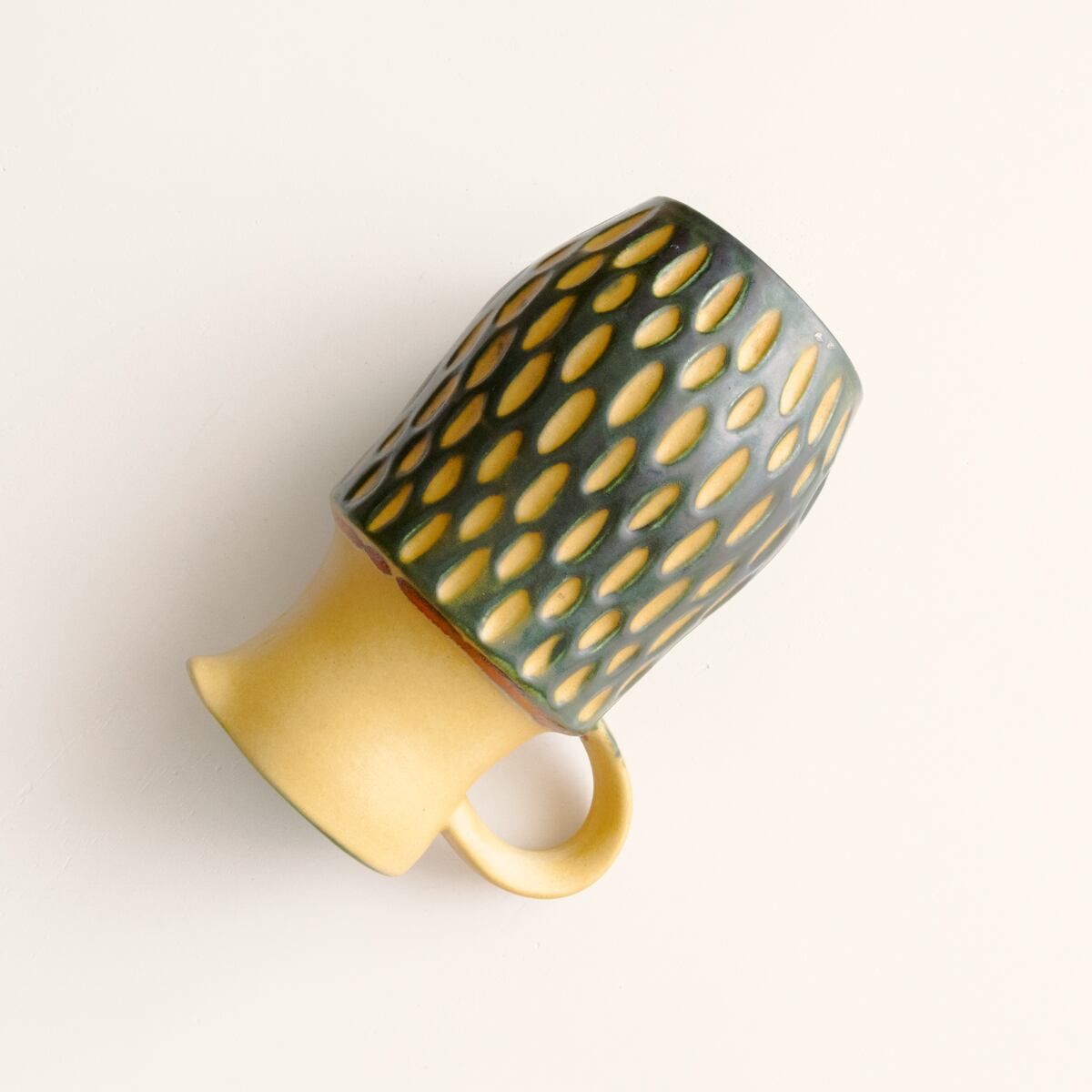 イエロー、グリーン、レッドの色合いに、特徴的なレリーフが施されたポップでファンキーなデザイン。