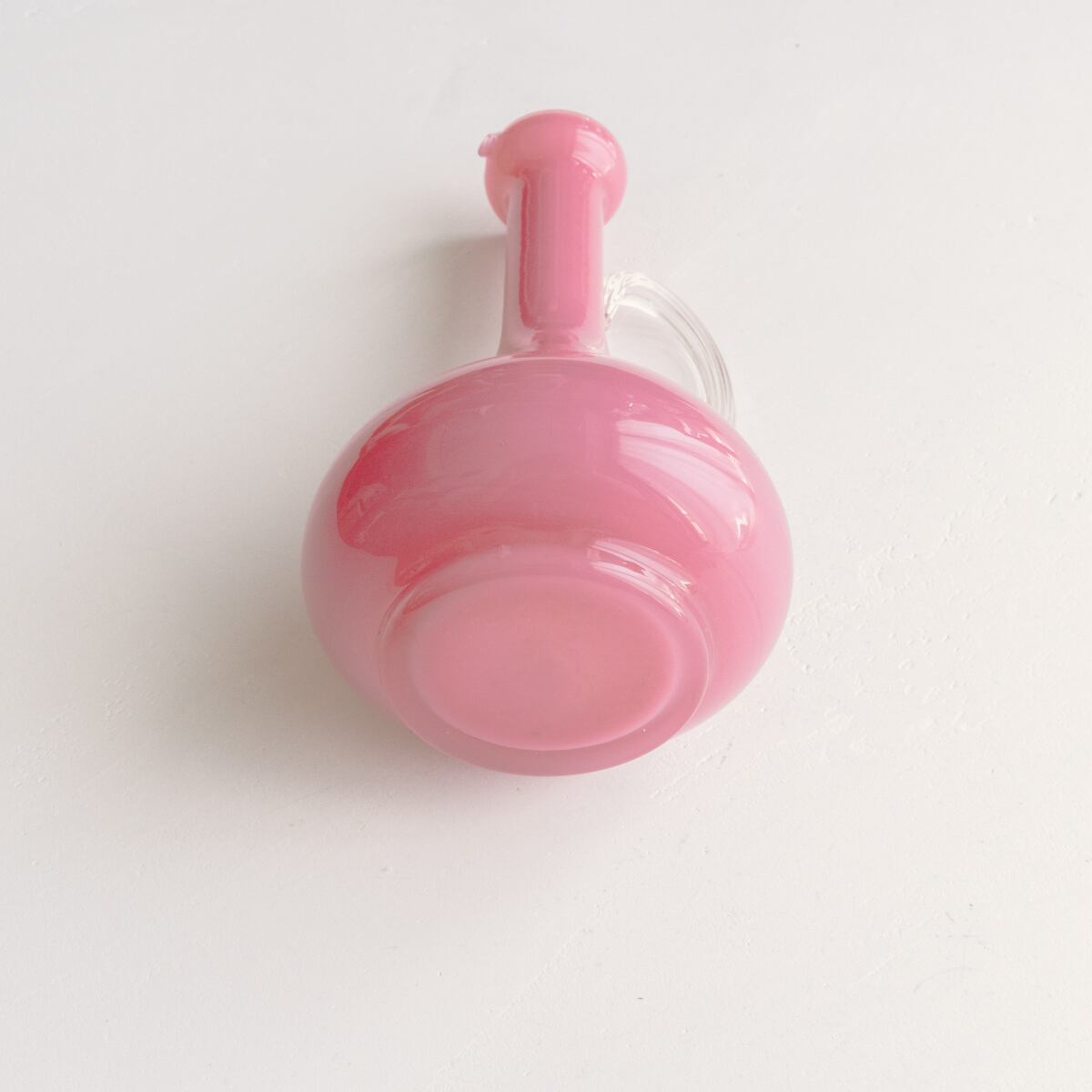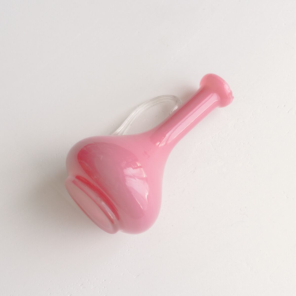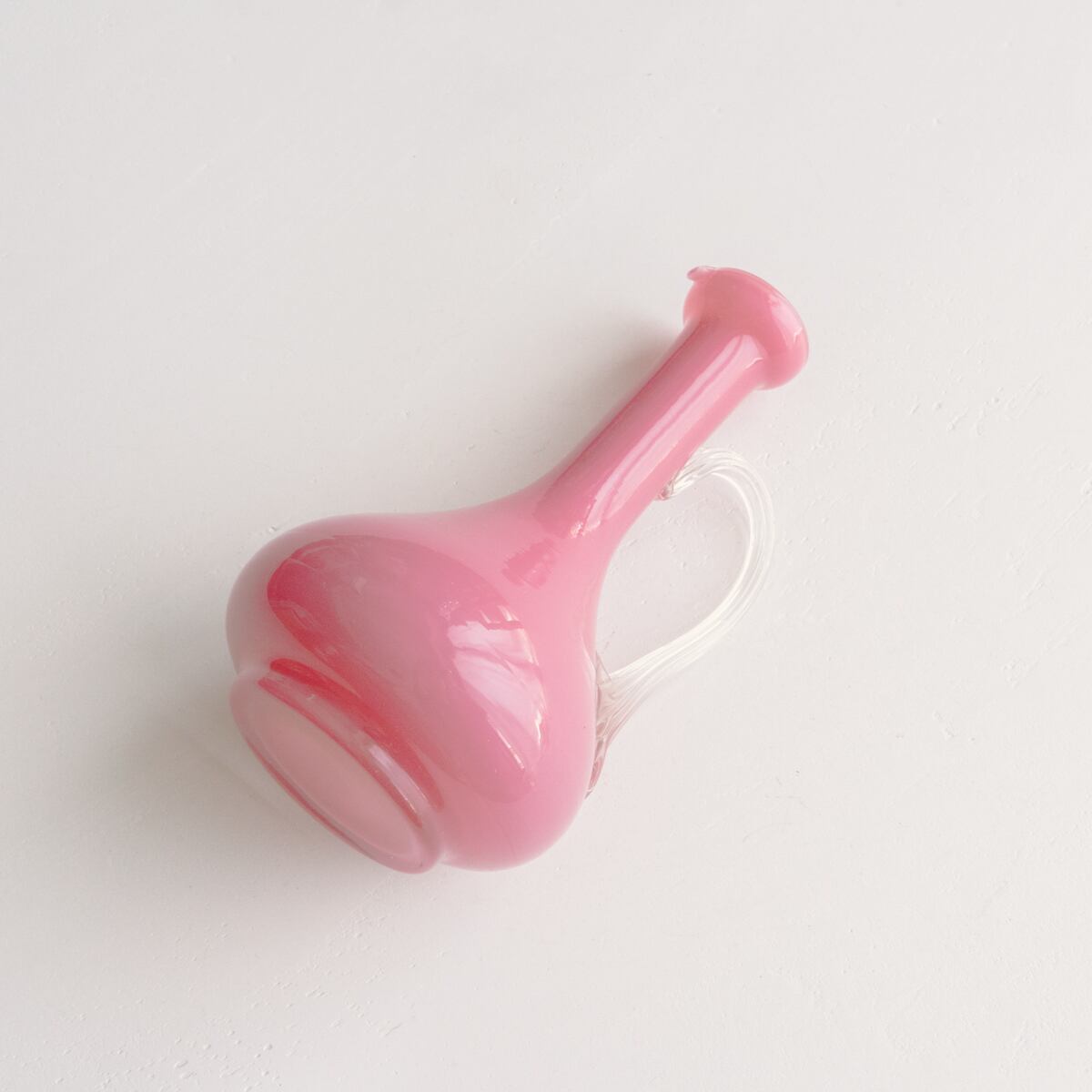 愛らしいピンク色で、クリアガラスの持ち手がついたピッチャー型の花器。