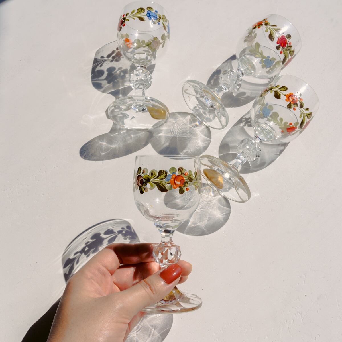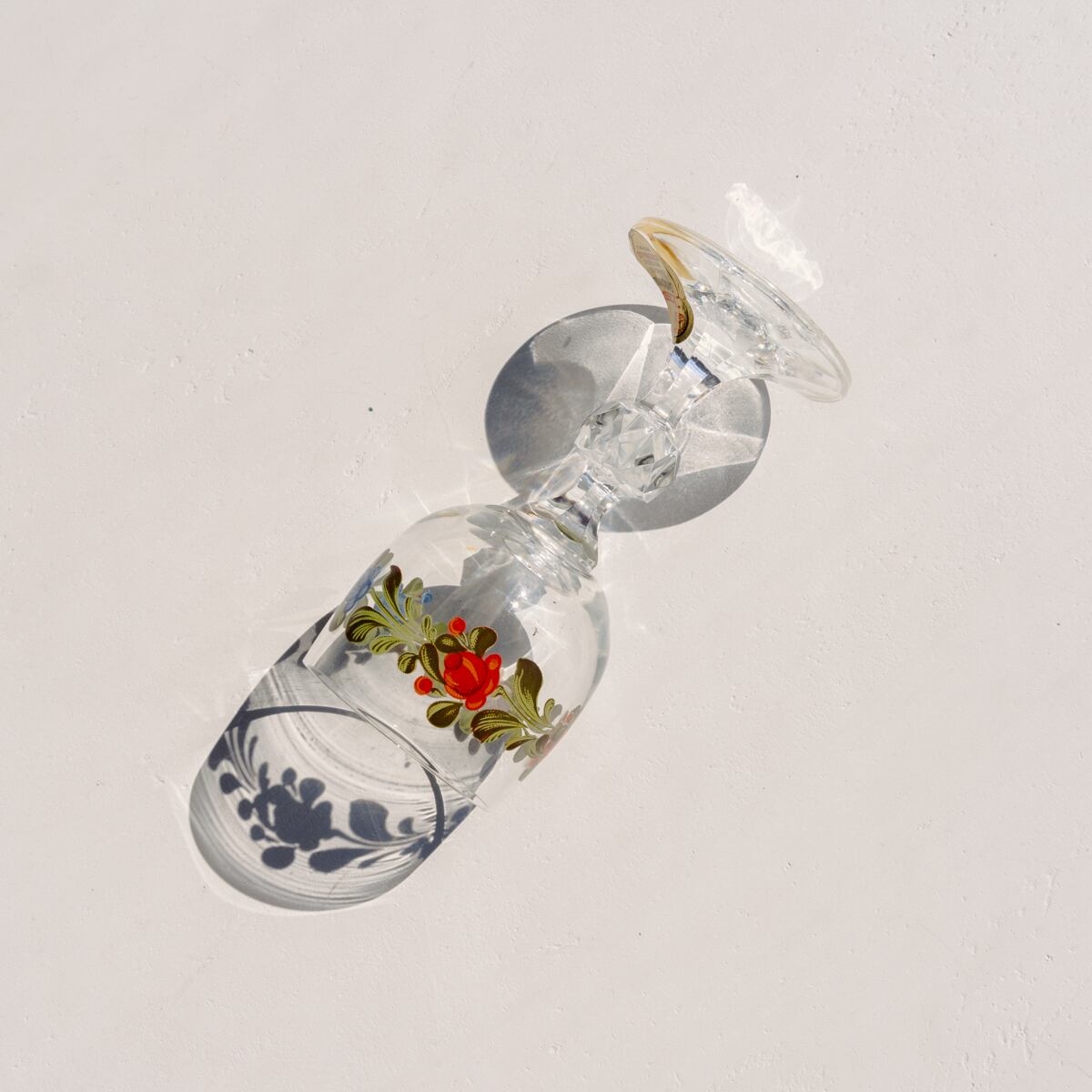 レッド、ブルー、オレンジ、の花が描かれており、ステムにはクリスタルのボールがついています。
