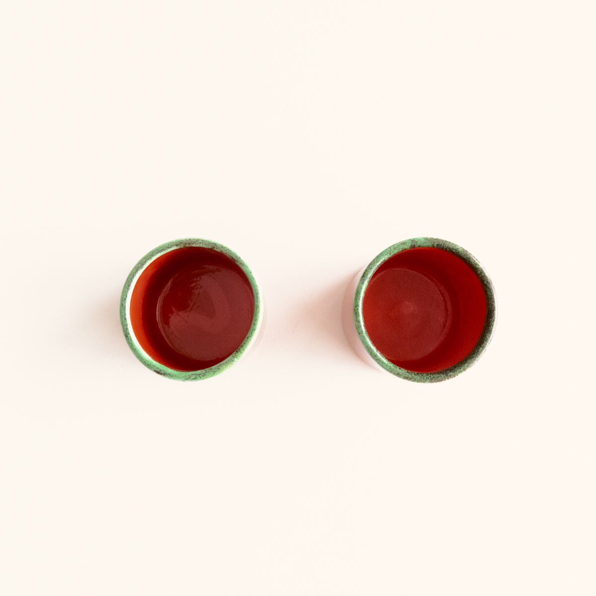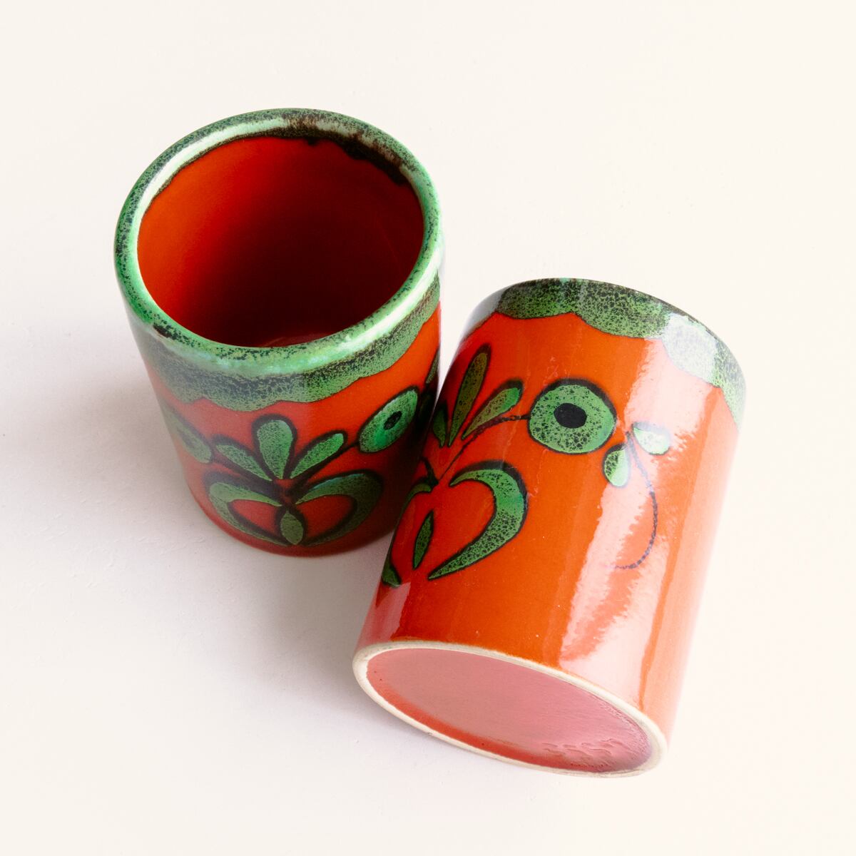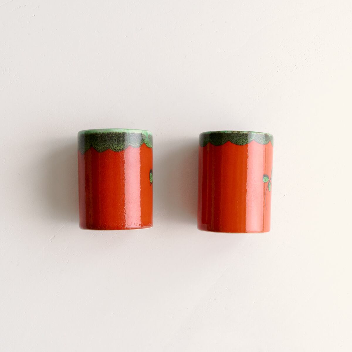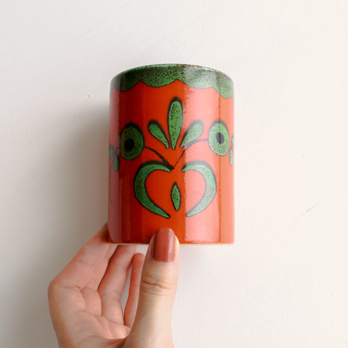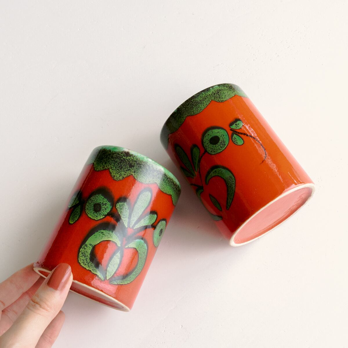 赤が印象的なカップで、異国感のある模様が可愛らしいデザイン。