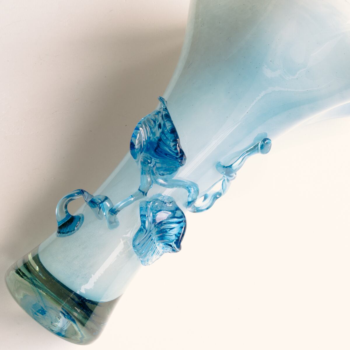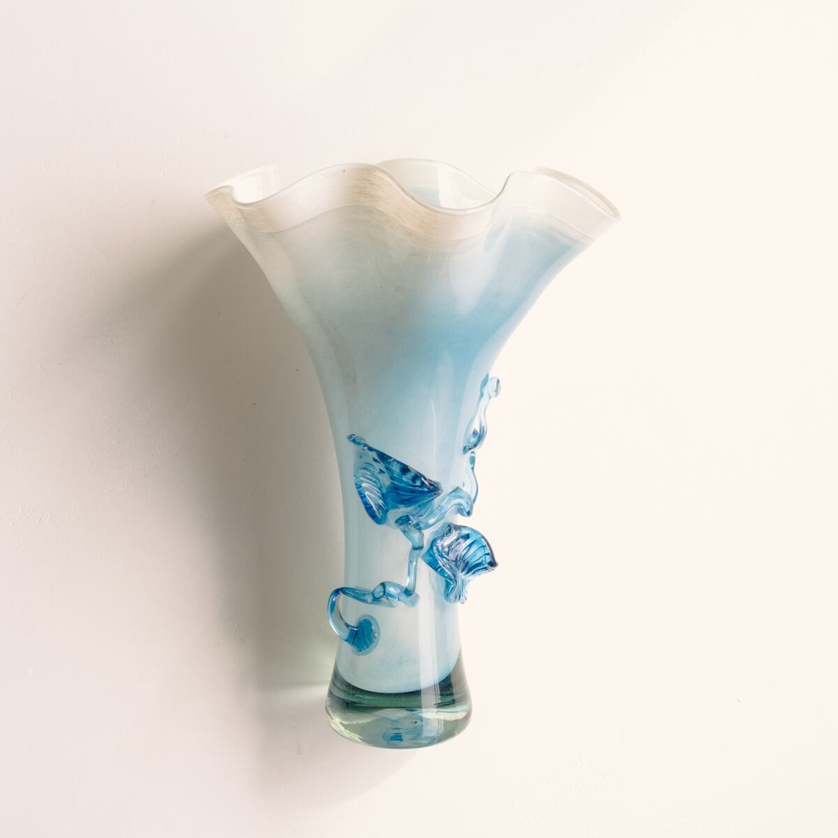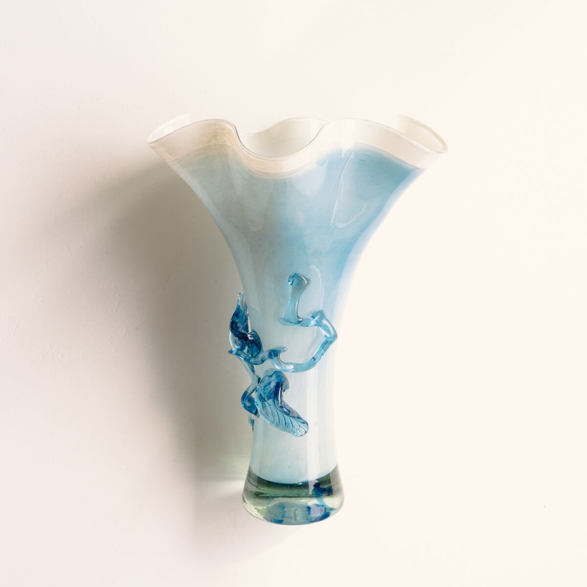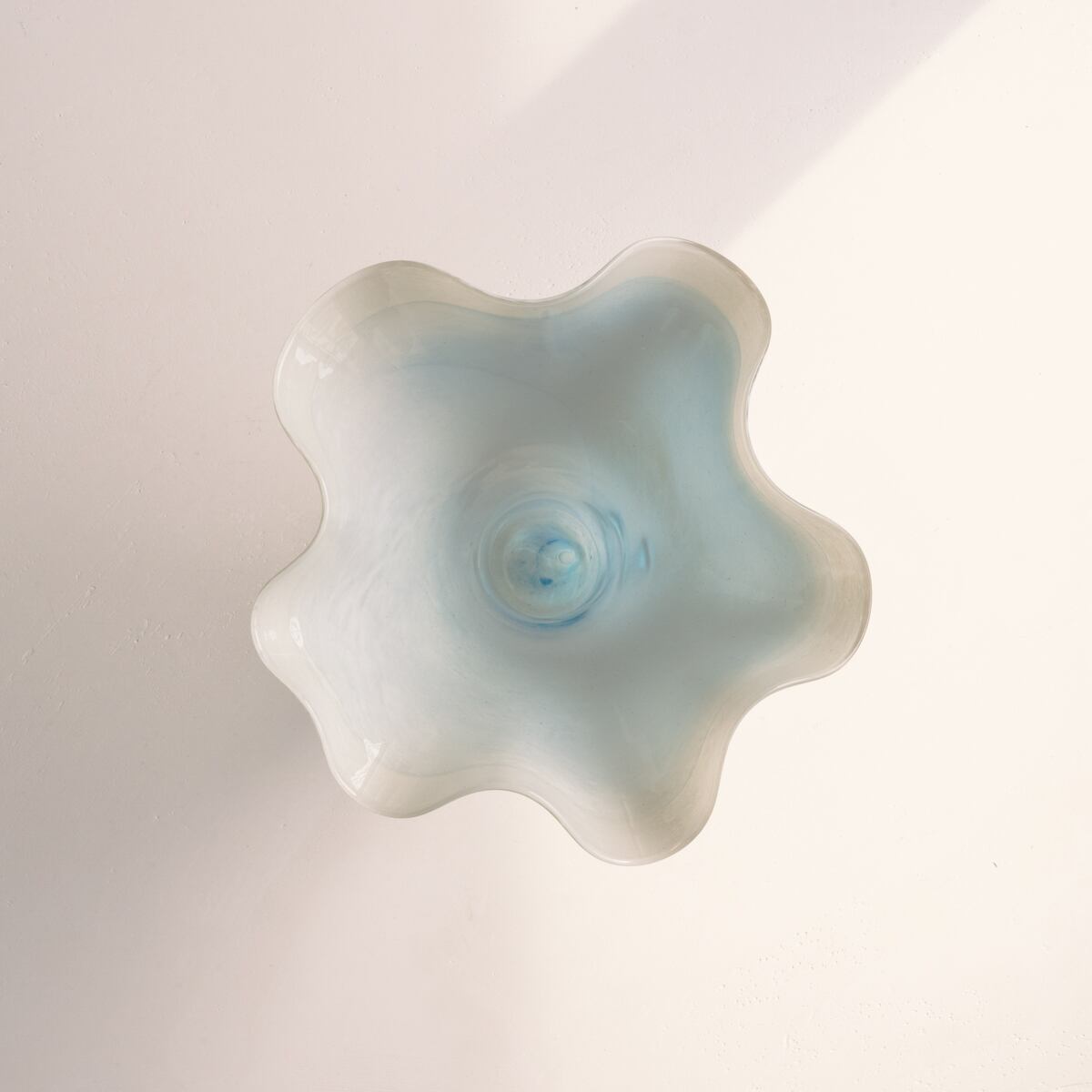 ライトブルーとホワイトのグラデーション、縁部分の大きく波打つようなフリルがとても美しい贅沢な花器。