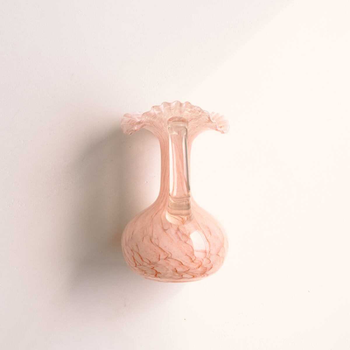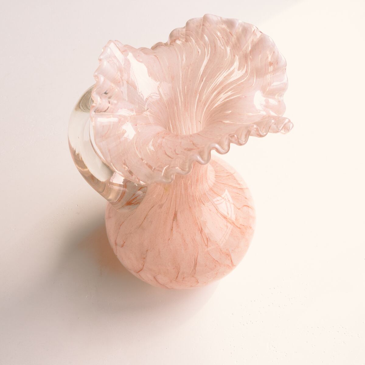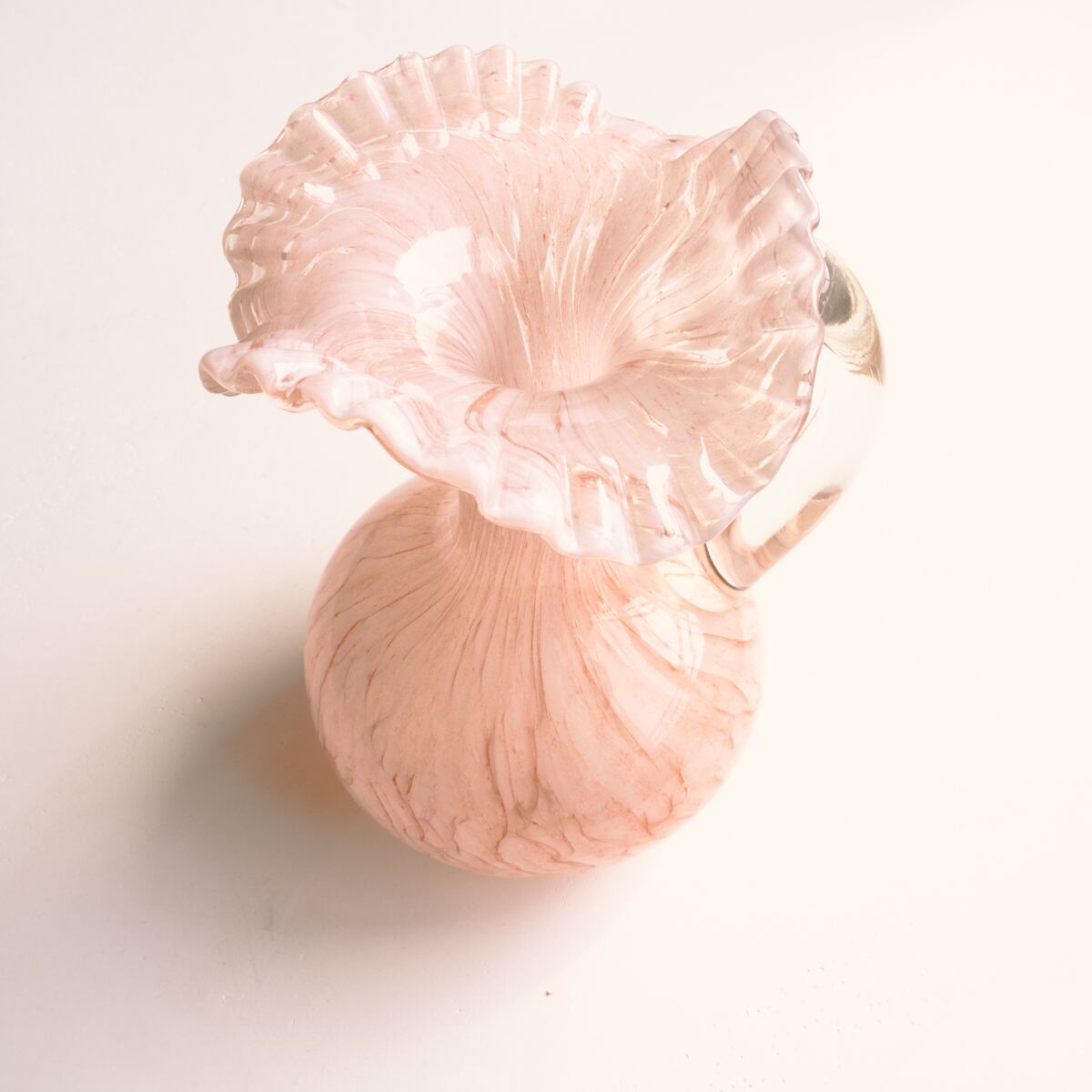 愛らしいピンク色で、クリアガラスの持ち手がついた水差し型の花器。