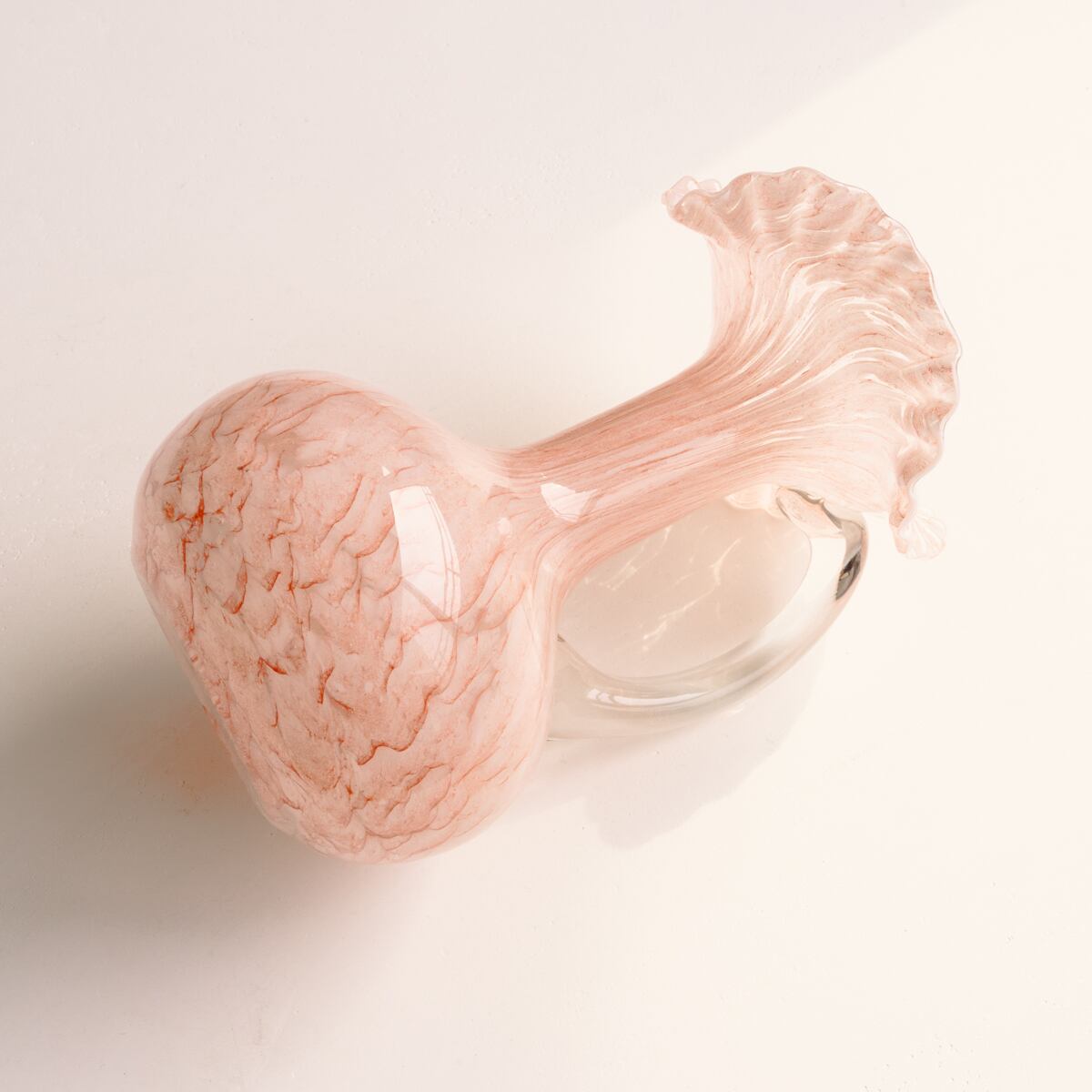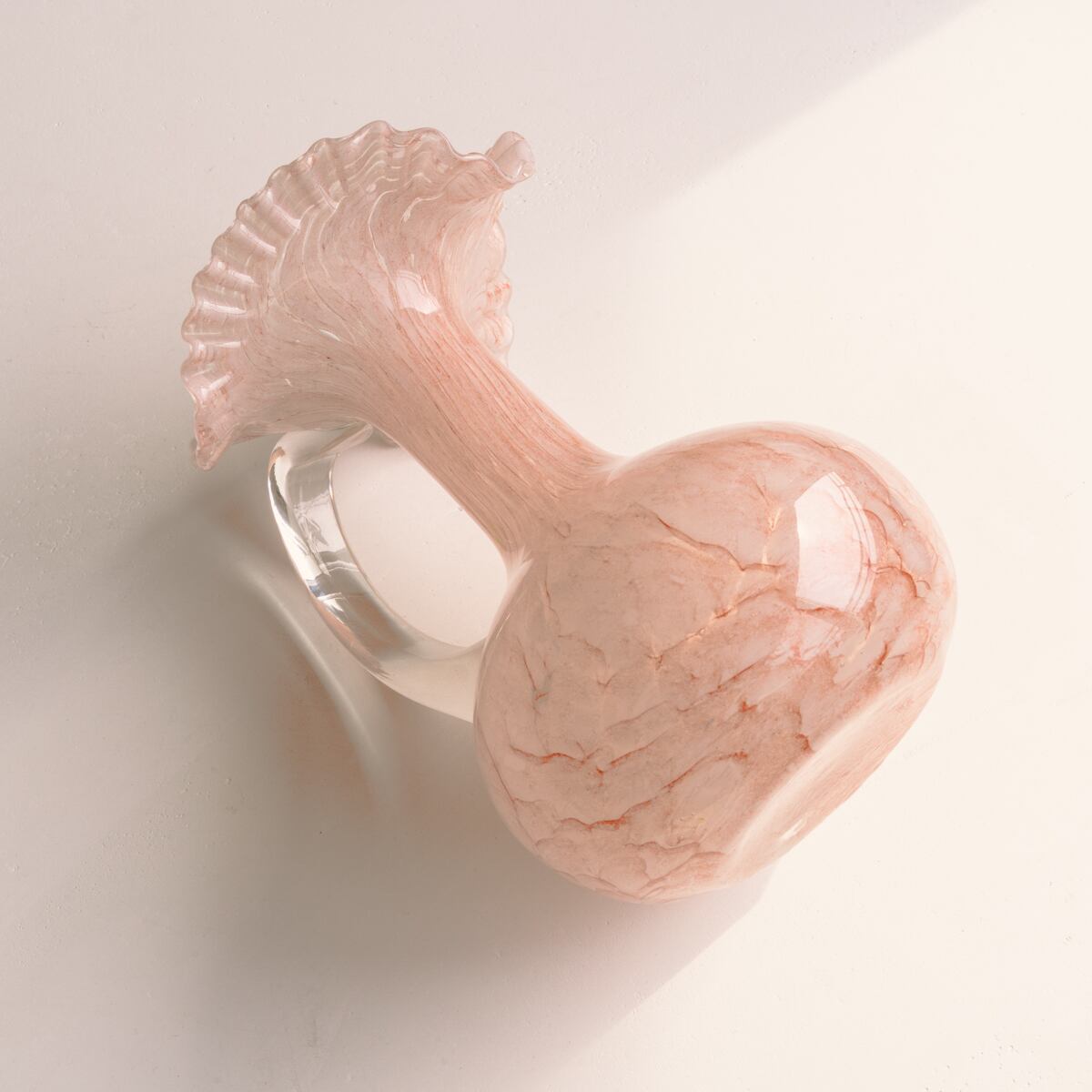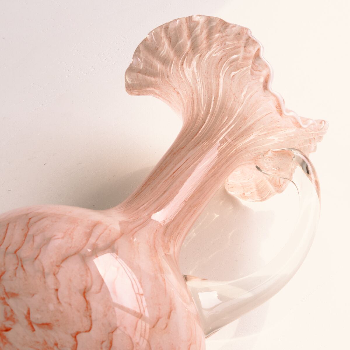 愛らしいピンク色で、クリアガラスの持ち手がついた水差し型の花器。