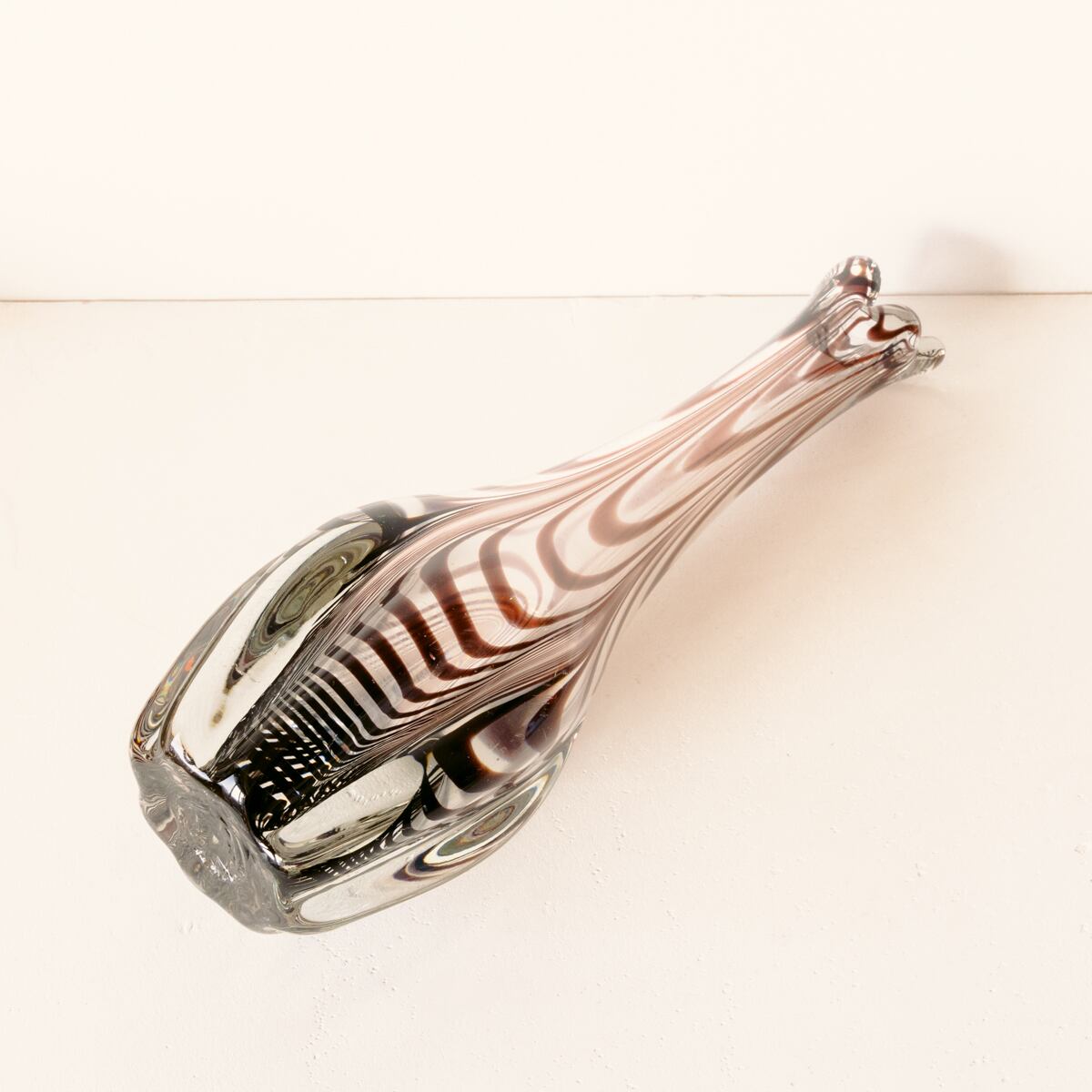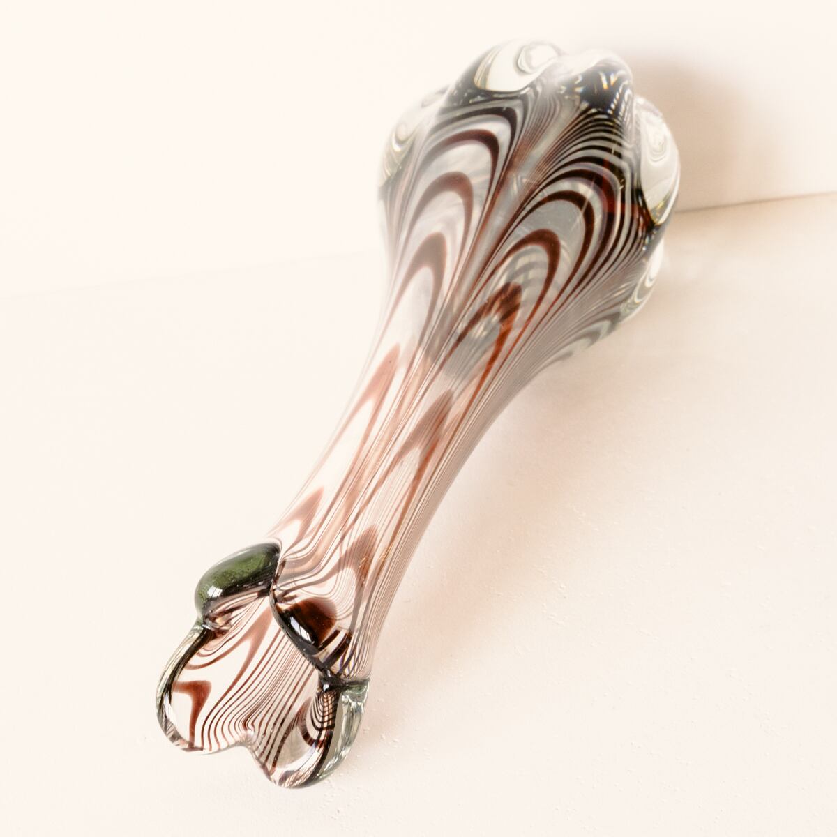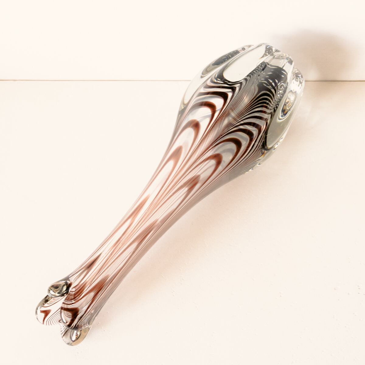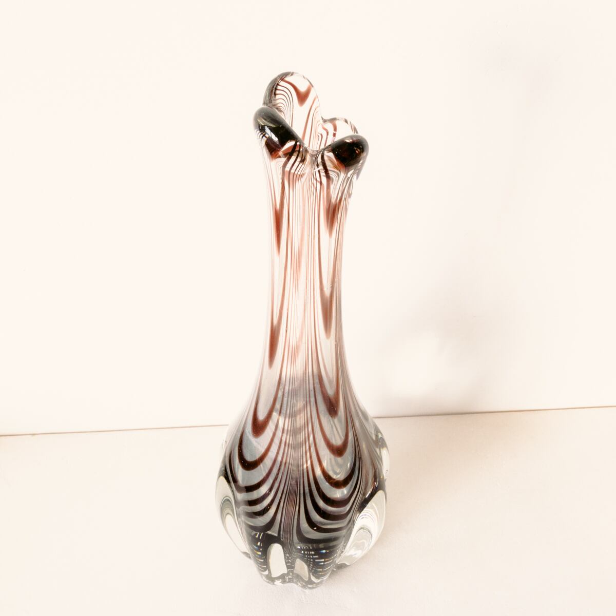 ブラウンのループ状に広がったパターン、縦に縁取りされているデザインで、ガラスの表情豊かな花器です。
