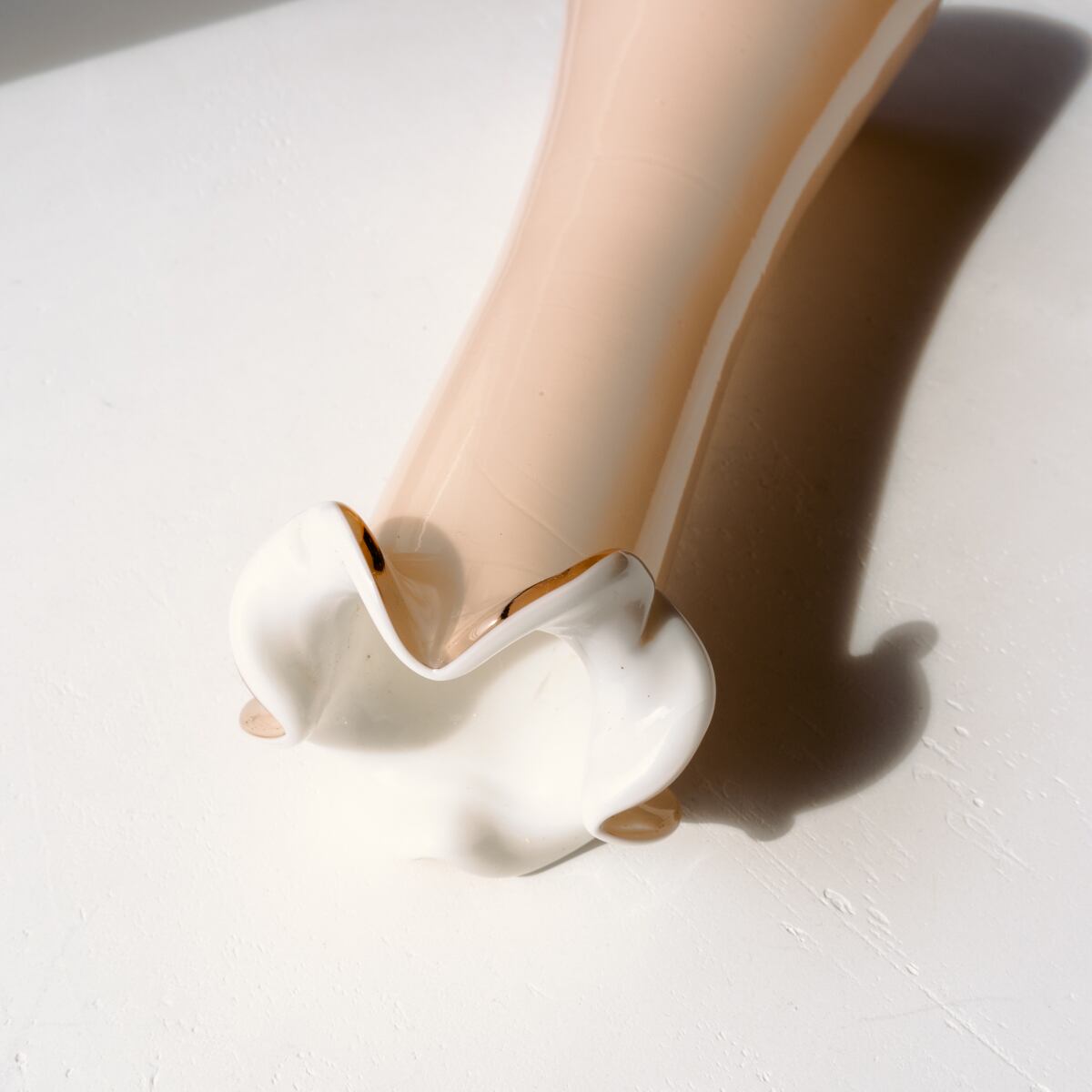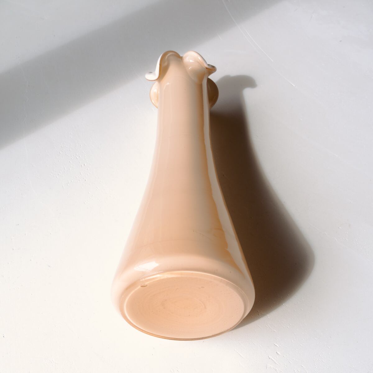 優しいピンクベージュの色合いで、フリルのような口も可愛い花器です。