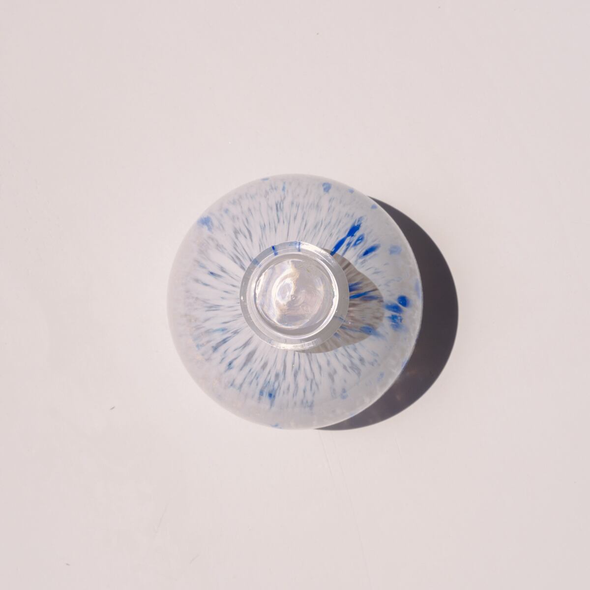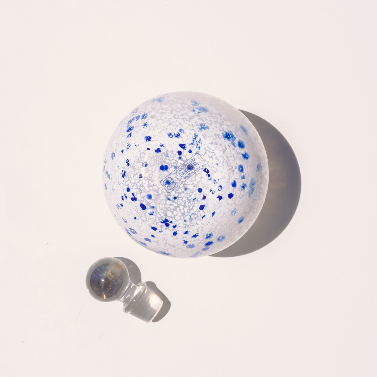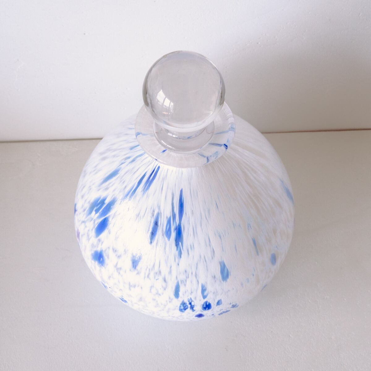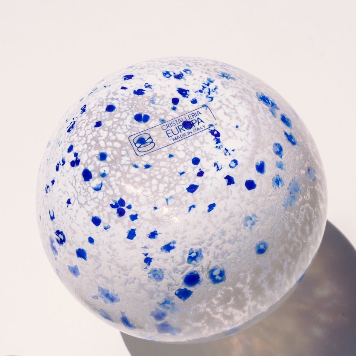雪のようなホワイトに鮮やかなブルーが散りばめられたとても美しいムラーノガラスの美術品です。