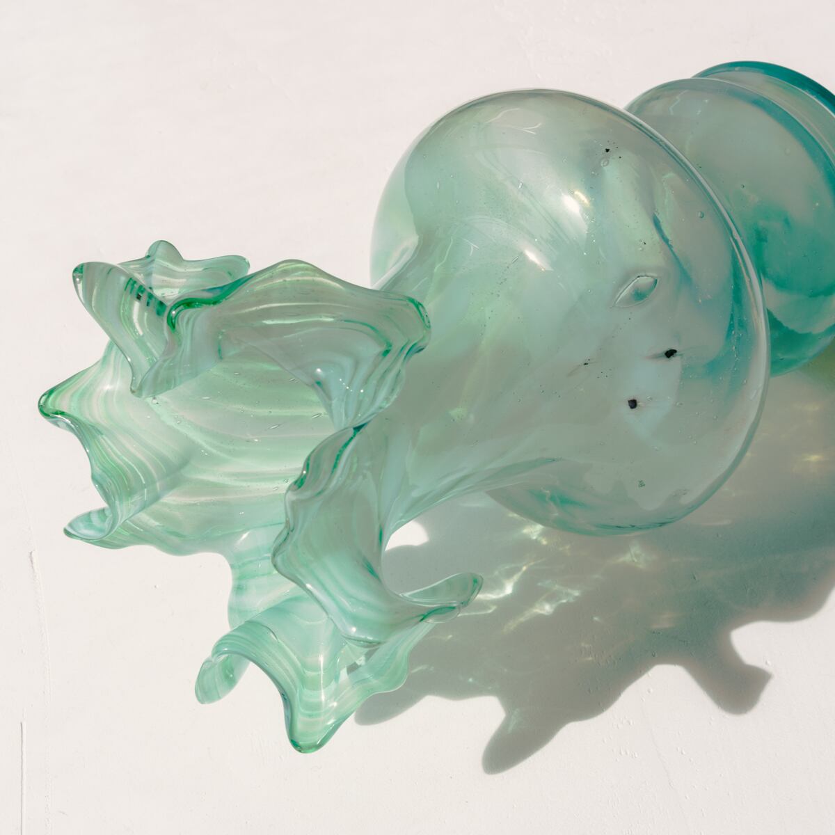 エメラルドグリーンのクリアなガラスに、ホワイトのマーブル模様が広がる美しいデザイン。