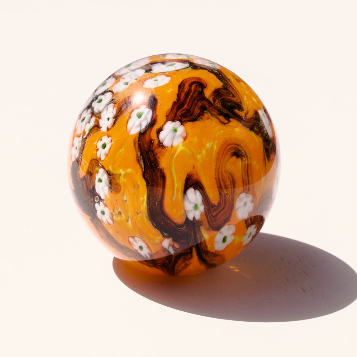 オレンジ、イエロー、ブラックが混ざり合ったマーブル模様を背景に、小さな白い花が散りばめられたデザイン。