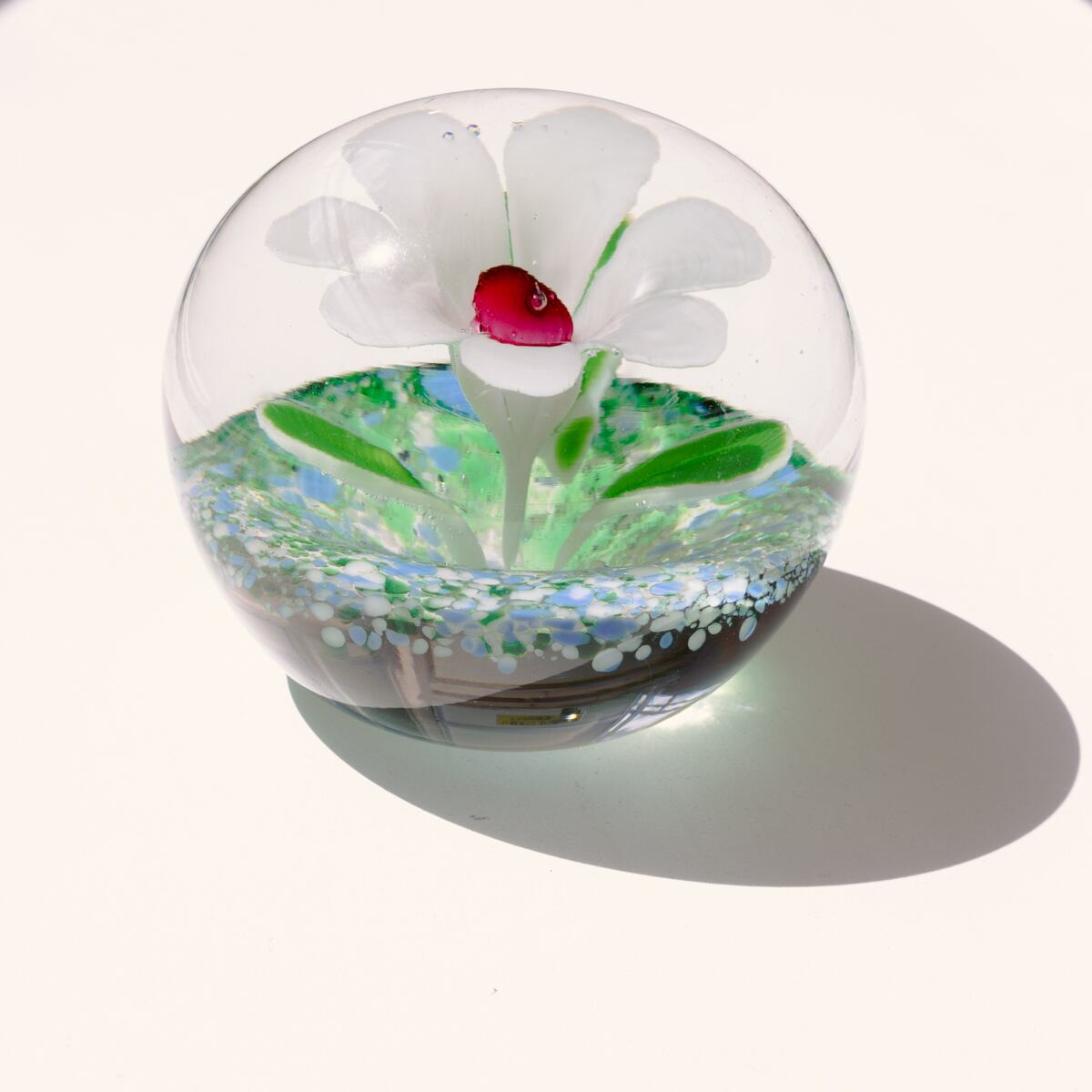 ホワイトと水色の地面と一輪の花を、ガラスの中に閉じ込めたようなデザイン。