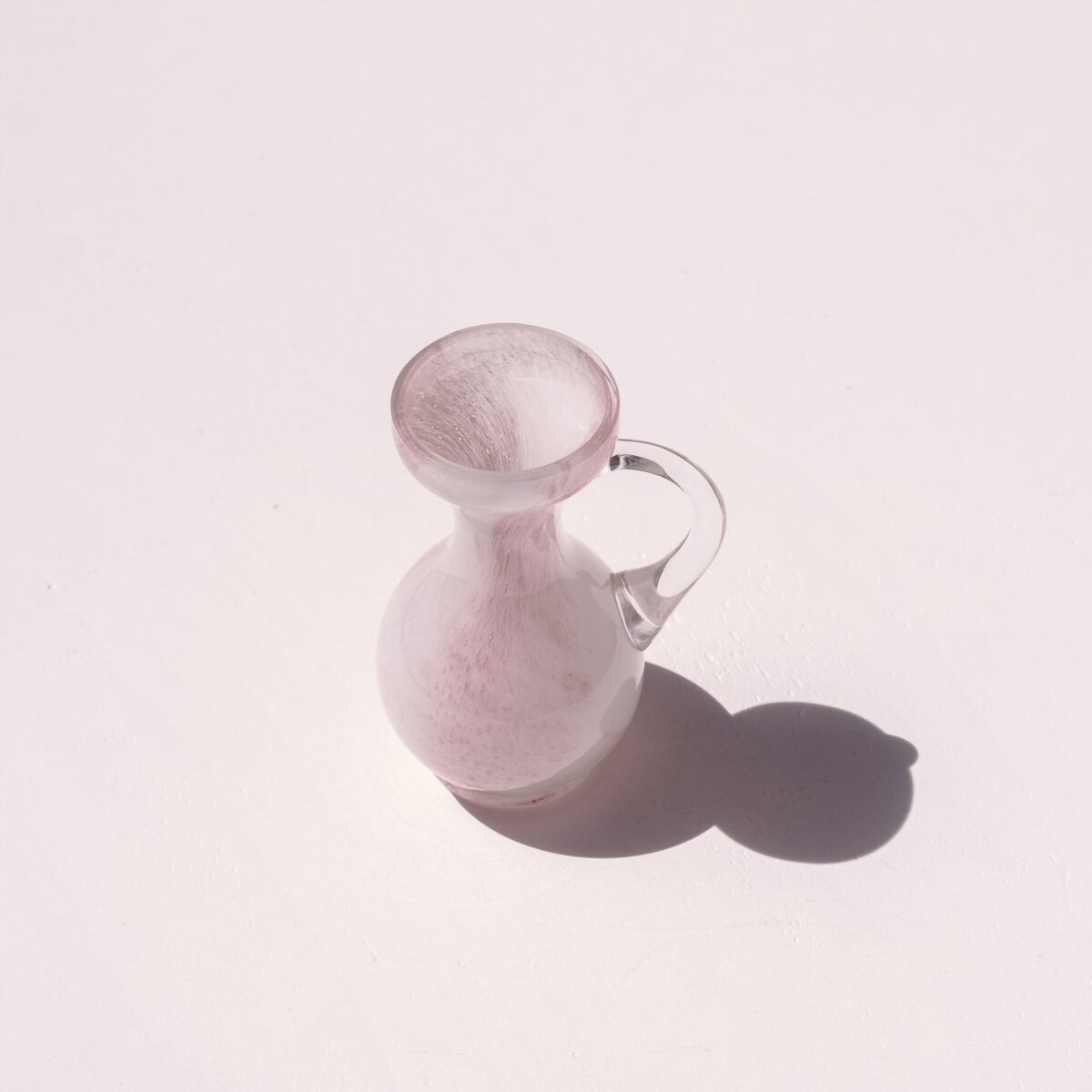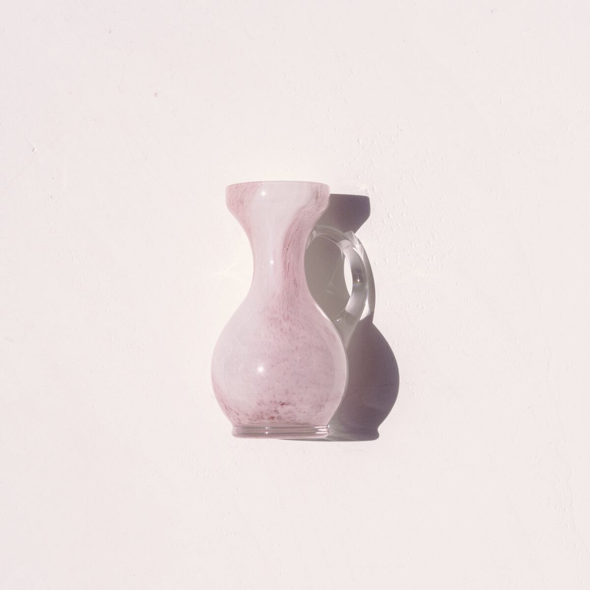 ホワイトとピンクのマーブル、とろみのあるテクスチャー、くびれや持ち手の曲線が美しいデザイン。