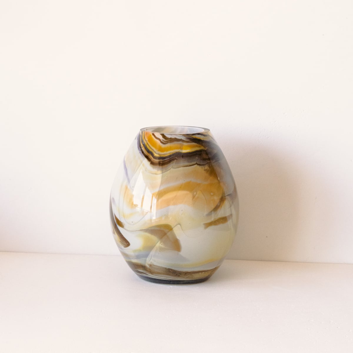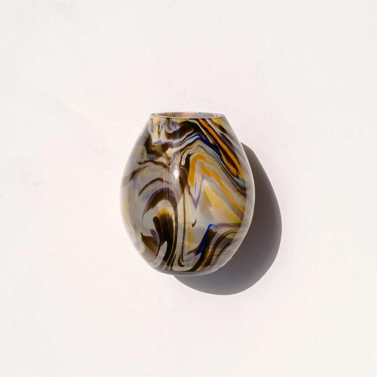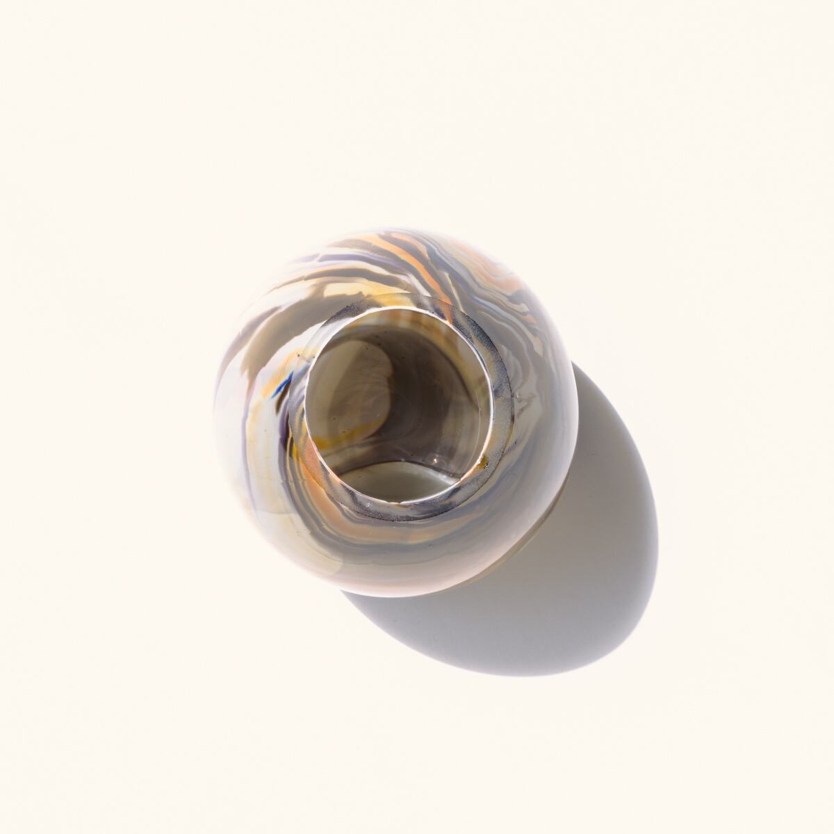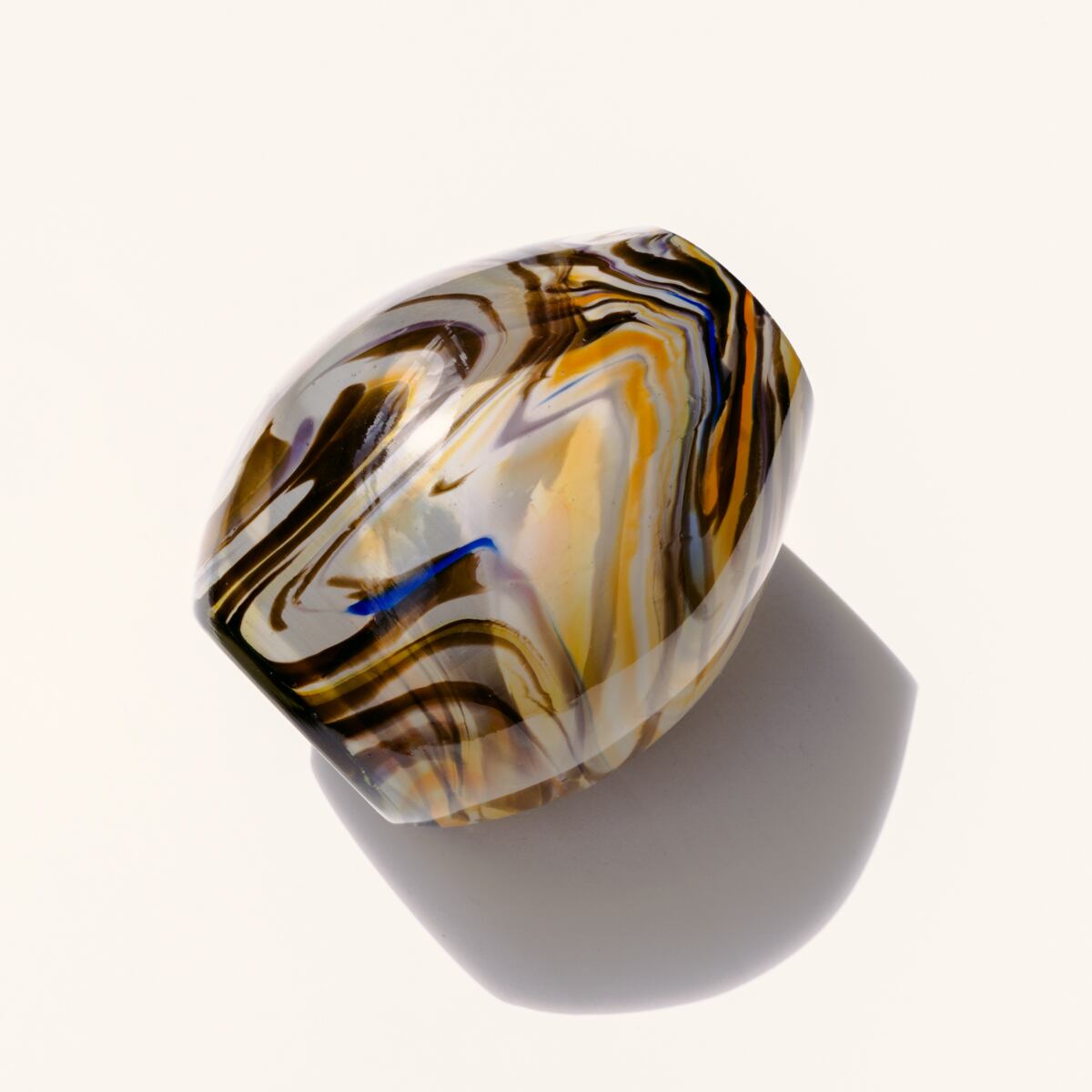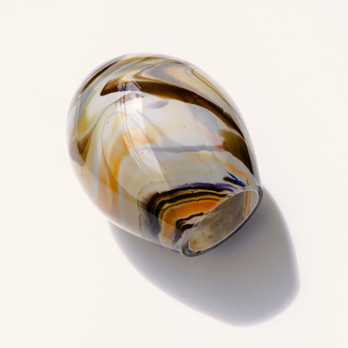 すっきりと美しい卵型のデザインで、ブラウン、ホワイト、オレンジ、イエロー、ブルーなど、さまざまな色が入り混じったマーブル模様で彩られています。