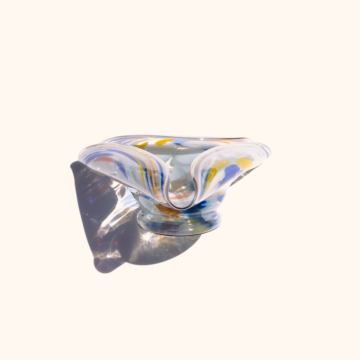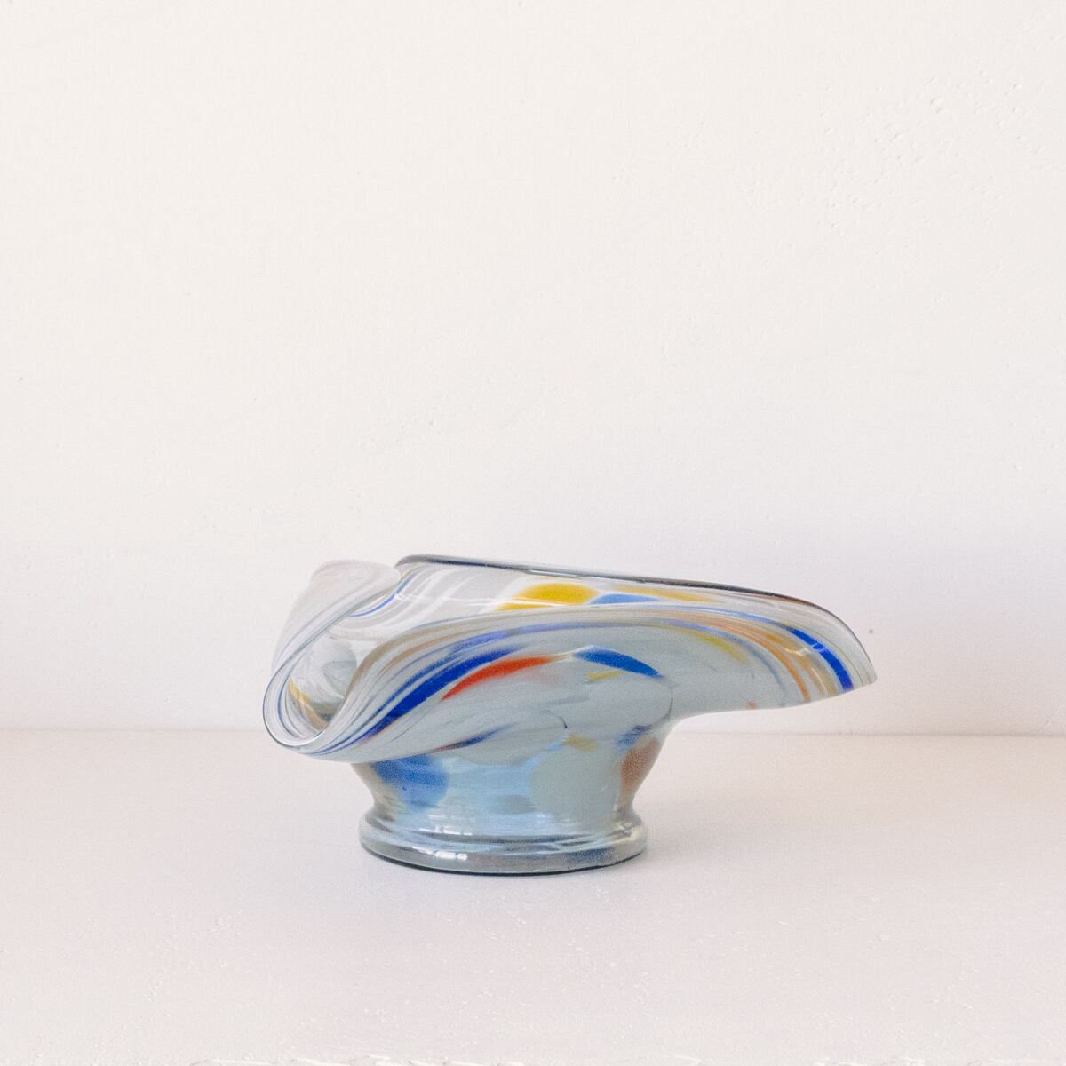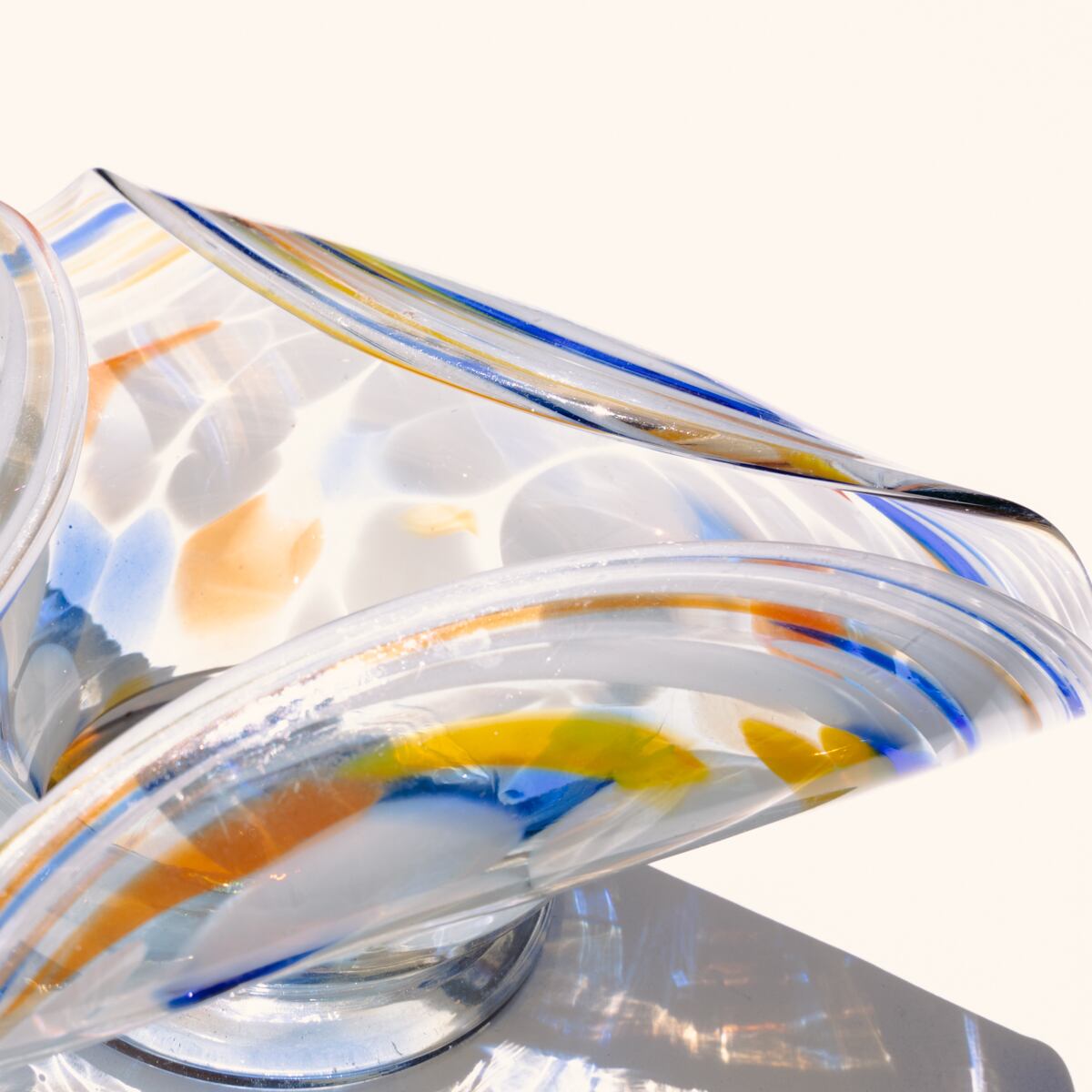 クリアガラスに、ブルー、ホワイト、オレンジ、イエローの入り混じったマーブル模様。
