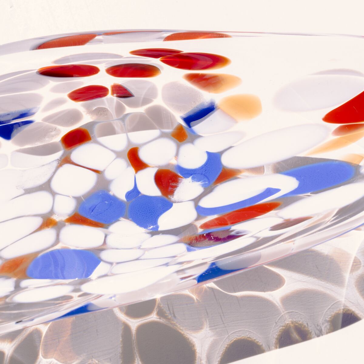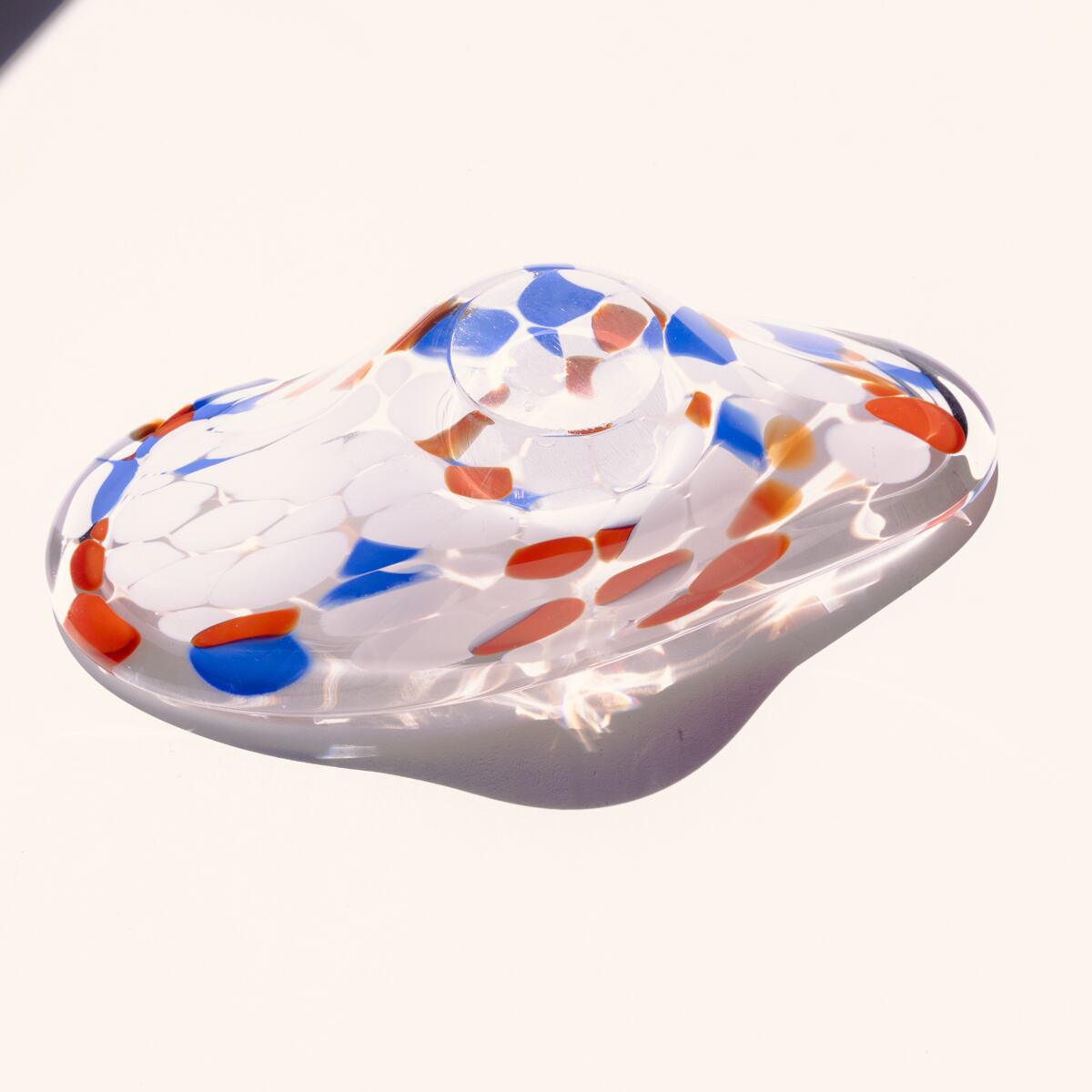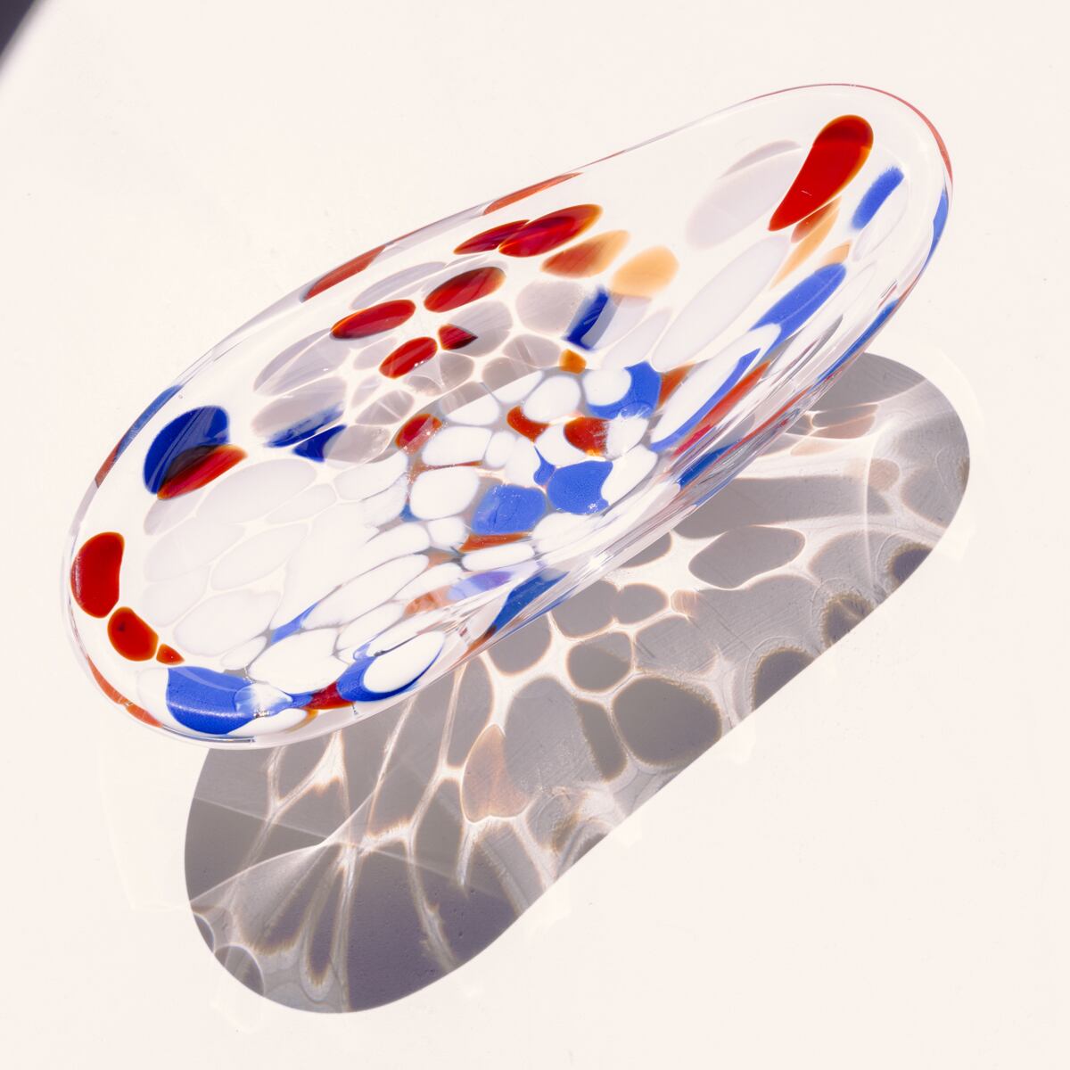 トリコロール(フランスの国旗)の3色、ブルー、ホワイト、レッドのドット模様に彩られた横長フォルムのトレイ。