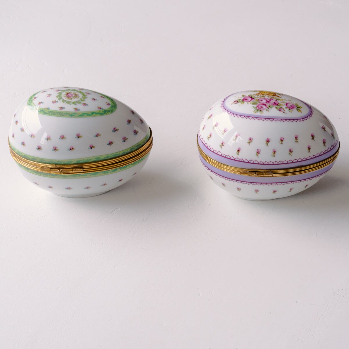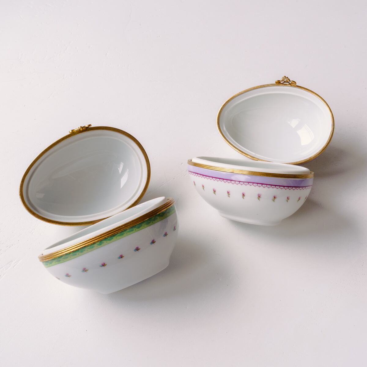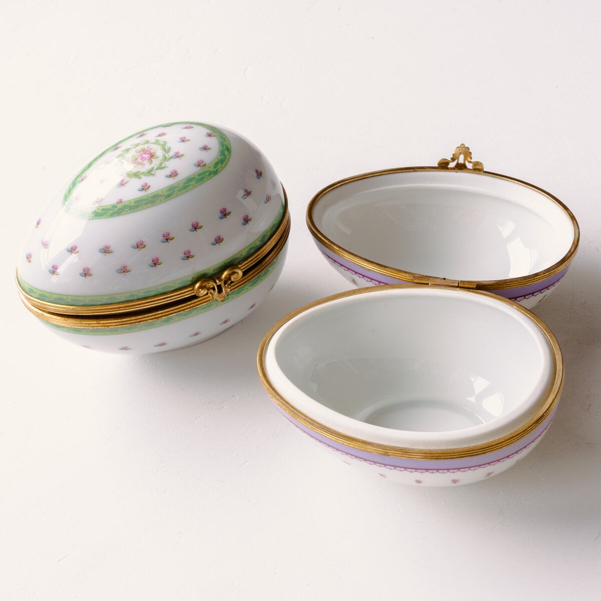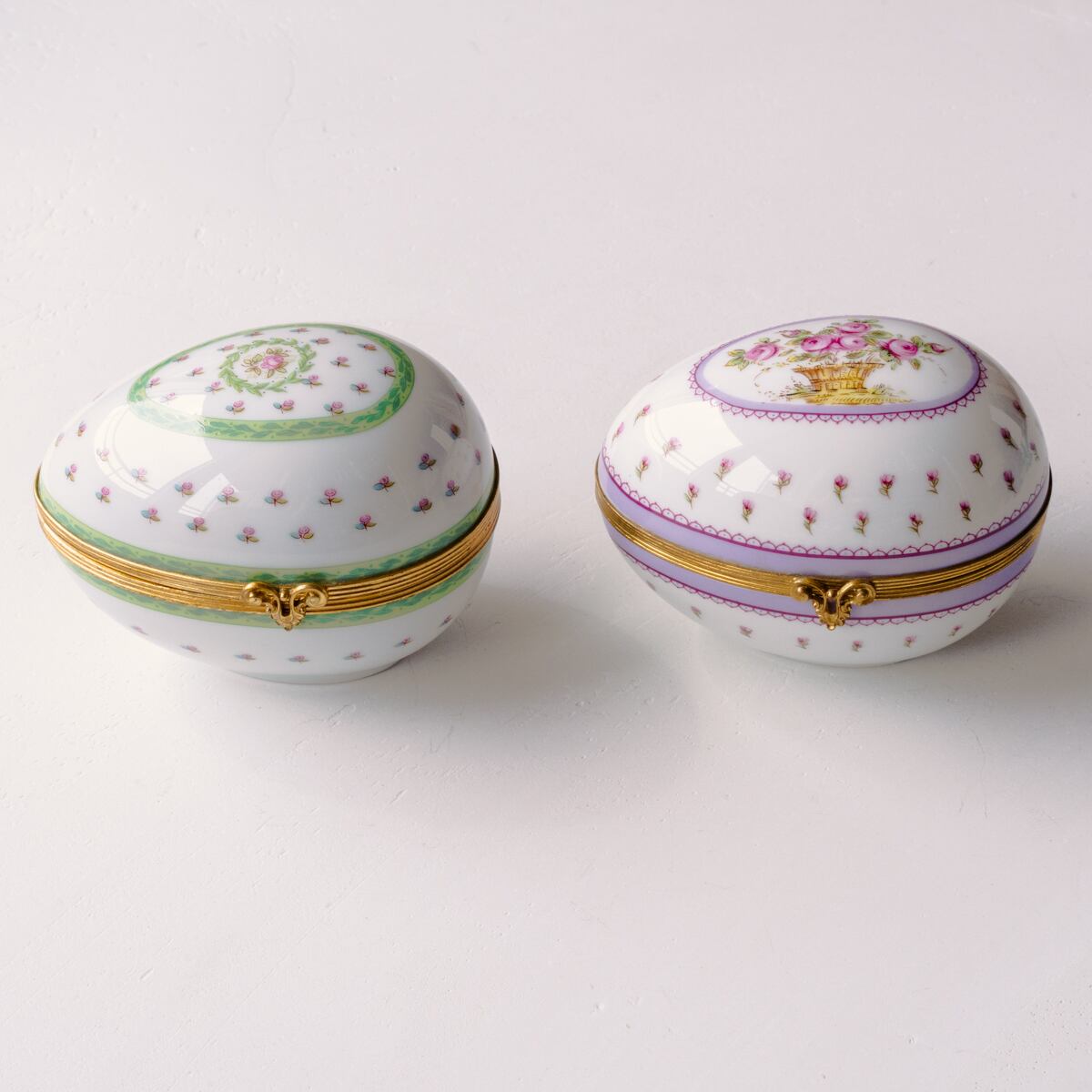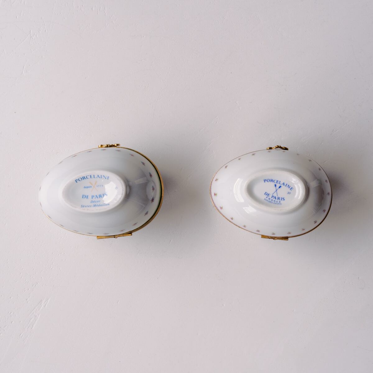 Porcelaine de Parisの白い磁器、ころんとした卵型のフォルムが可愛らしく、薔薇の花や苗木に彩られた華やかなデザイン。