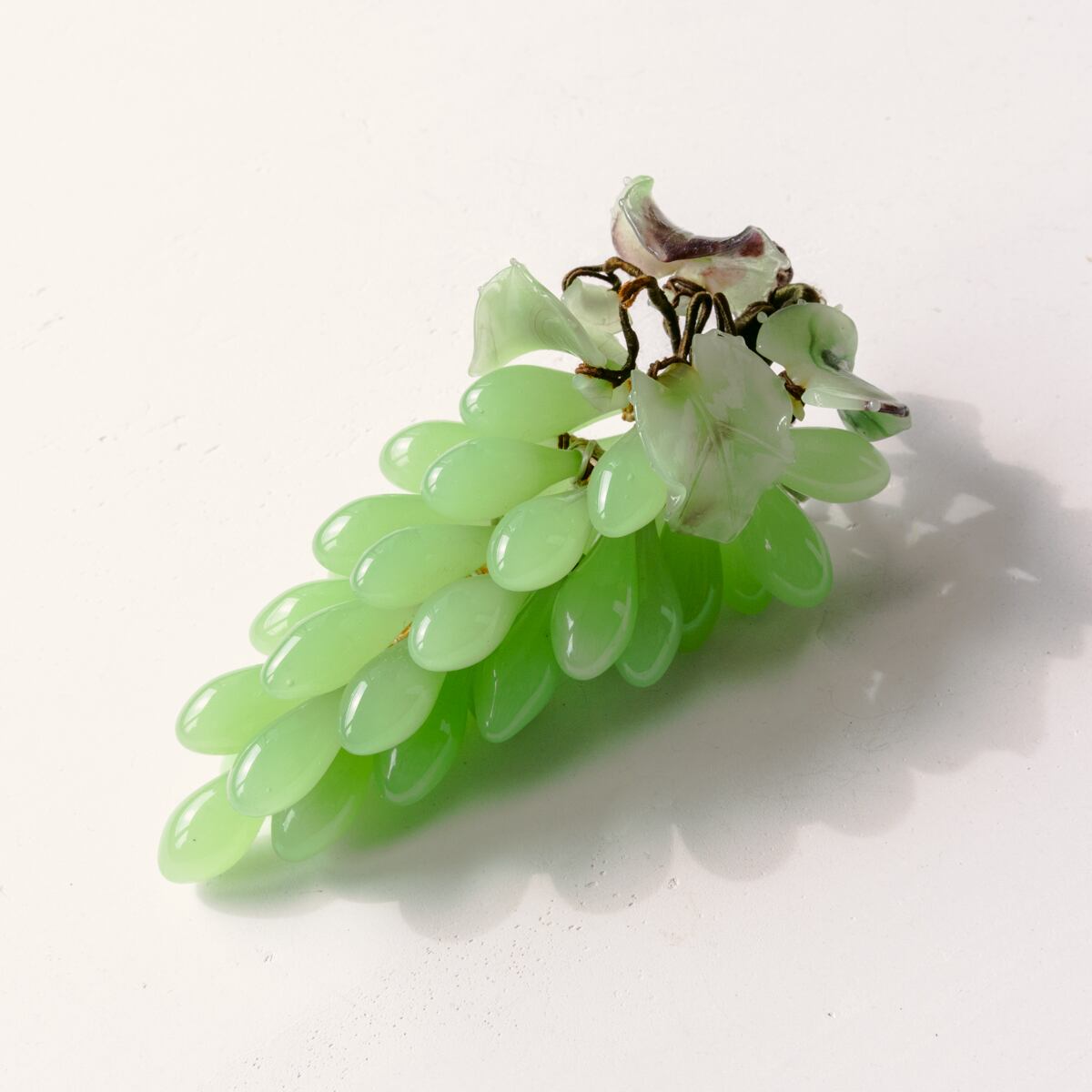葡萄の粒は、可愛らしいミルキーグリーン色でみずみずしく表現され(他のものよりも少し細長い粒の形をしています)、グリーンの葉は、ブラウンのマーブル模様が混じり、葉脈も彫り込まれています。