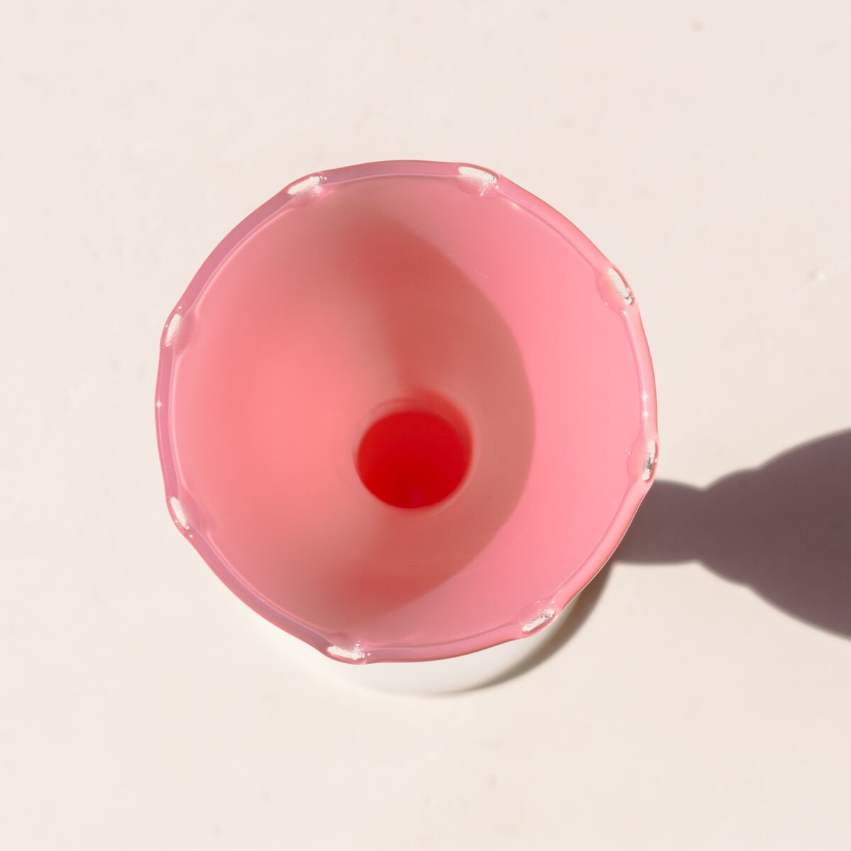 可愛らしく上品なラズベリーピンク、足の台座はホワイトの色合いで、とろみのあるミルキーな質感が美しい花器。