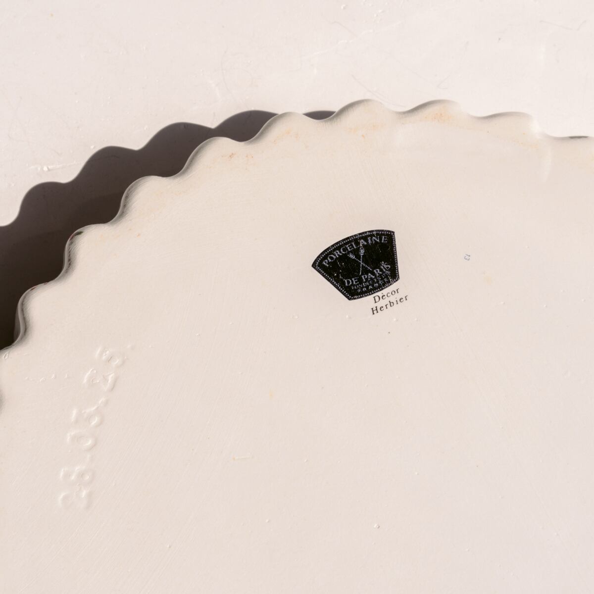 Porcelaine de Parisの白い磁器(下記参照)に、ハーバリウム(植物標本)がたくさん描かれた、華やかな大皿。