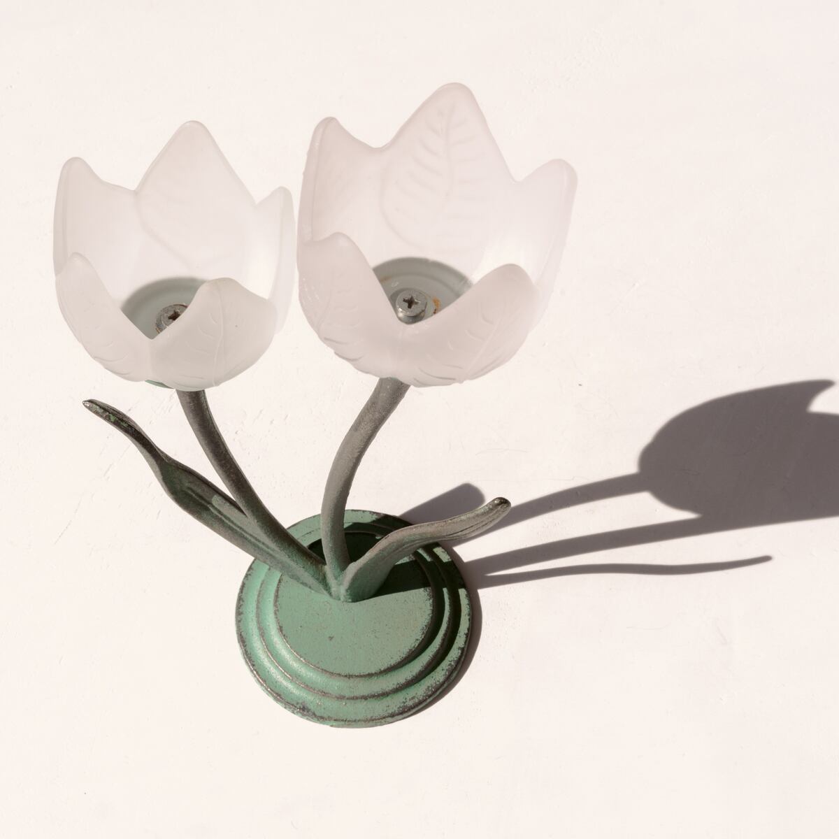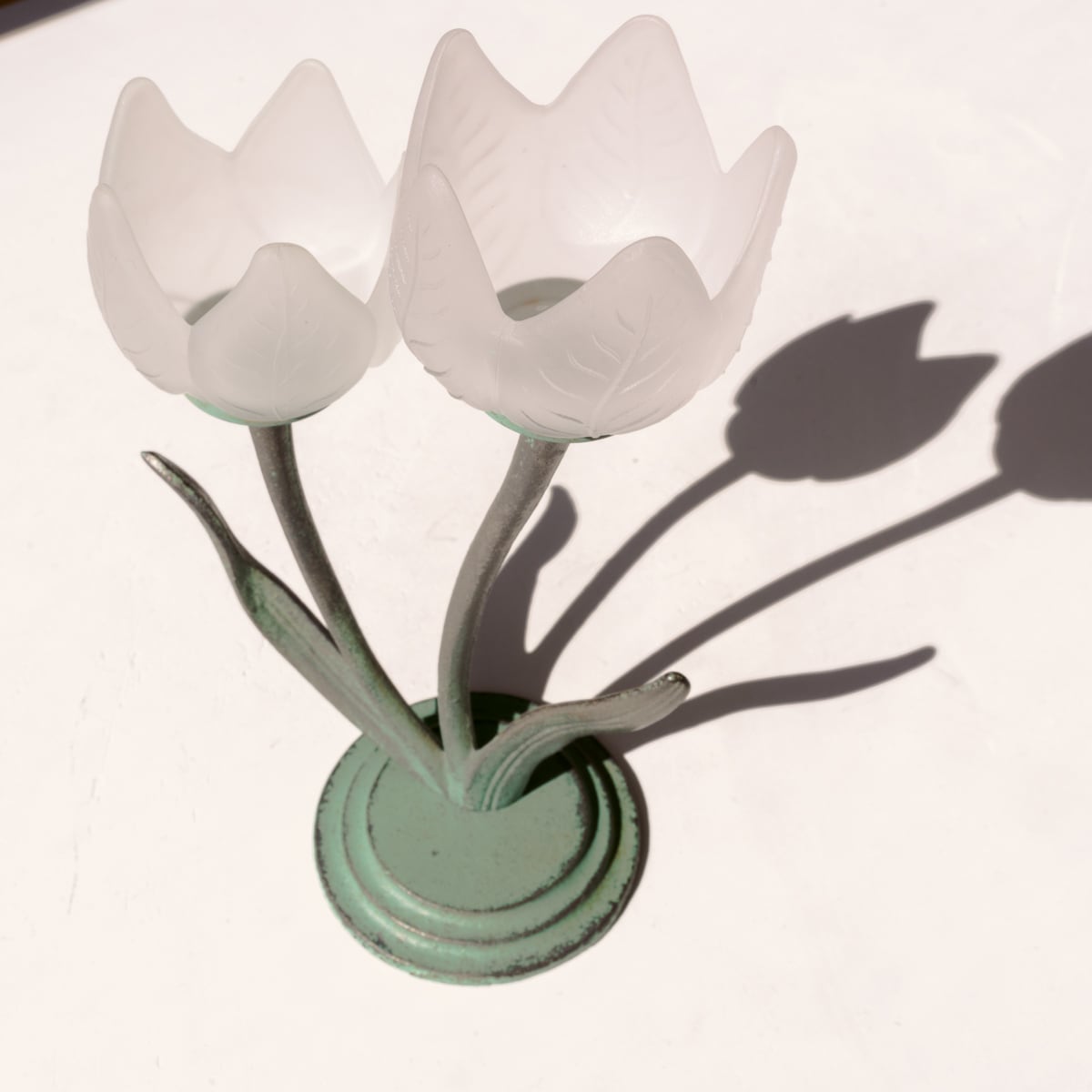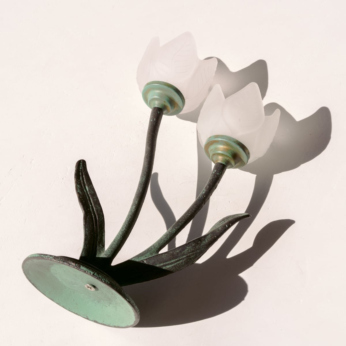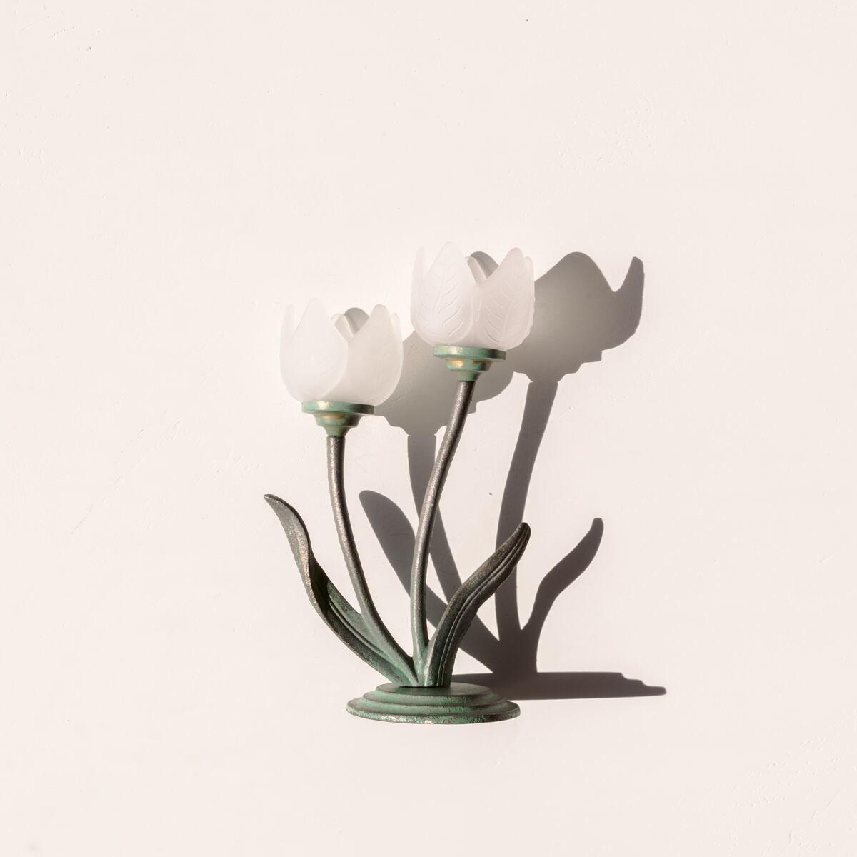 チューリップをモチーフに、2本の花はホワイトのマットガラス、葉のついた茎はグレーがかったグリーンの金属で表現されています。