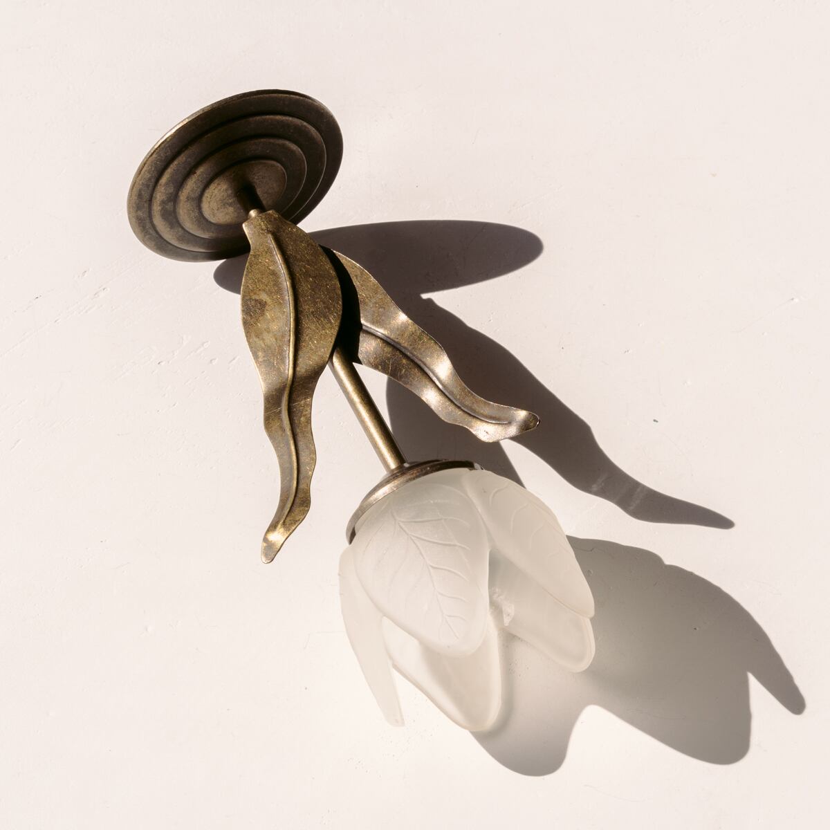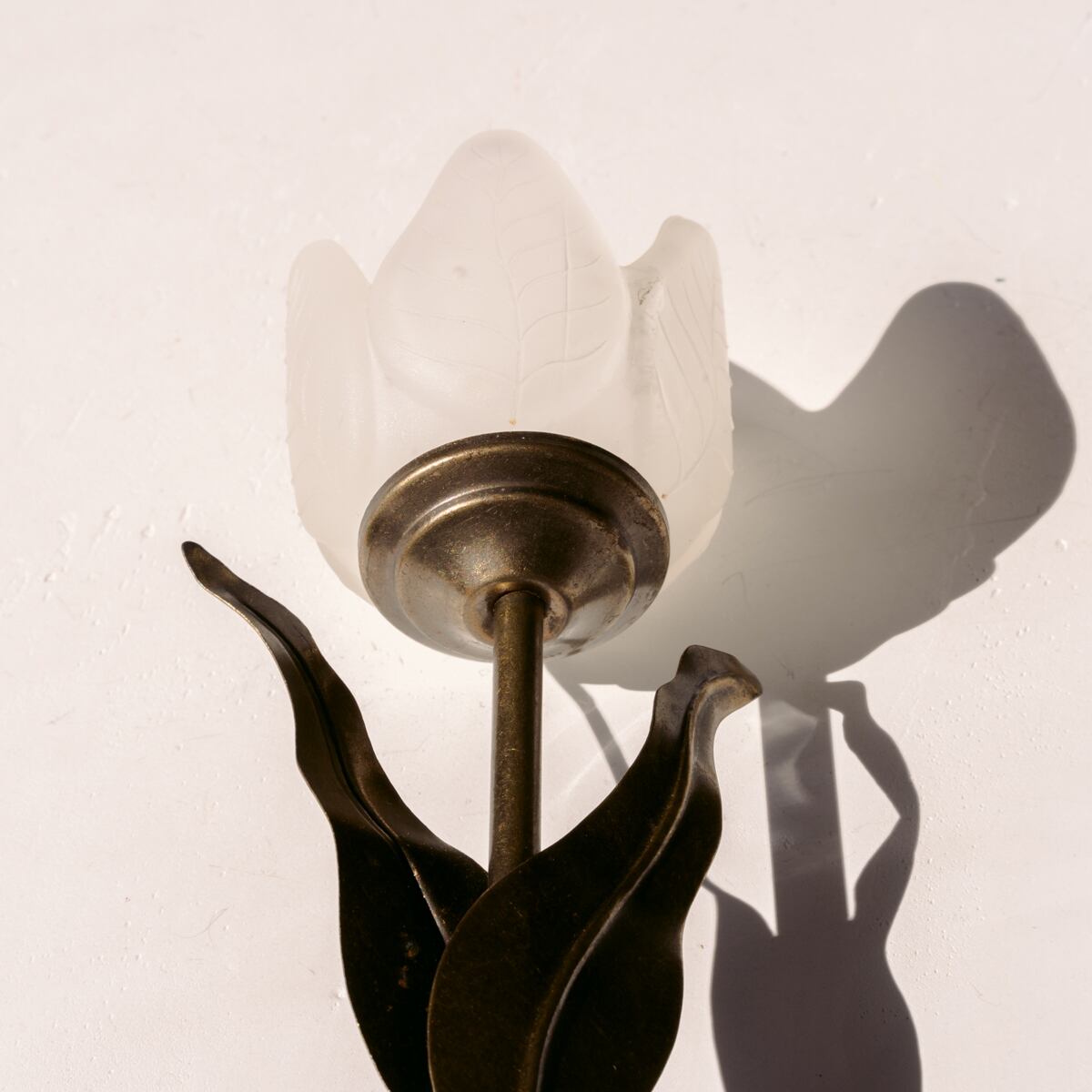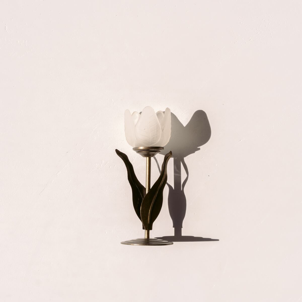 チューリップをモチーフに、花はホワイトのマットガラス、葉のついた茎はブロンズで表現されています。