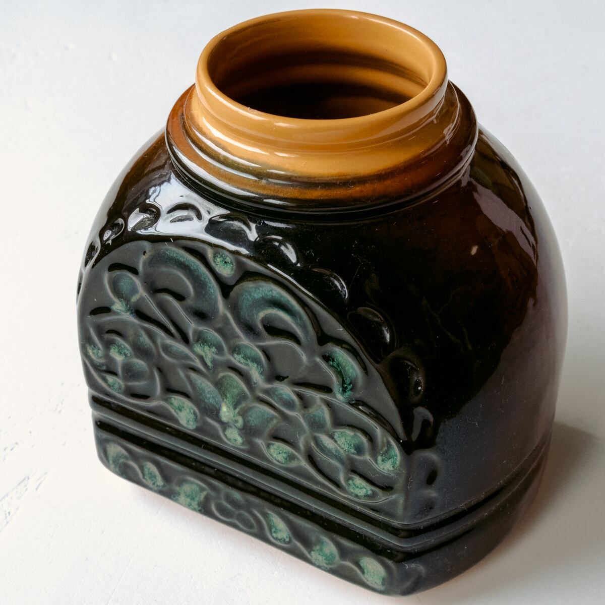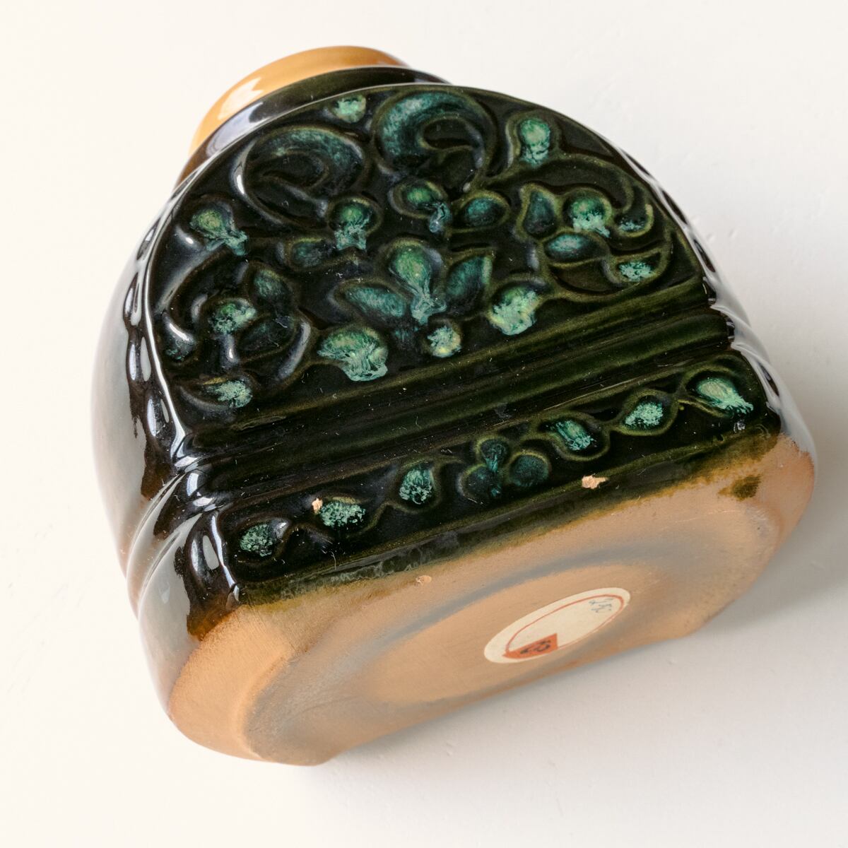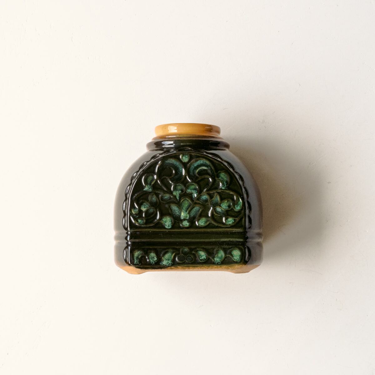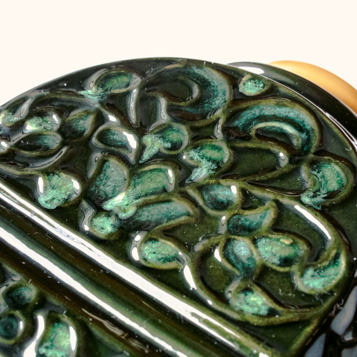 全体的には深緑〜ブラウンの色味で、両面に草花の模様が彫られており所々にライトグリーンの色付けがされています。