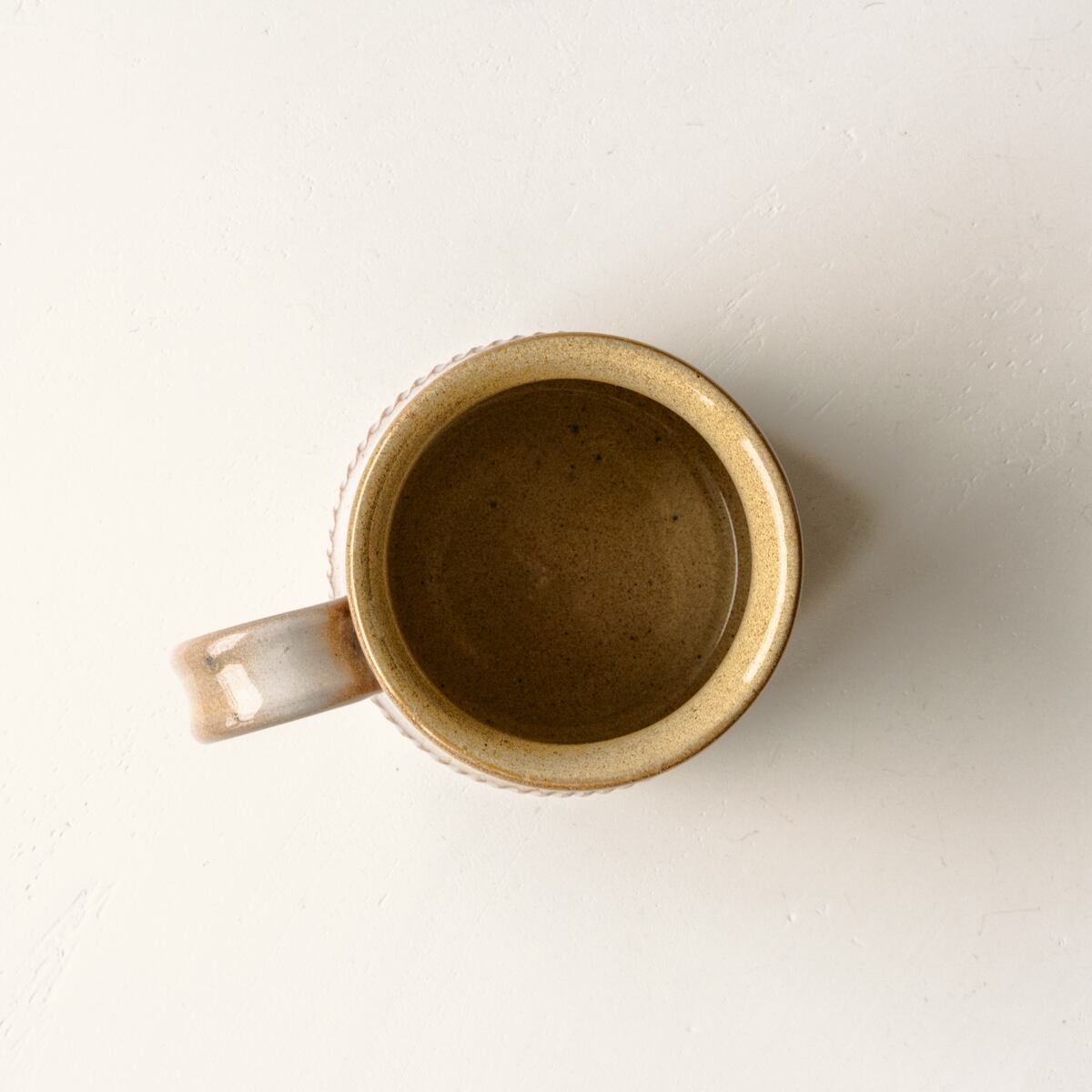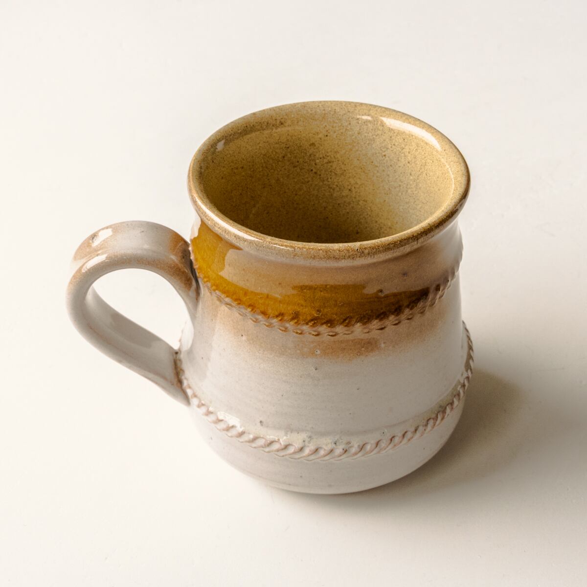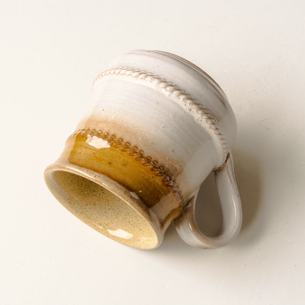 陶器ならでは味わいと、艶のあるまろやかな釉薬が美しく、ラテブラウン〜ホワイトの色味・ぐるっと一周ほどこされた装飾も魅力的です。