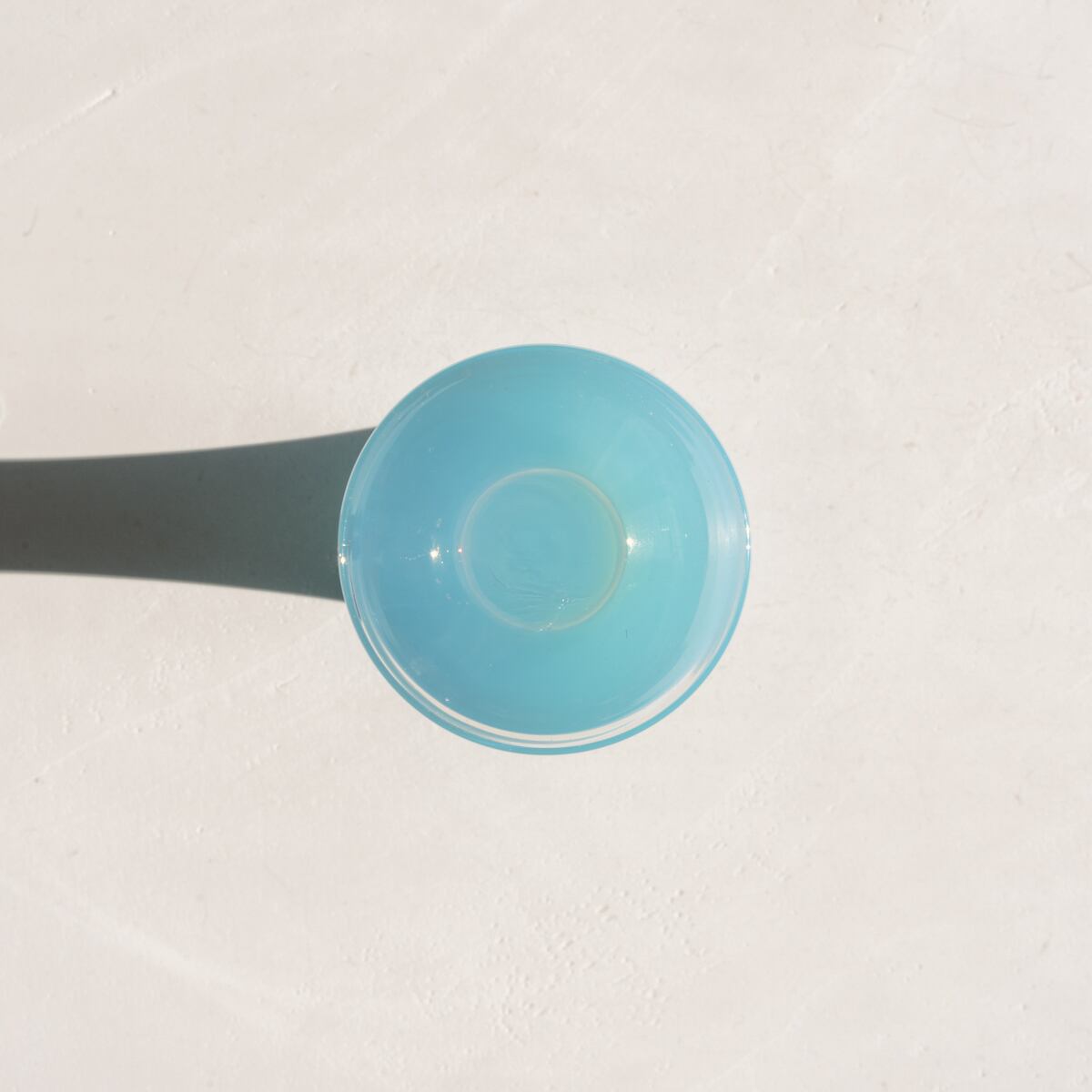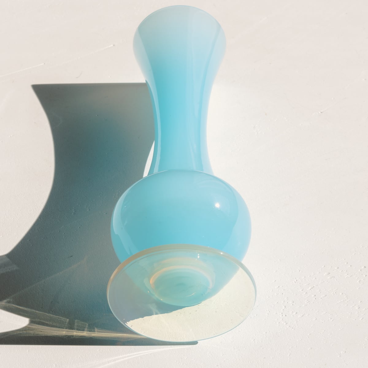 優しいパウダーブルー、足の台座はホワイトの色合いで、とろみのあるミルキーな質感が美しい花器。