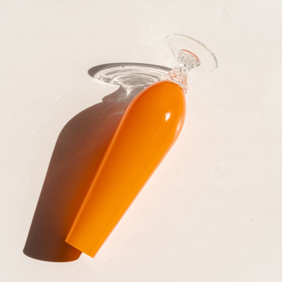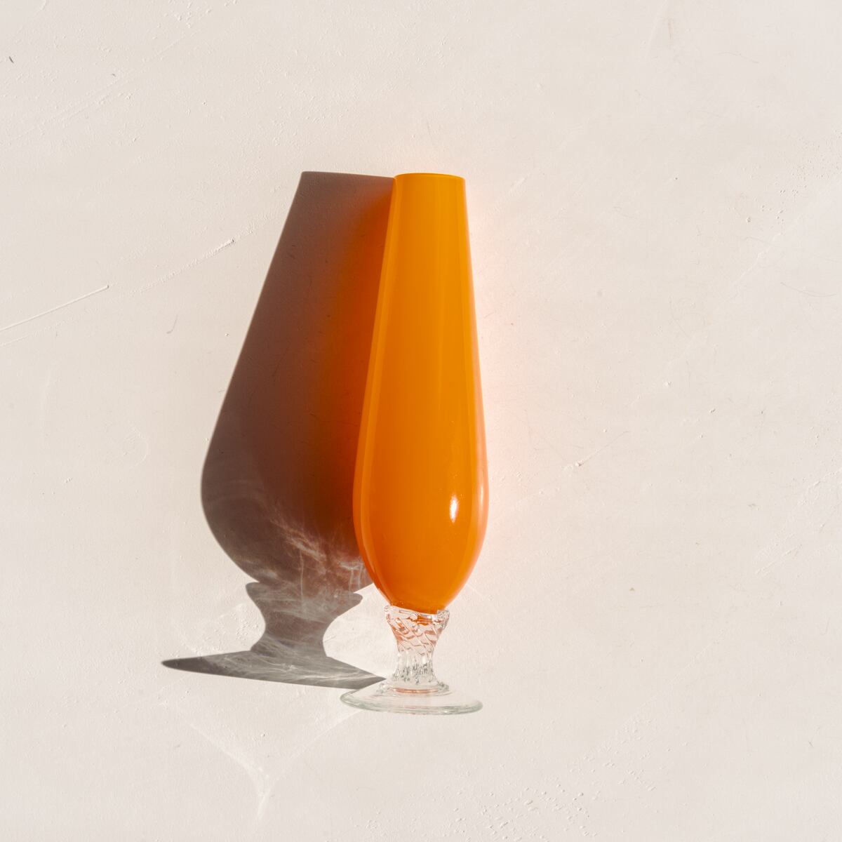 ミルキーなオレンジの色味となめらかな質感が絶妙で、クリアガラスの部分のツイスト装飾も素晴らしいミッドセンチュリーな作品。