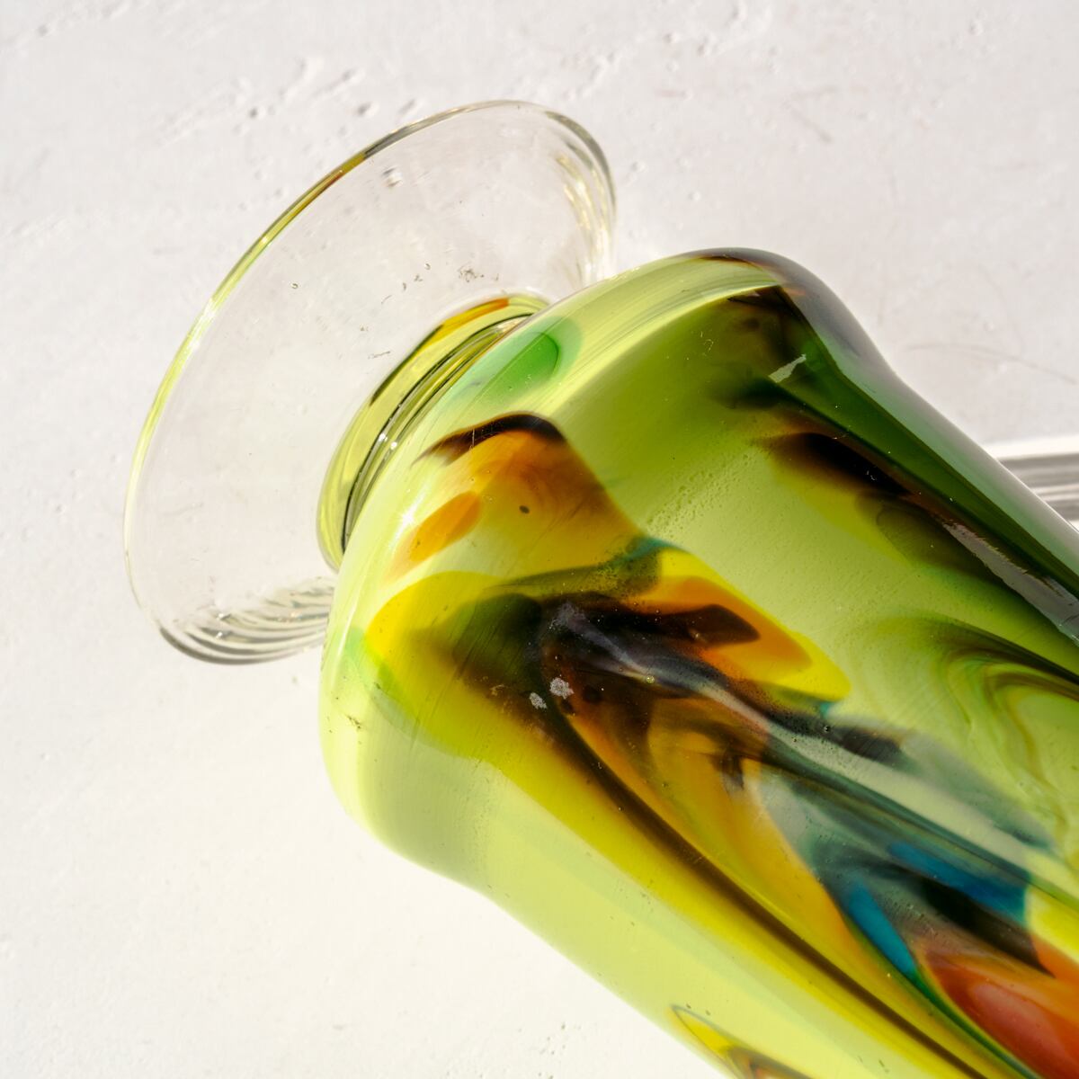 流れるように描かれた水彩模様は、よくみると、レッド・オレンジ・イエロー・ブルーなど、様々な色に変化しながら、花器全体を彩ってくれています。
