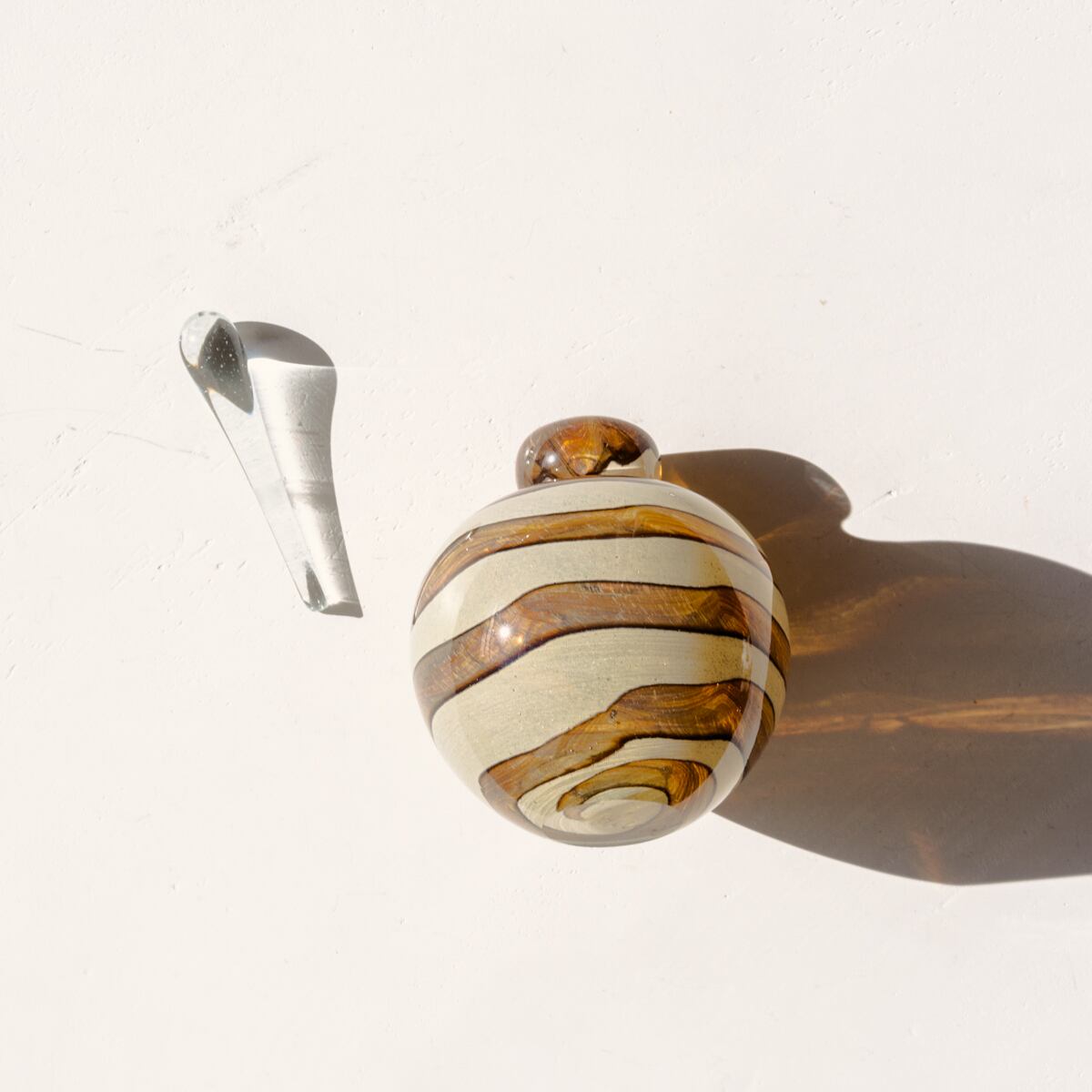 上から渦を巻くようなブラウンとベージュのボーダー模様が美しく、ガラスの厚みがシルエットの素材感引き出します。