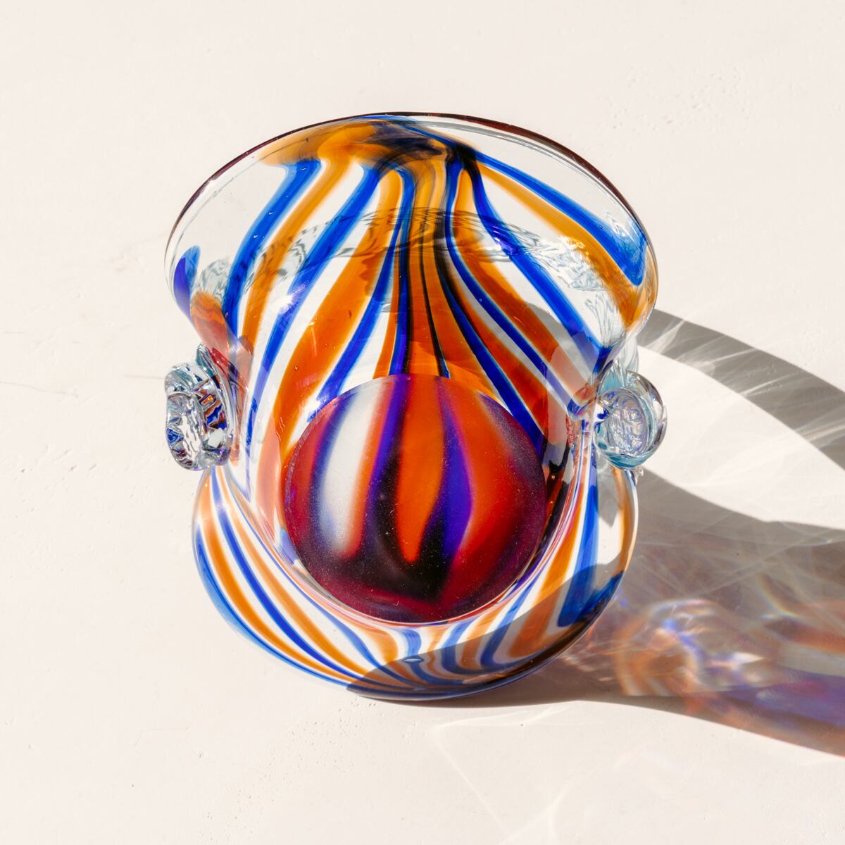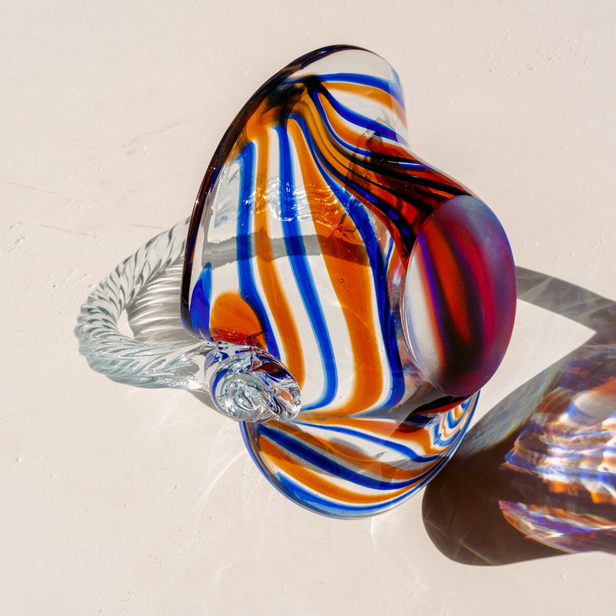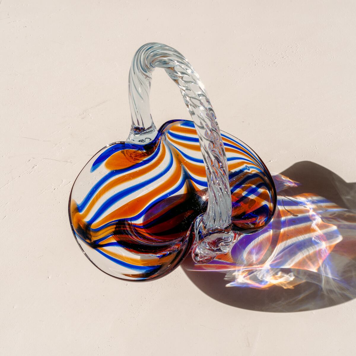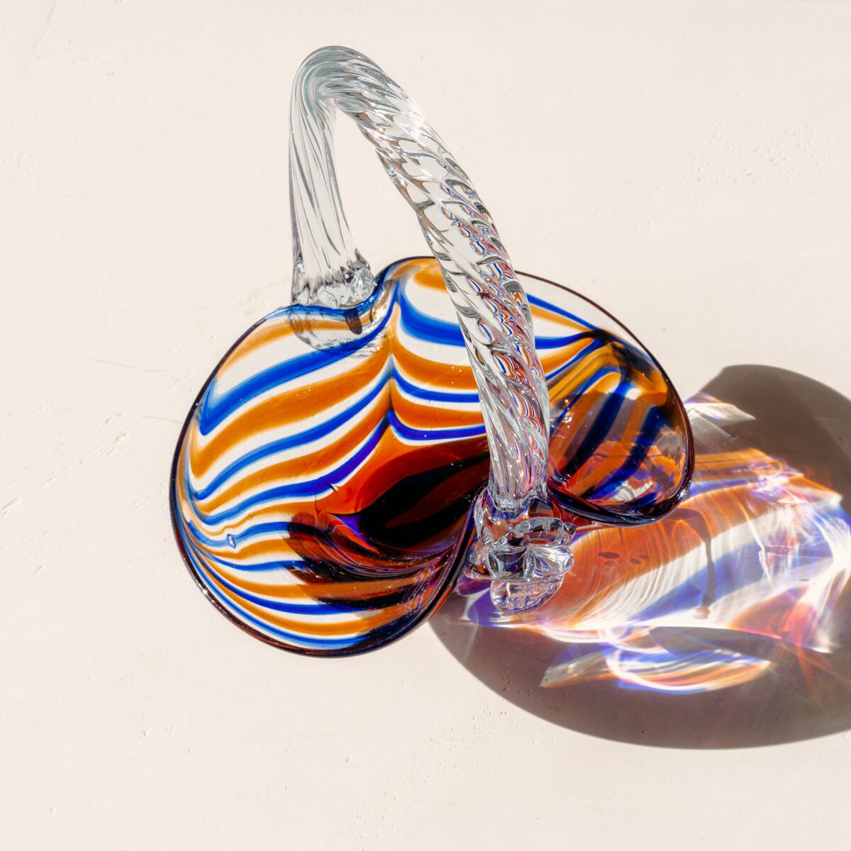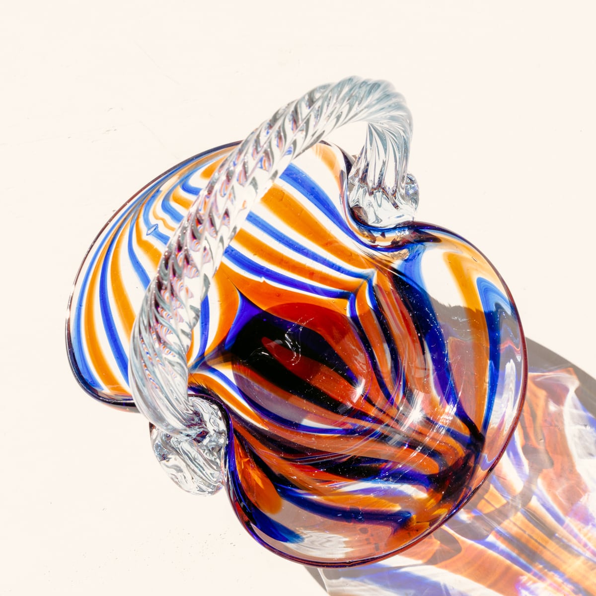 鮮やかなボーダー模様が美しく、持ち手にも凝った装飾がほどこされています。