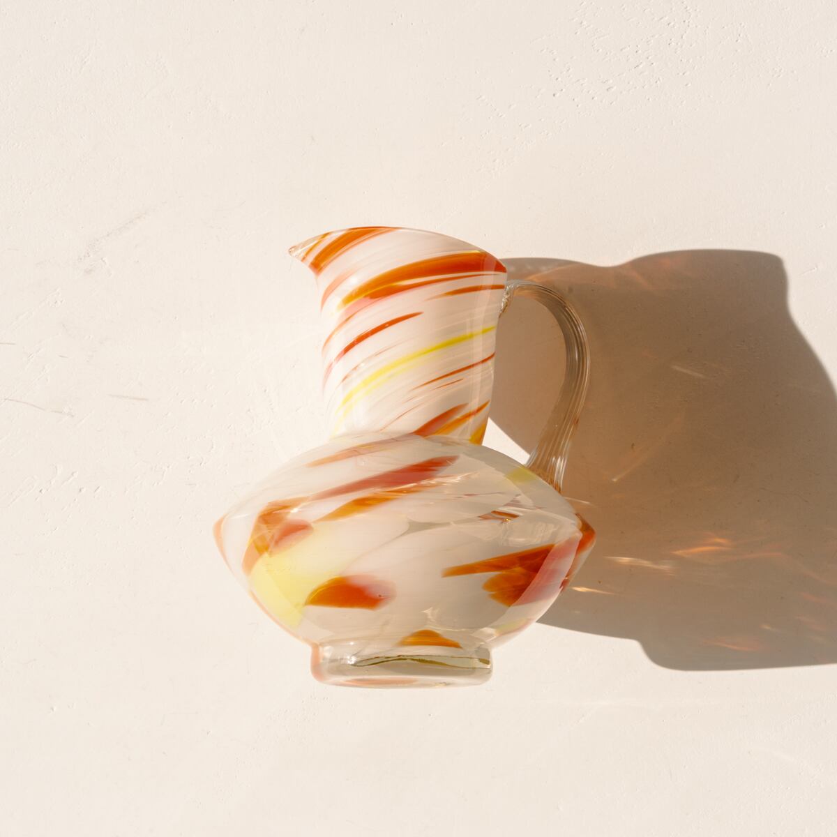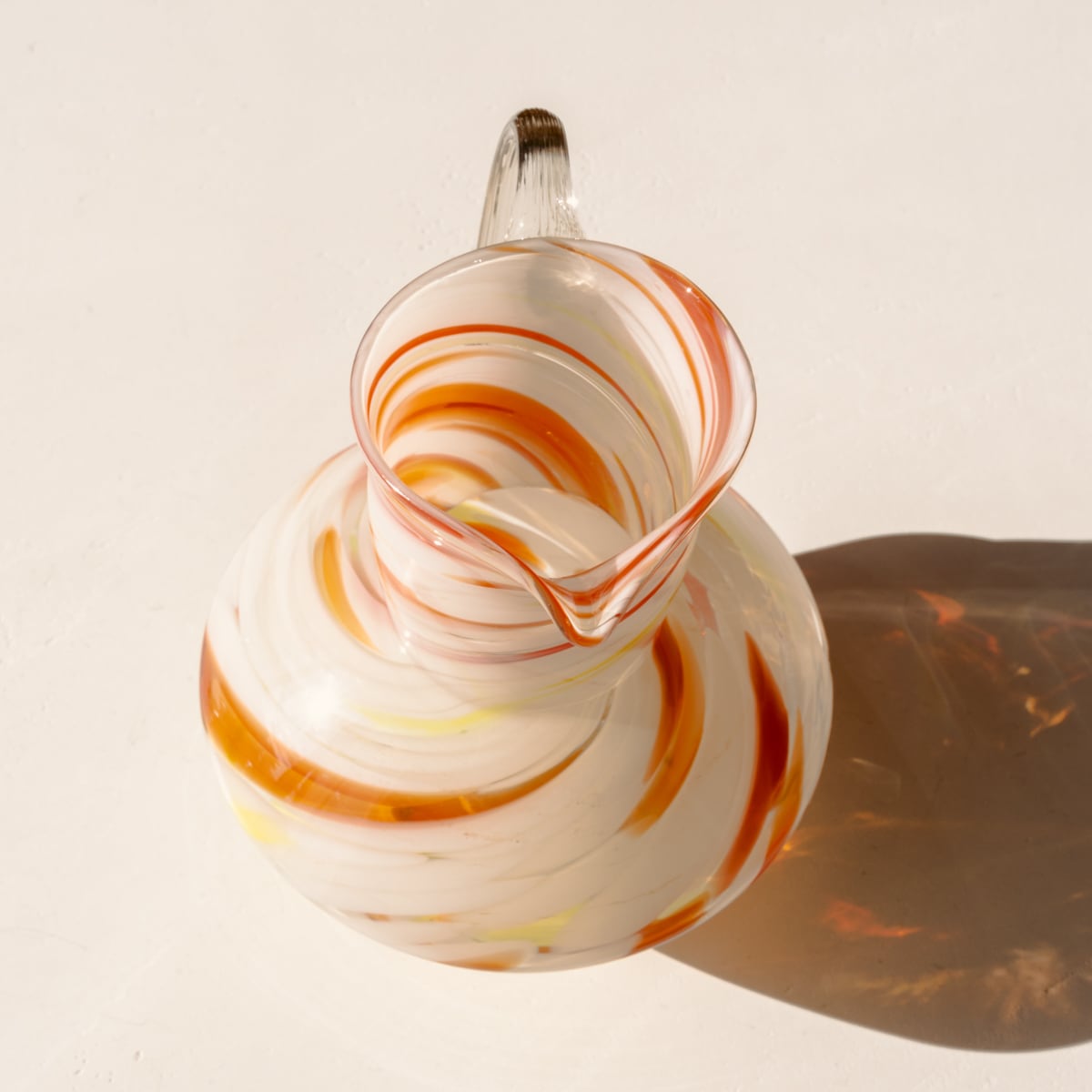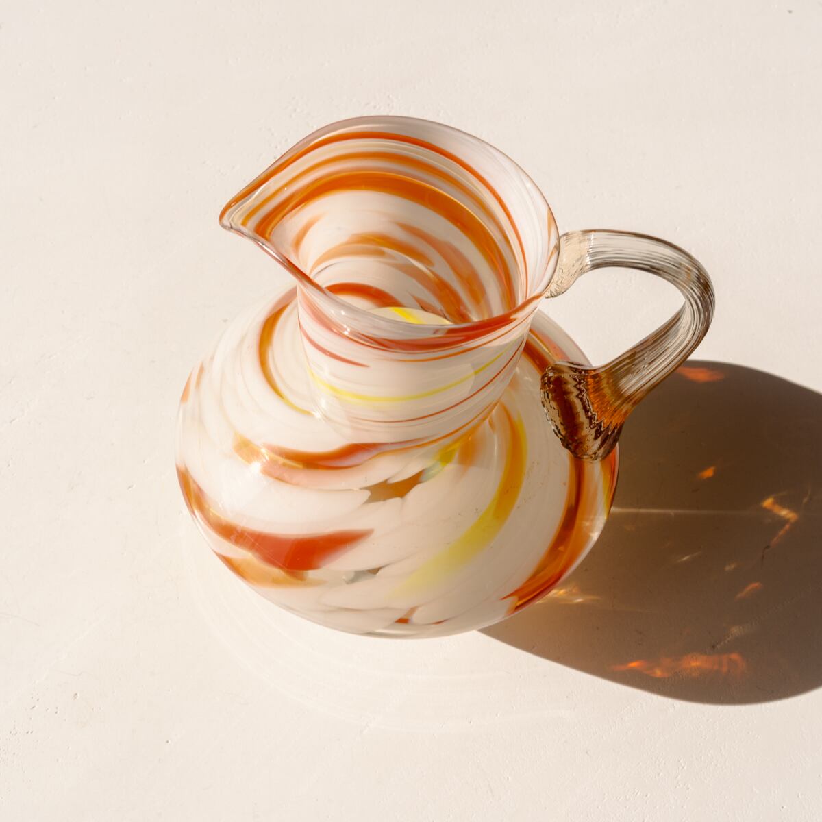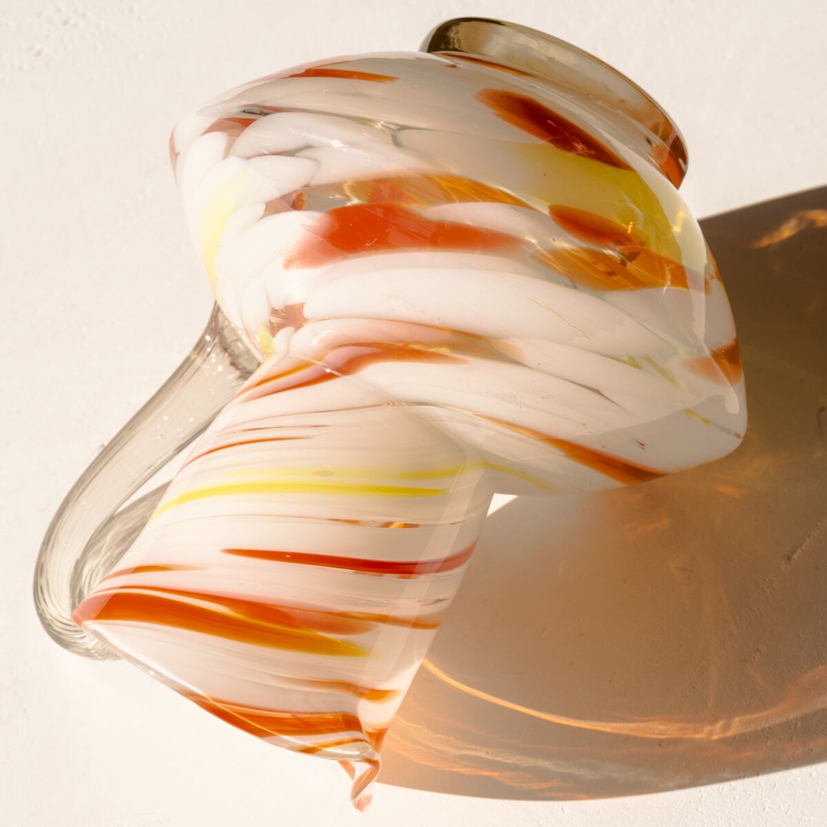 ホワイトをベースに、オレンジ、イエローが入り混じり、流れるような渦巻き模様に彩られています。