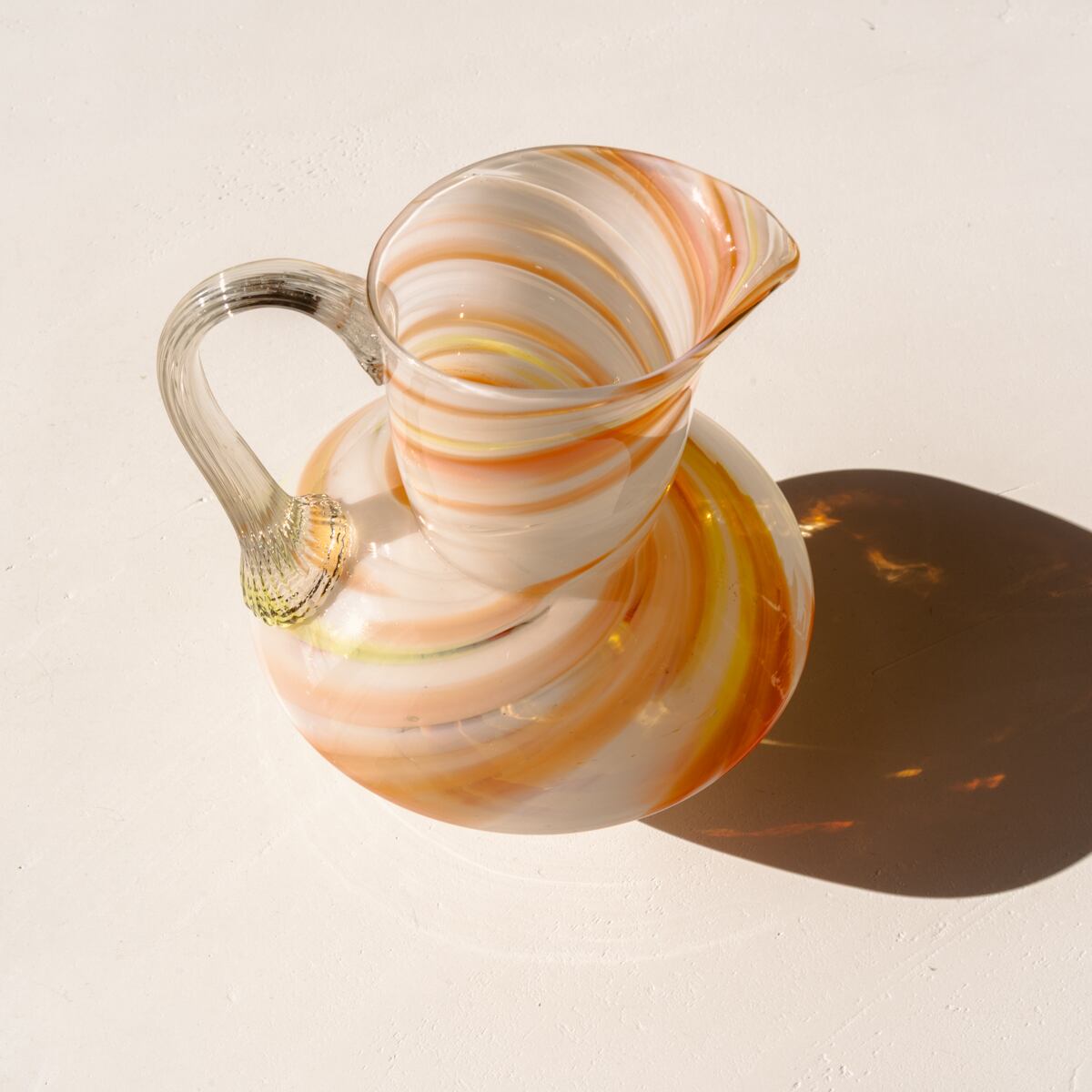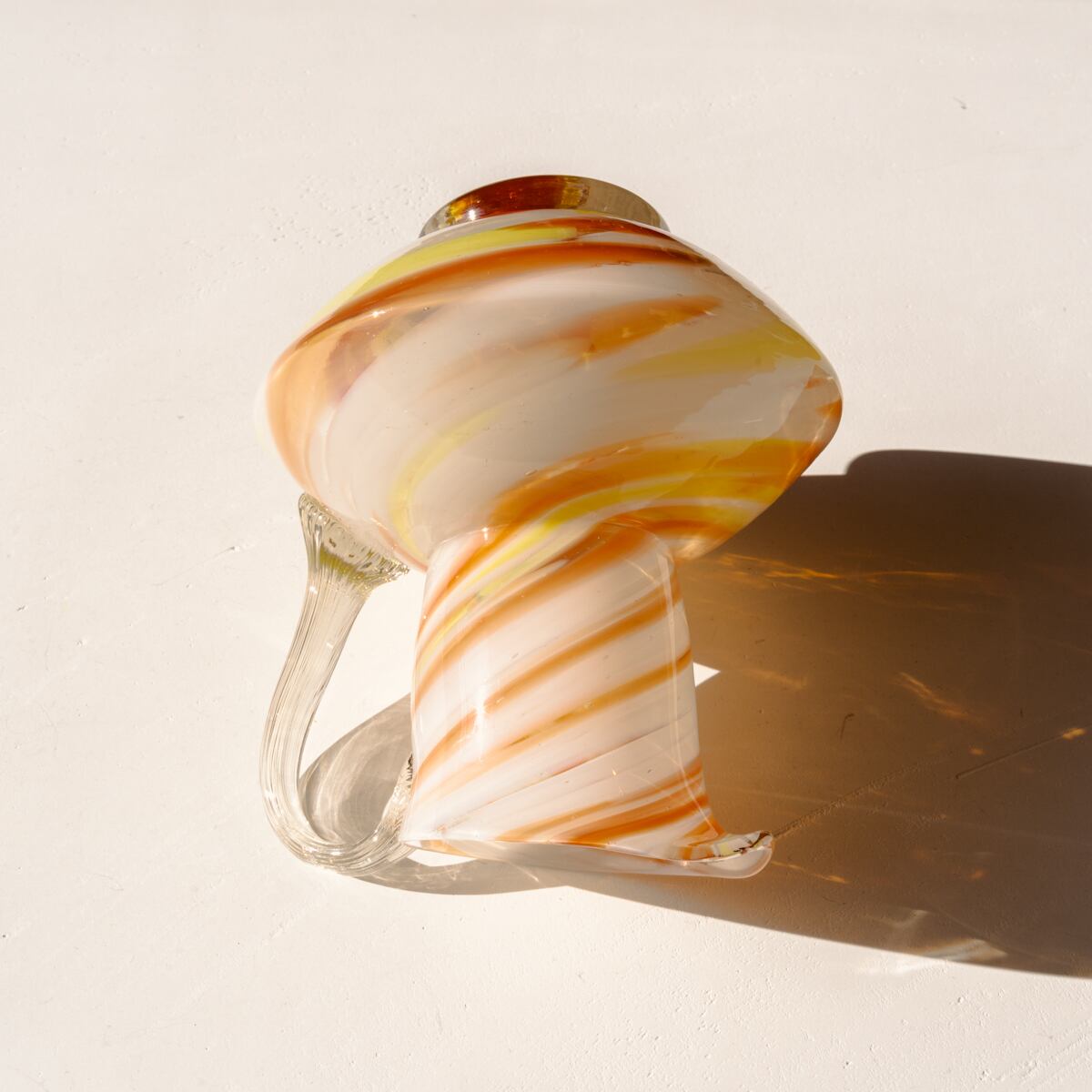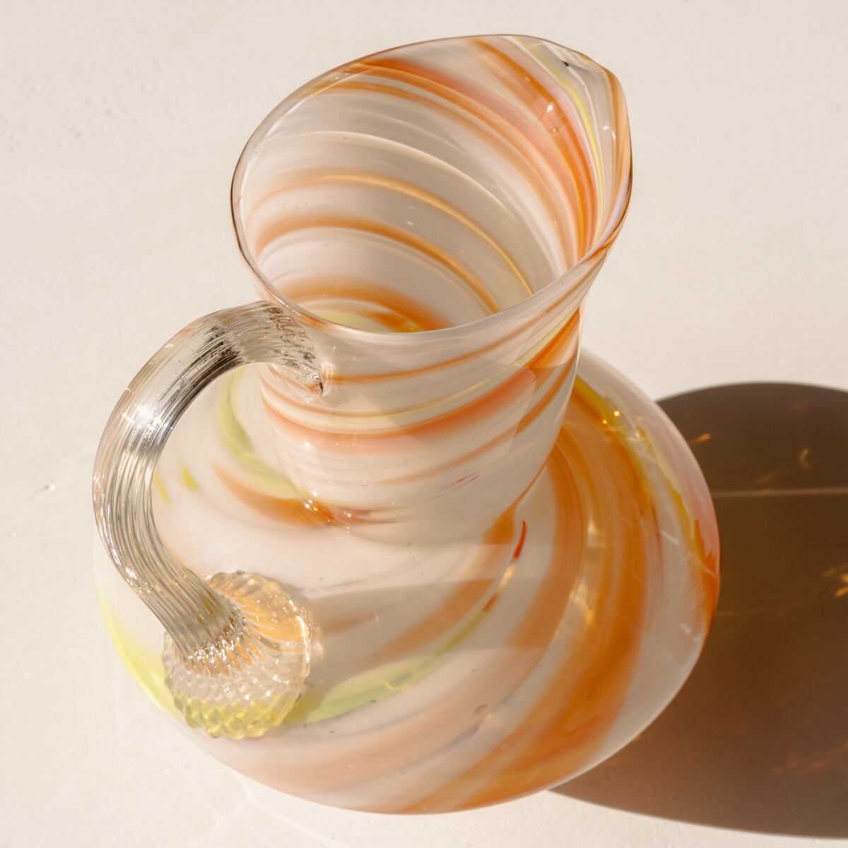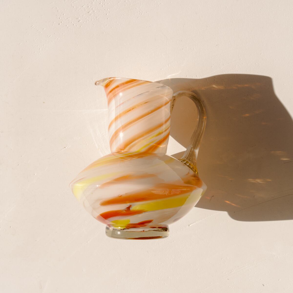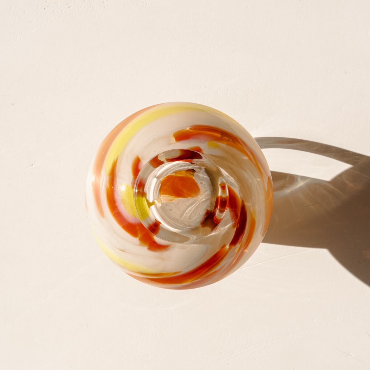 ホワイトをベースに、オレンジ、イエローが入り混じり、流れるような渦巻き模様に彩られています。