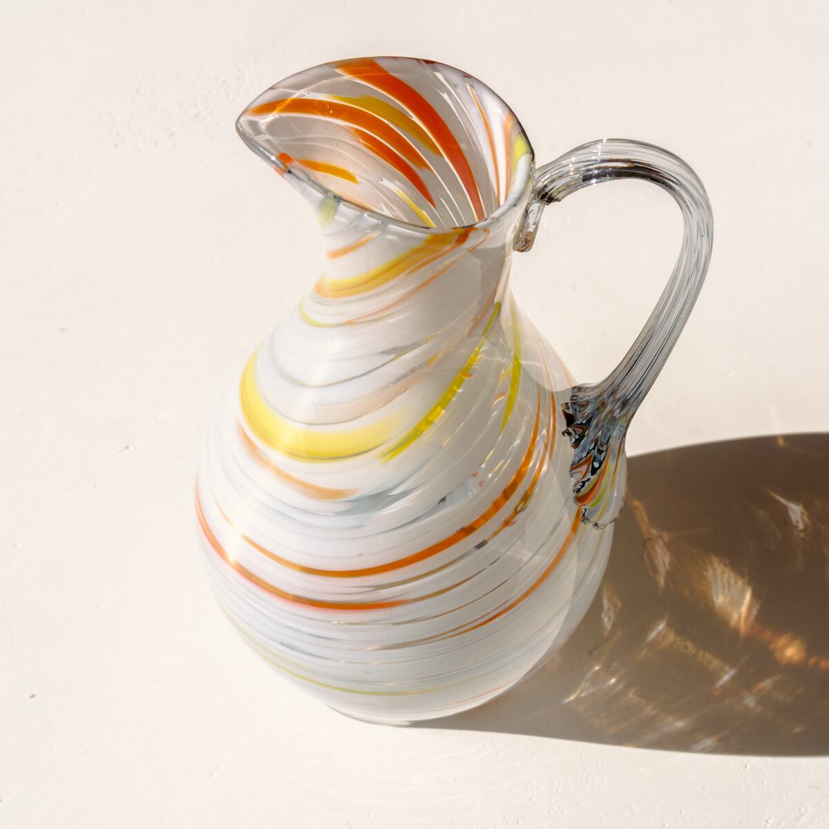 ホワイトをベースに、オレンジ、イエローが入り混じり、流れるような渦巻き模様に彩られています。