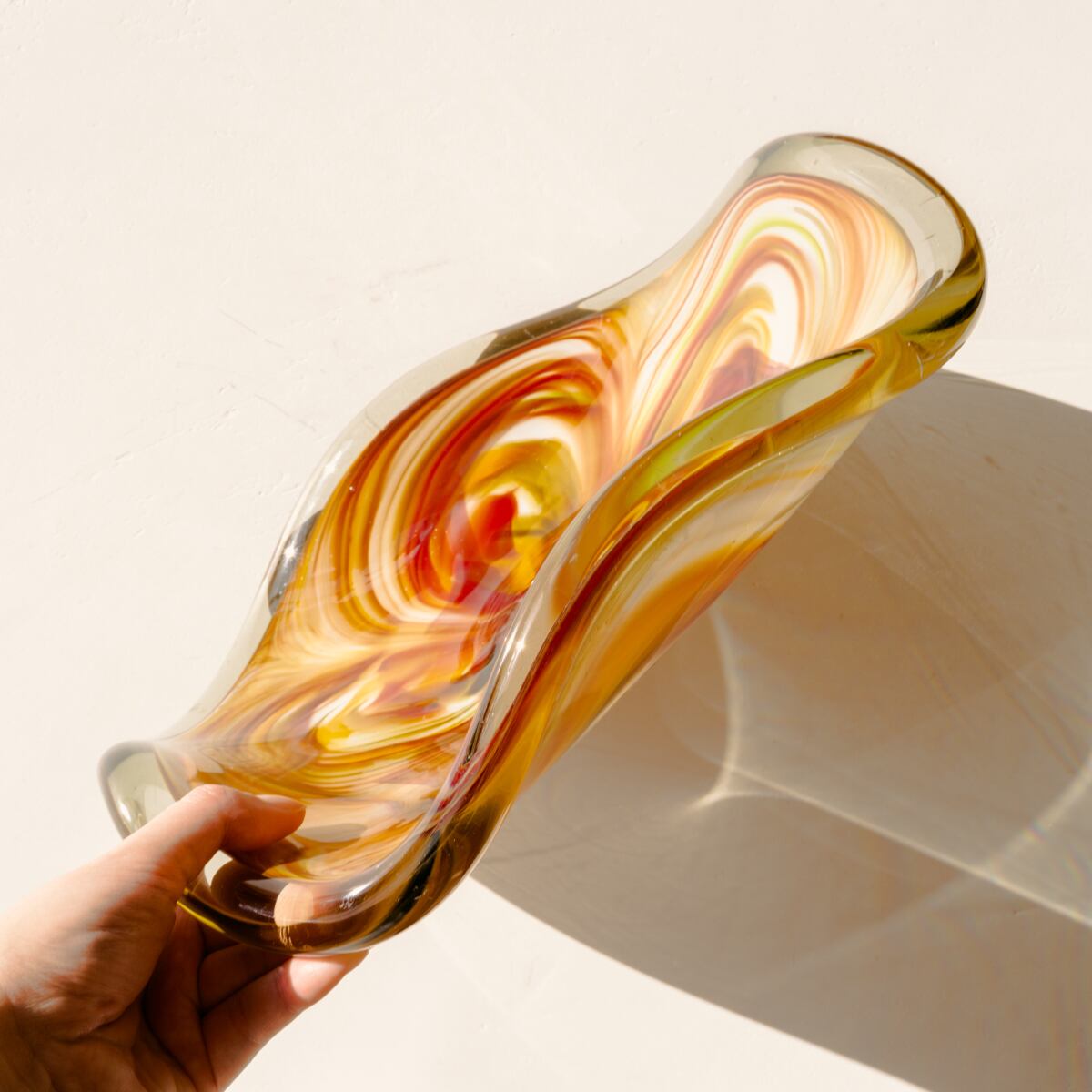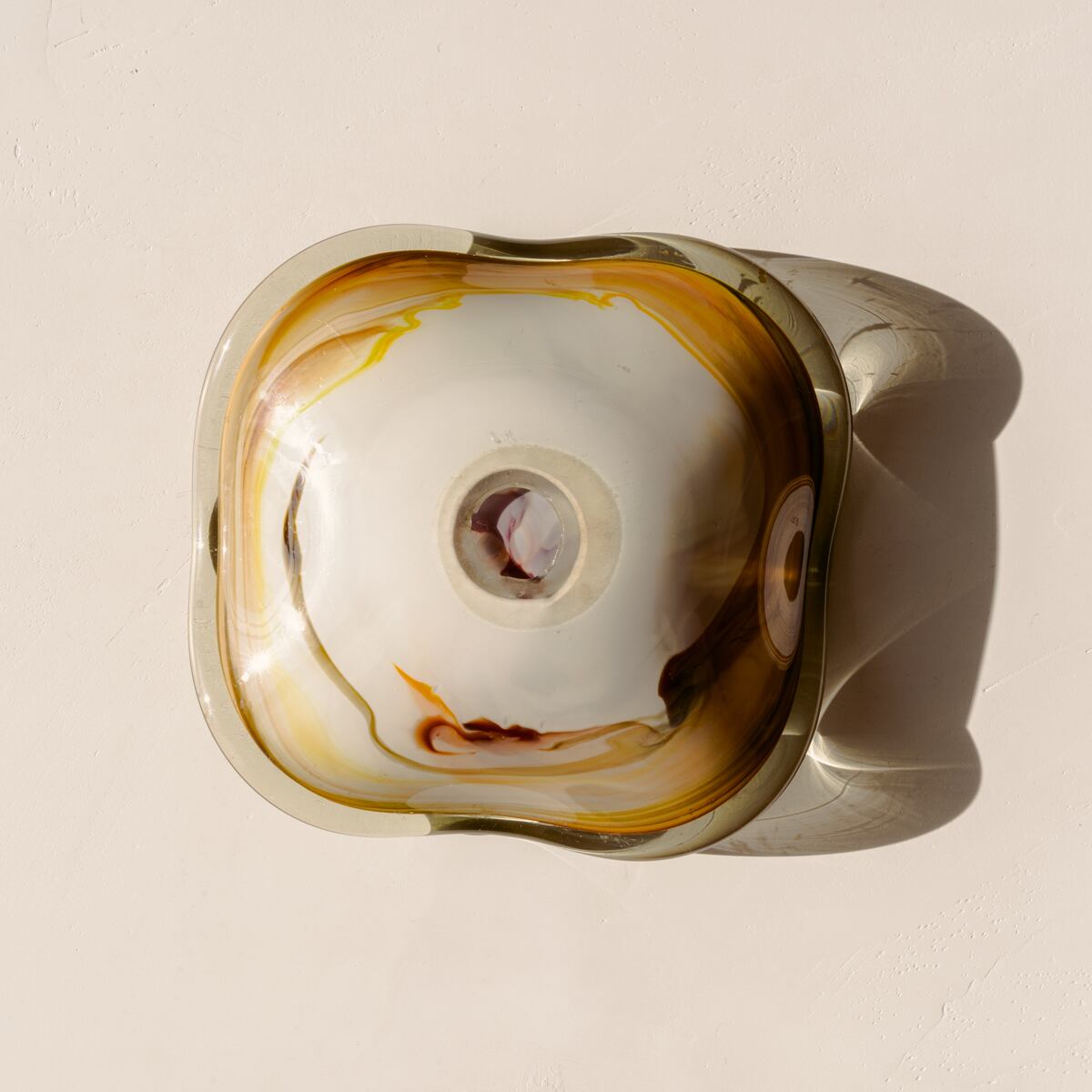 ホワイトをベースに、ブラウンレッド、ライムグリーン、イエロー、オレンジなどの色が入り混じった、流れるような渦巻き模様に彩られています。