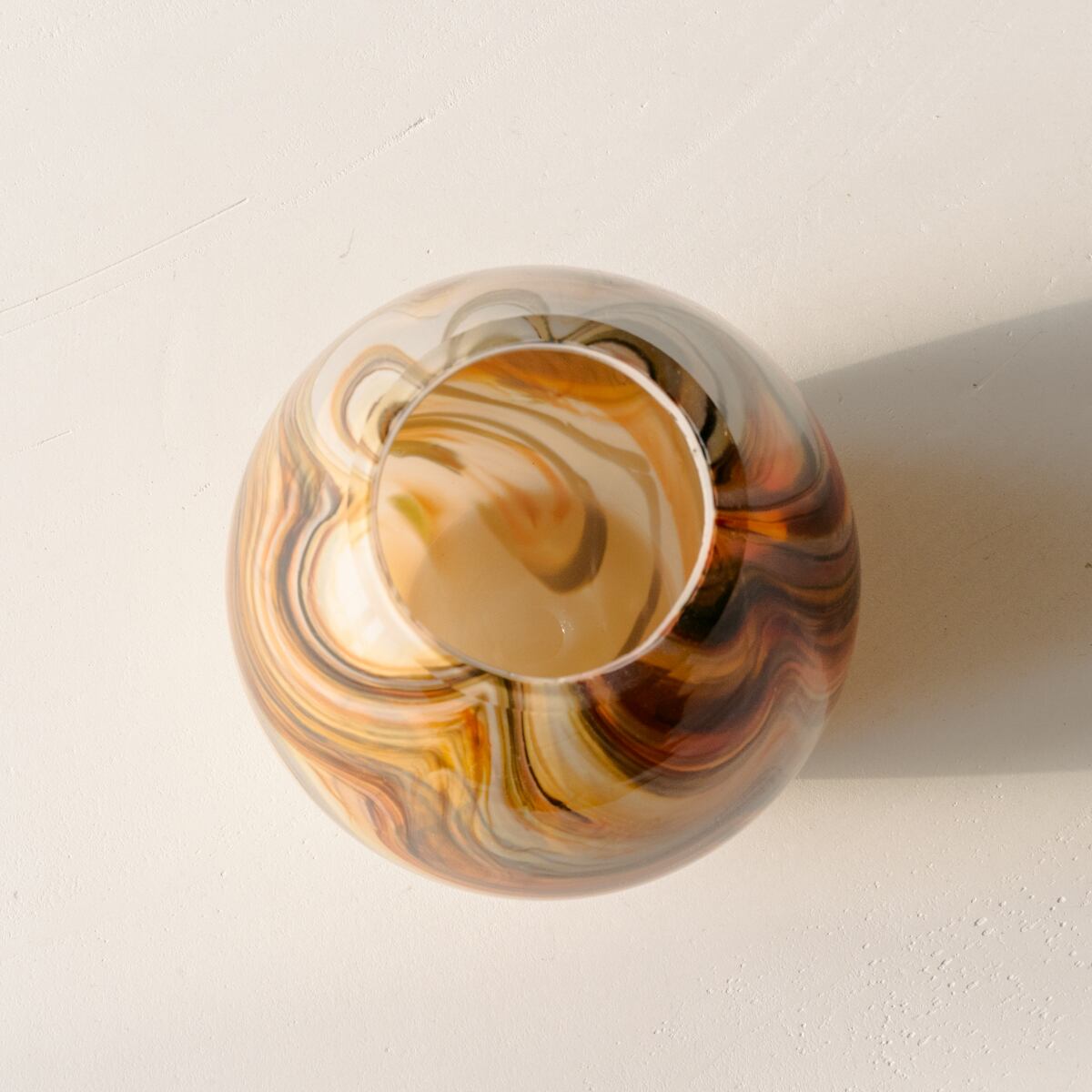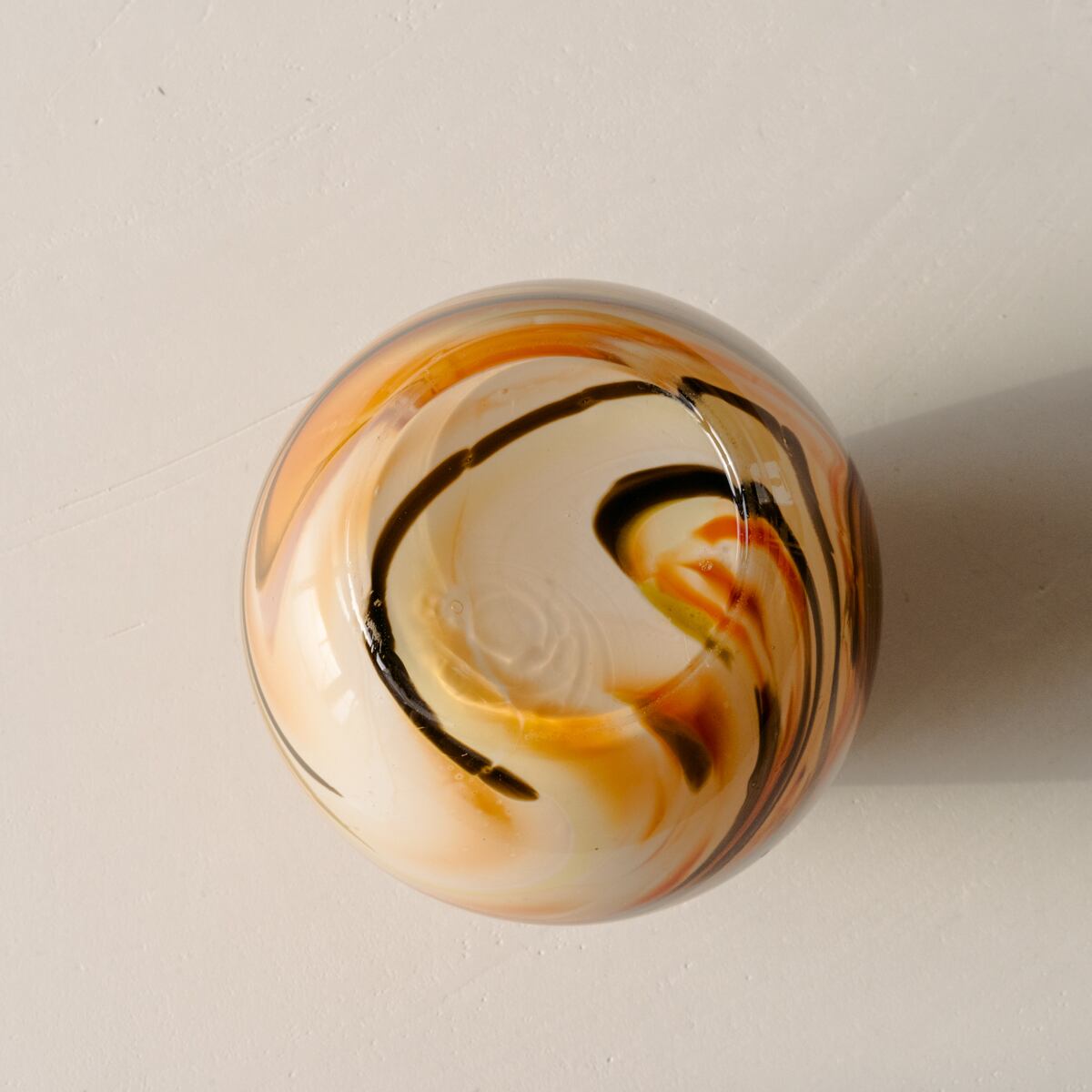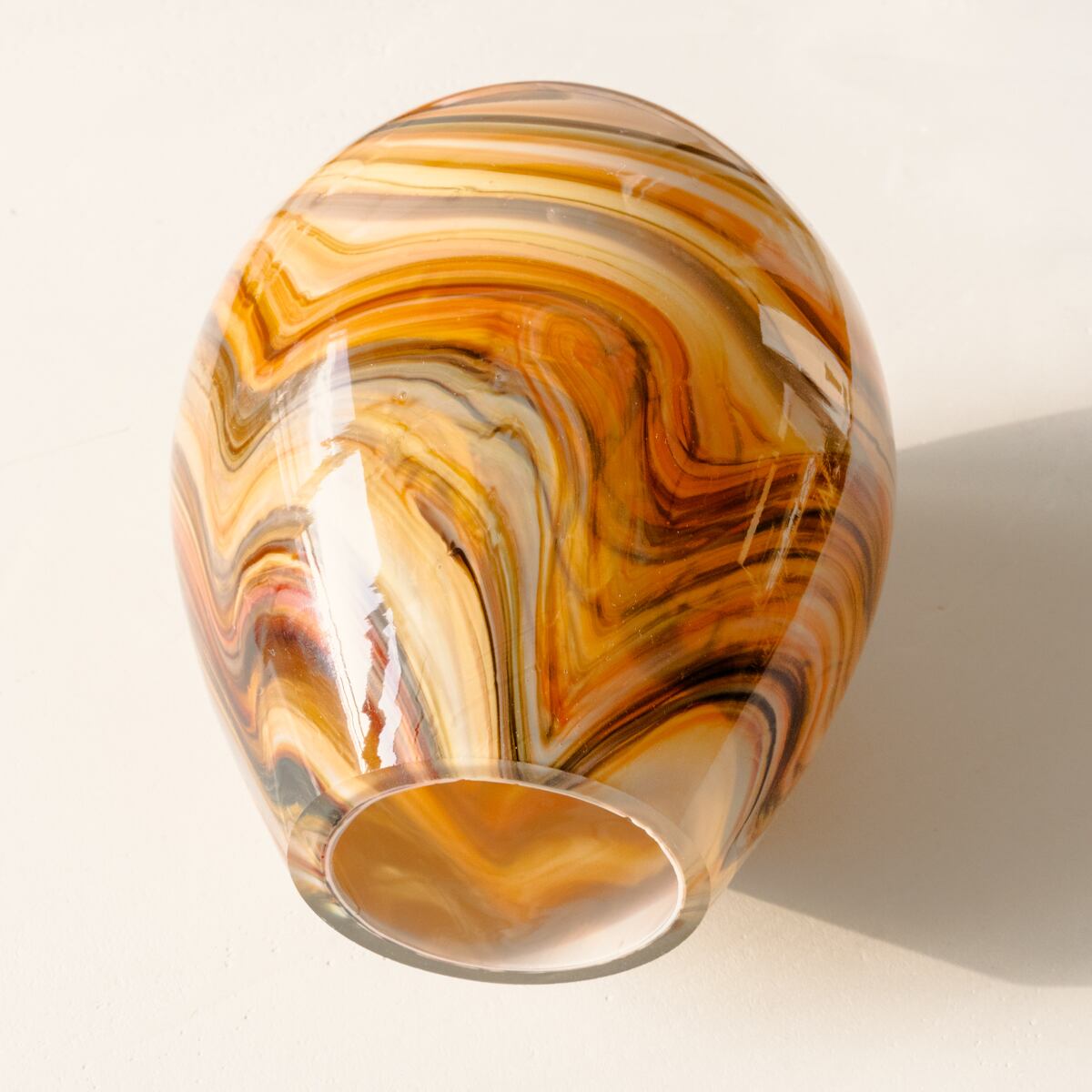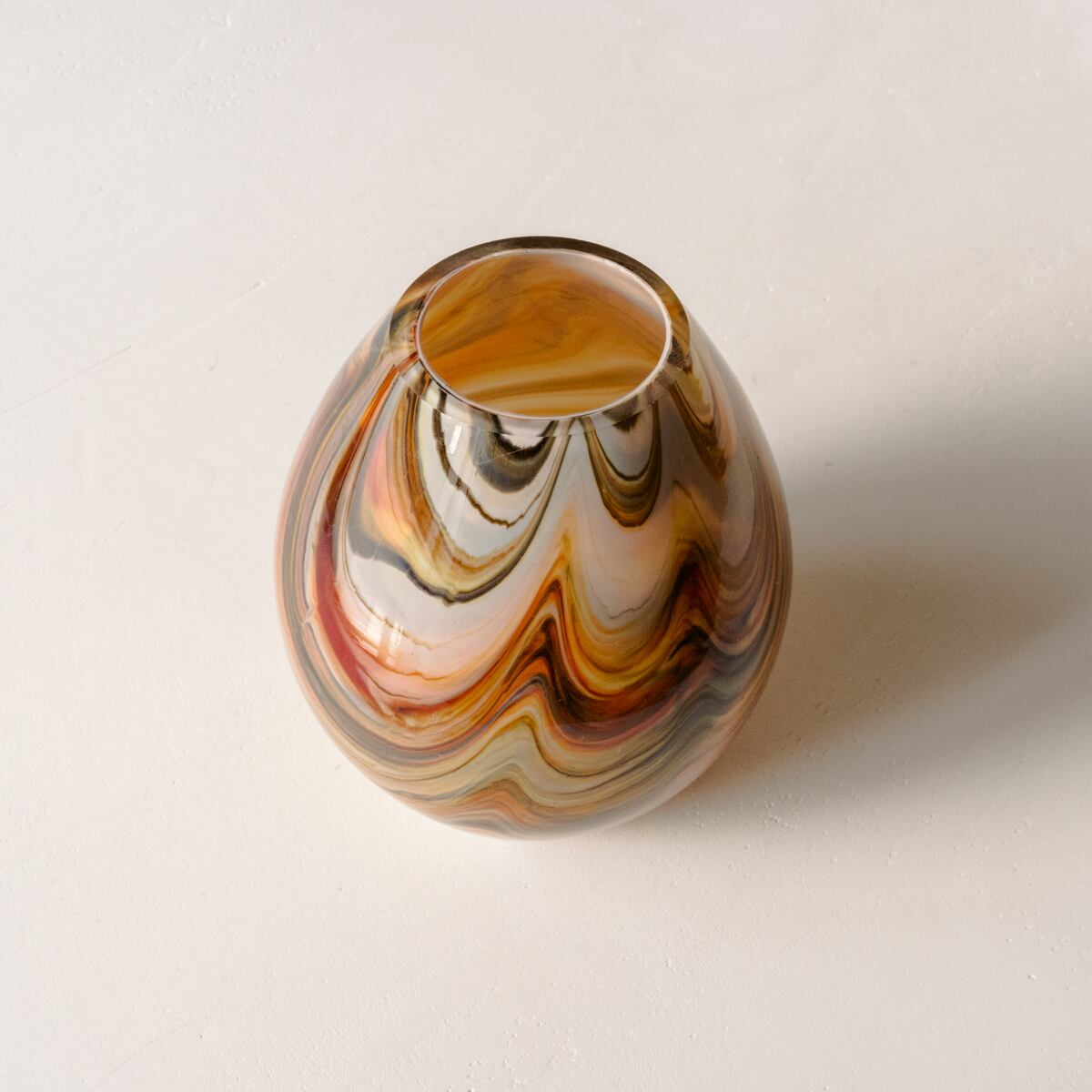 すっきりと美しい卵型のデザインで、オレンジ、ブラウン、ホワイト、イエロー、レッドなど、さまざまな色が入り混じったマーブル模様で彩られています。